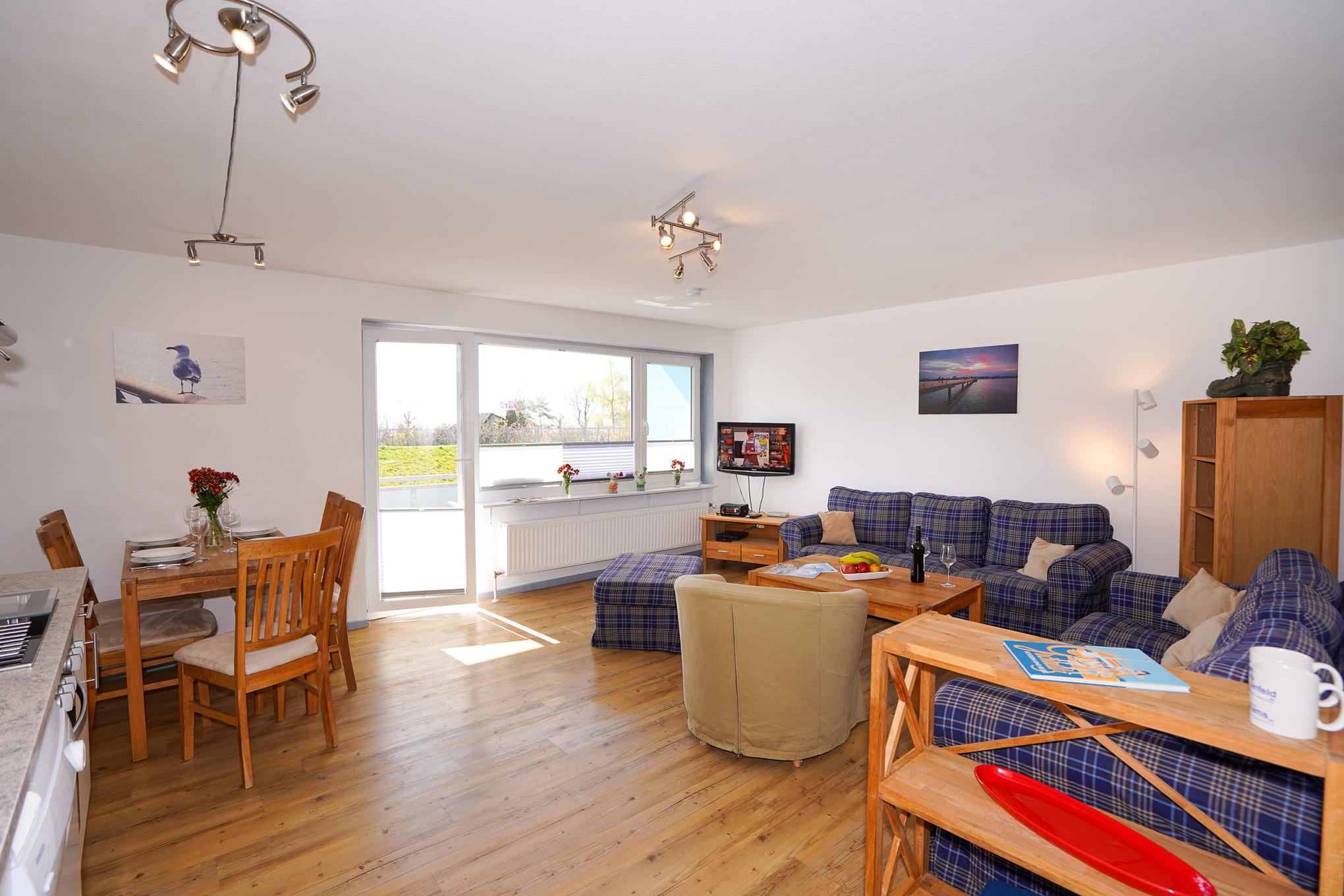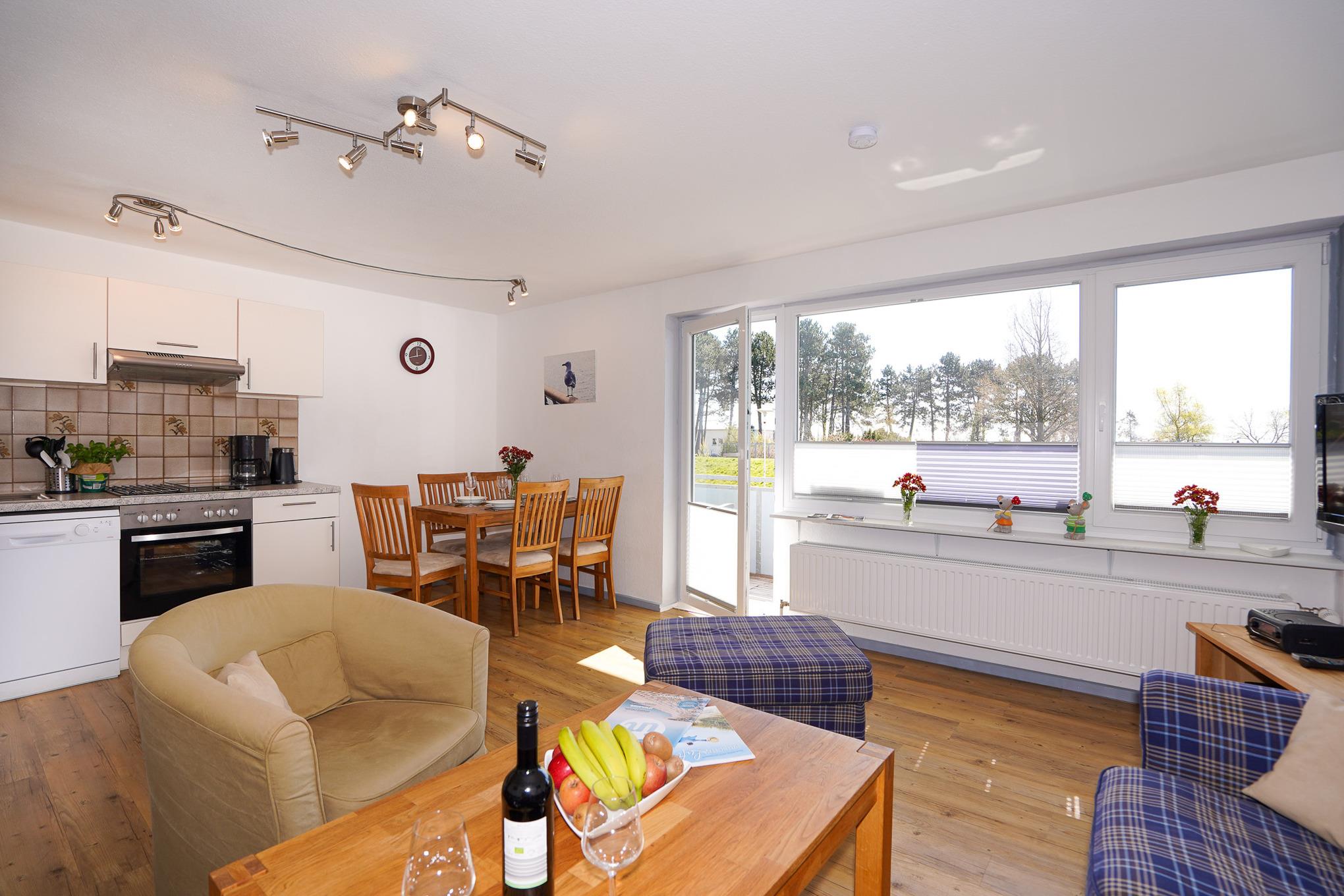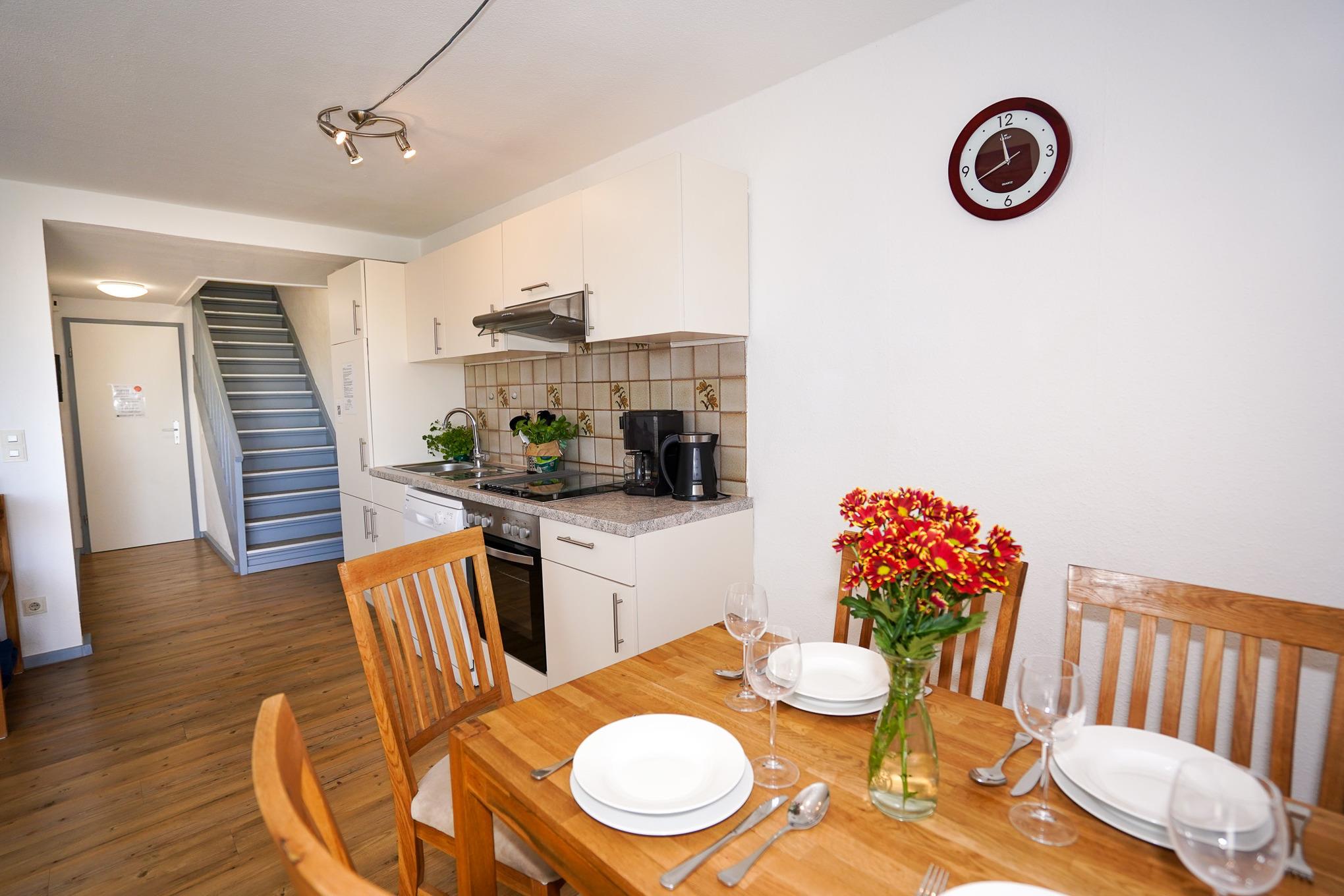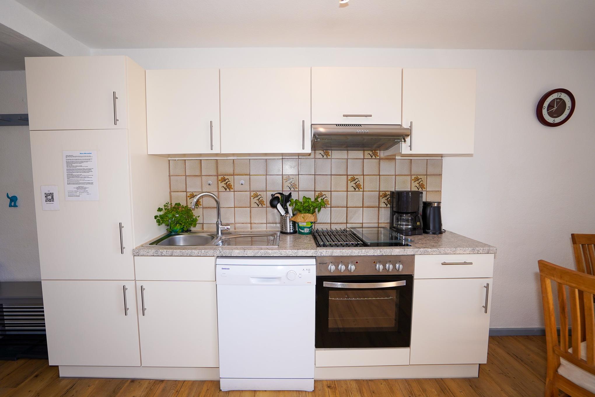 Die modern ausgestattete Nichtraucherwohnung mit einer Größe von ca. 75 qm ist für bis zu 5 Personen eingerichtet. Im Wohnzimmer mit SAT-TV befindet sich eine großzügige Sitzecke bestend aus zwei Sofas und einem Sessel, sowie ein Esstisch mit Stühlen. In der Küchenzeile finden Sie neben einem 4-Platten Kochfeld mit Backofen und den üblichen Elektrogeräten auch eine Spülmaschine und eine Mikrowelle vor.