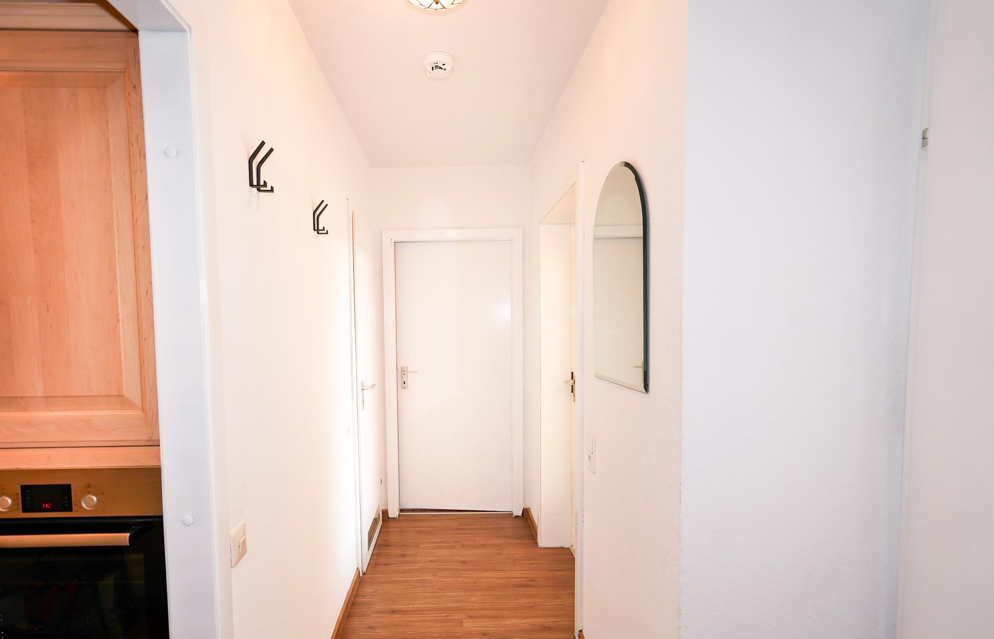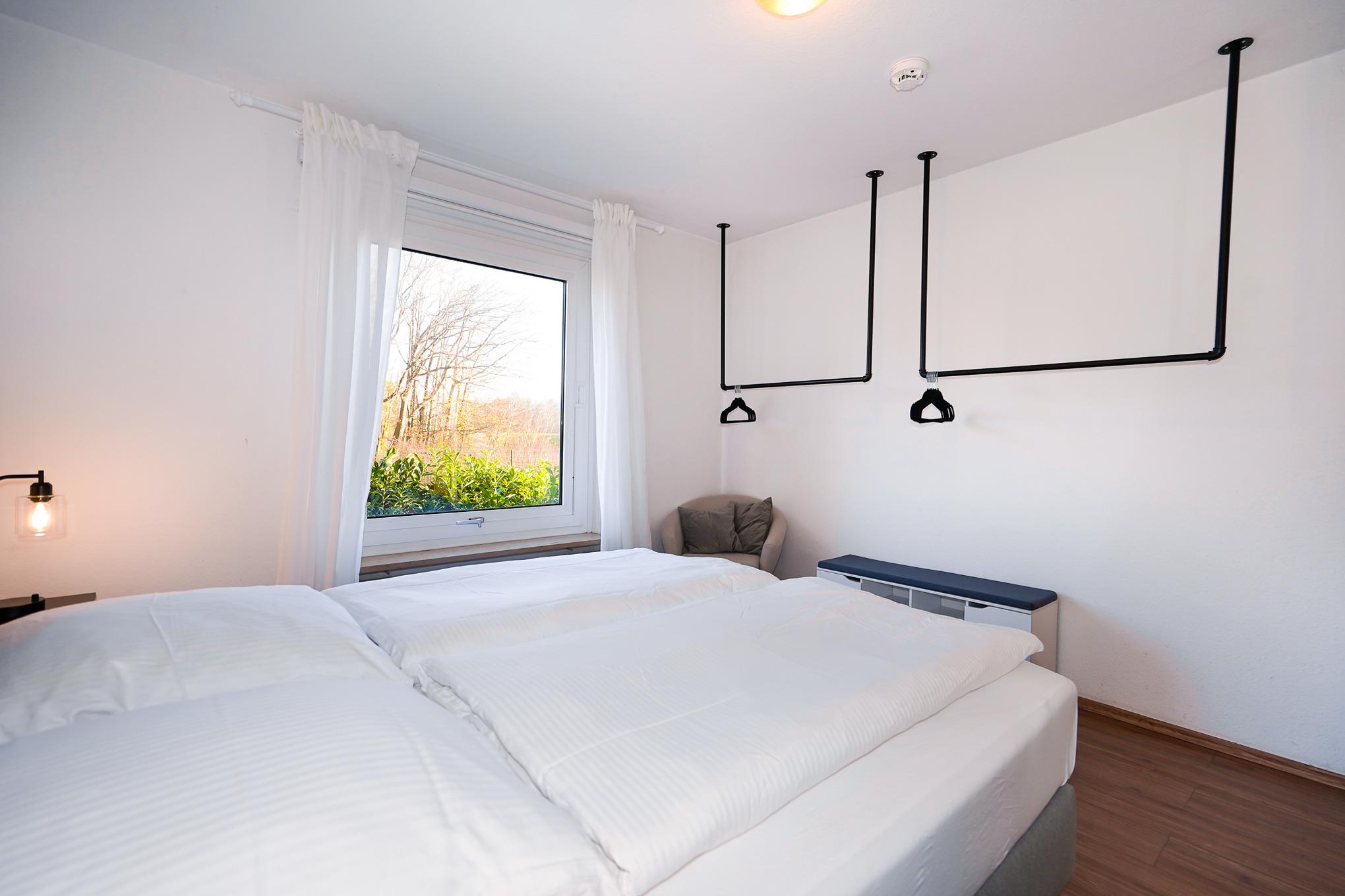 Das Badezimmer verfügt über WC, Waschbecken, Eckdusche, Handtuchheizkörper und viele Ablagemöglichkeiten. Das Schlafzimmer bietet Ihnen ein Boxspringbett (180 x 200 cm), Schubladenschränke und zwei Nachttische.