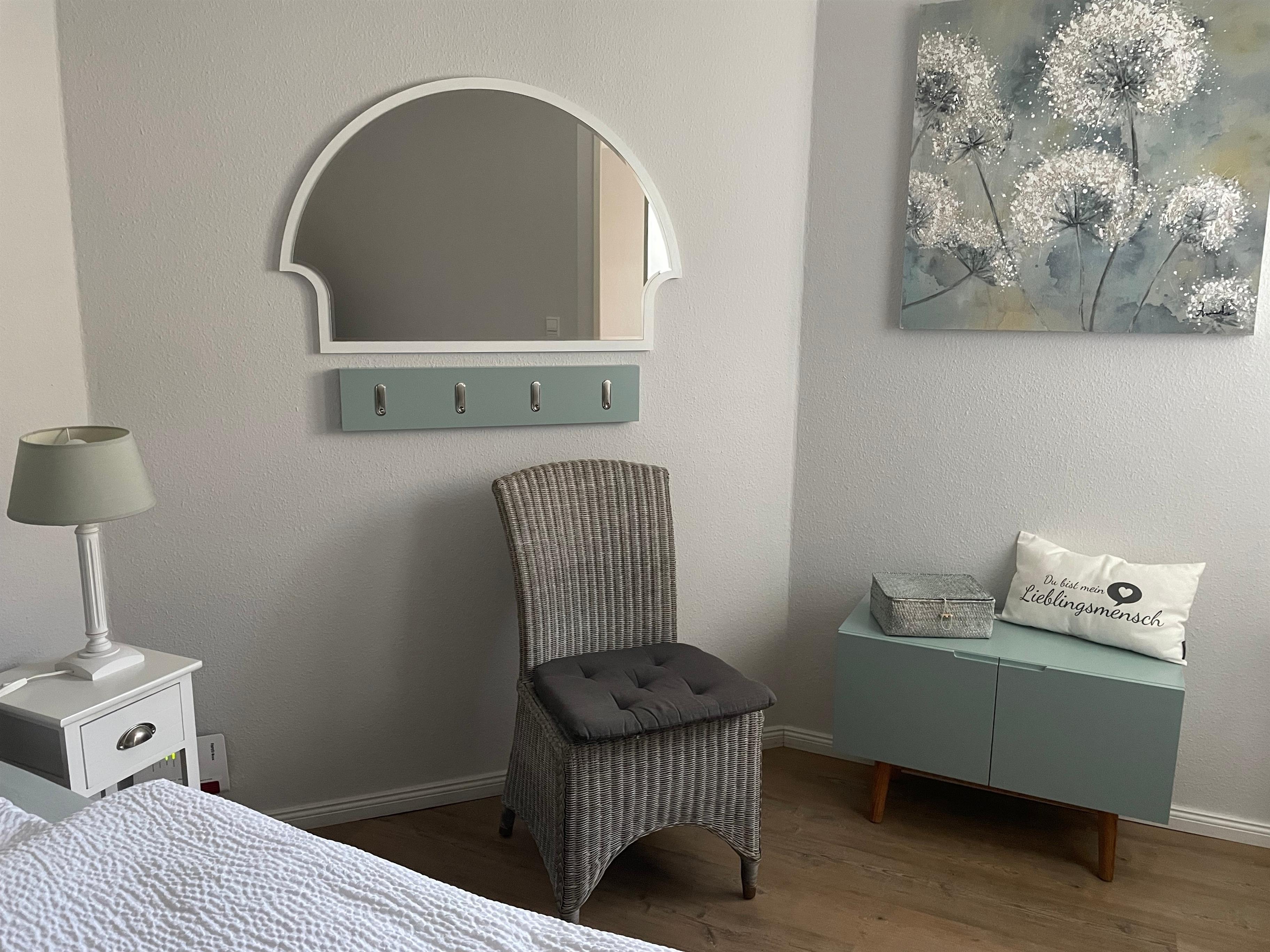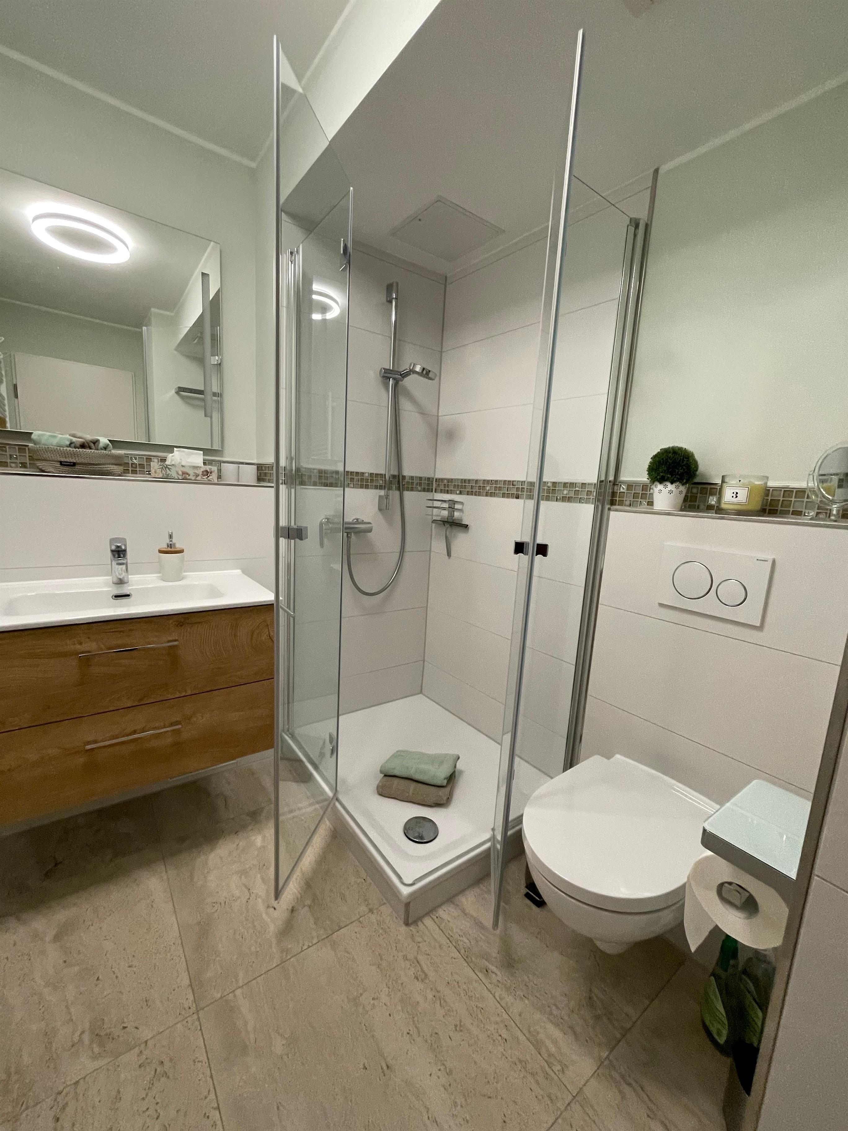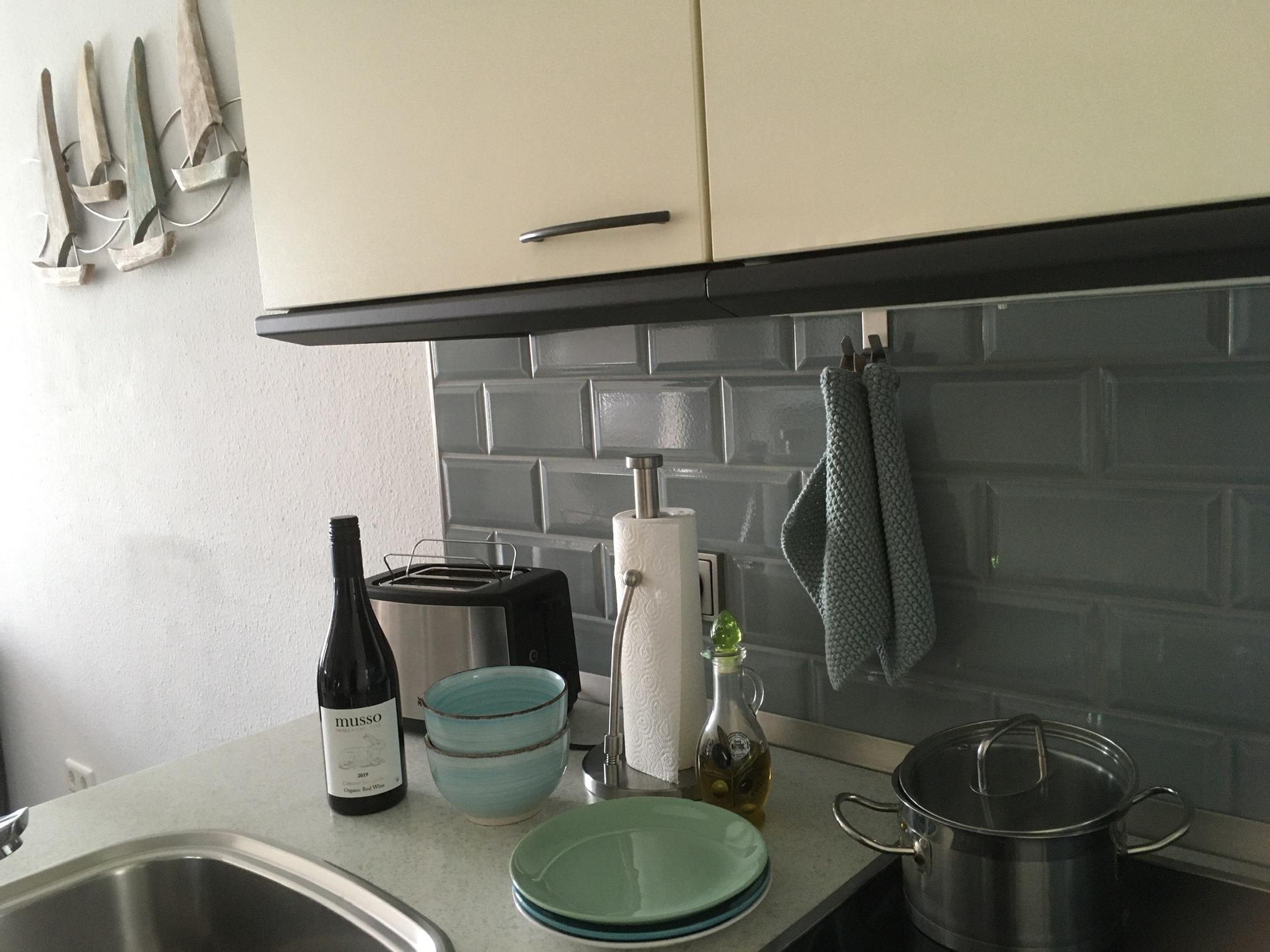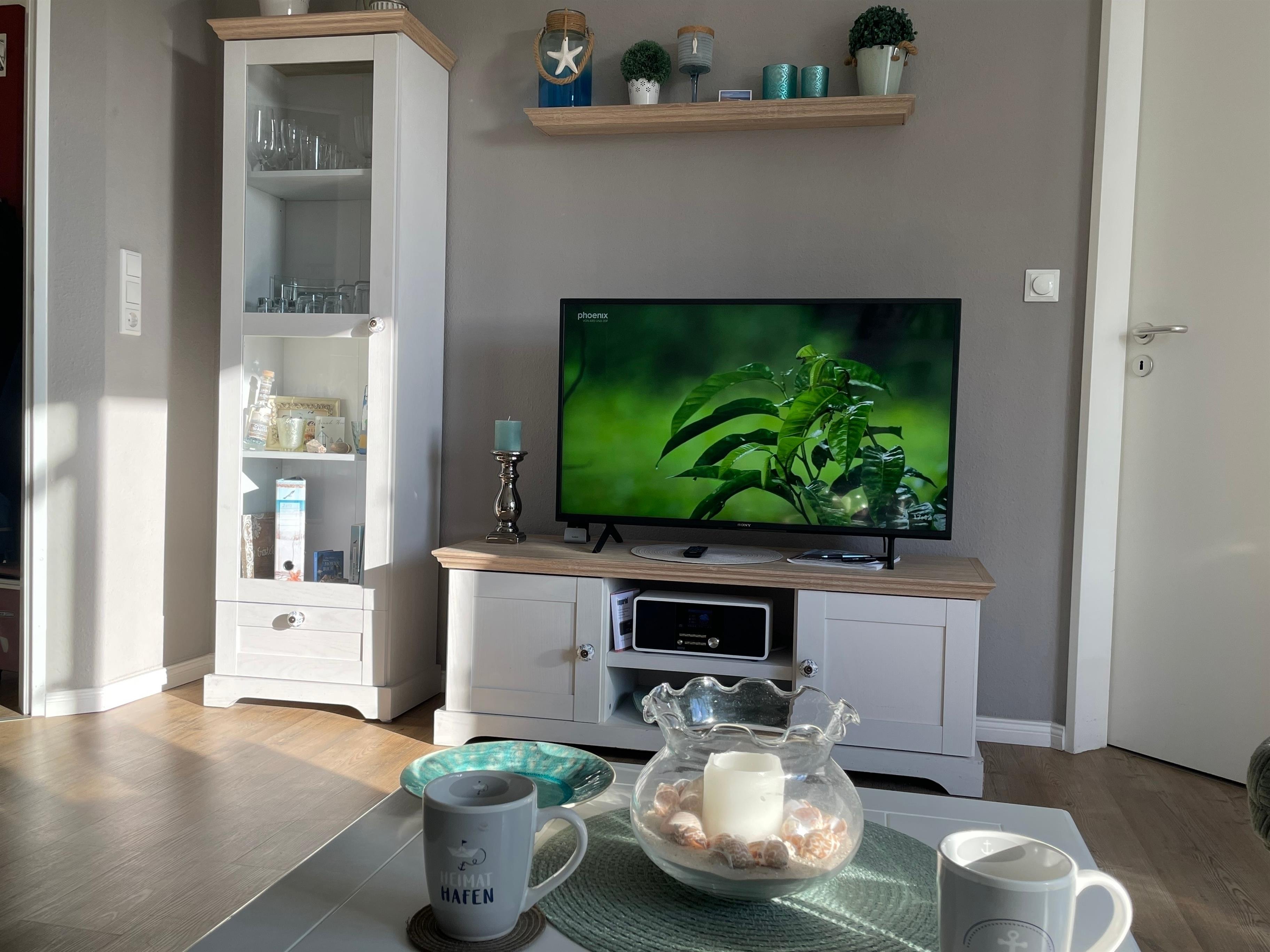 Der Wohnbereich ist mit einer gemütlichen Couch (Schlaffunktion, Dauerschläfer Qualität) versehen, ein Fernseher ist vorhanden - von hier aus haben Sie Zugang zum möblierten und windgeschützten Balkon. Hier können Sie von mittags bis spät abends die Sonne in vollen Zügen genießen. Im Wohn- / Esszimmer befindet sich ebenfalls die Küchenzeile mit Essplatz. Die kleine Küche ist u.a. mit Backofen, 4-Plattenherd, Kaffeemaschine und weiteren Küchengeräten versehen, auch etwas Öl, Pfeffer/Salz und weitere Küchenprodukte stehen bereits für Sie bereit. Das separate Schlafzimmer ist mit einem Boxspringbett und einem großen Kleiderschrank versehen. Ein weiterer Schrank befindet sich im Flur. Das Badezimmer verfügt über eine Dusche und WC.