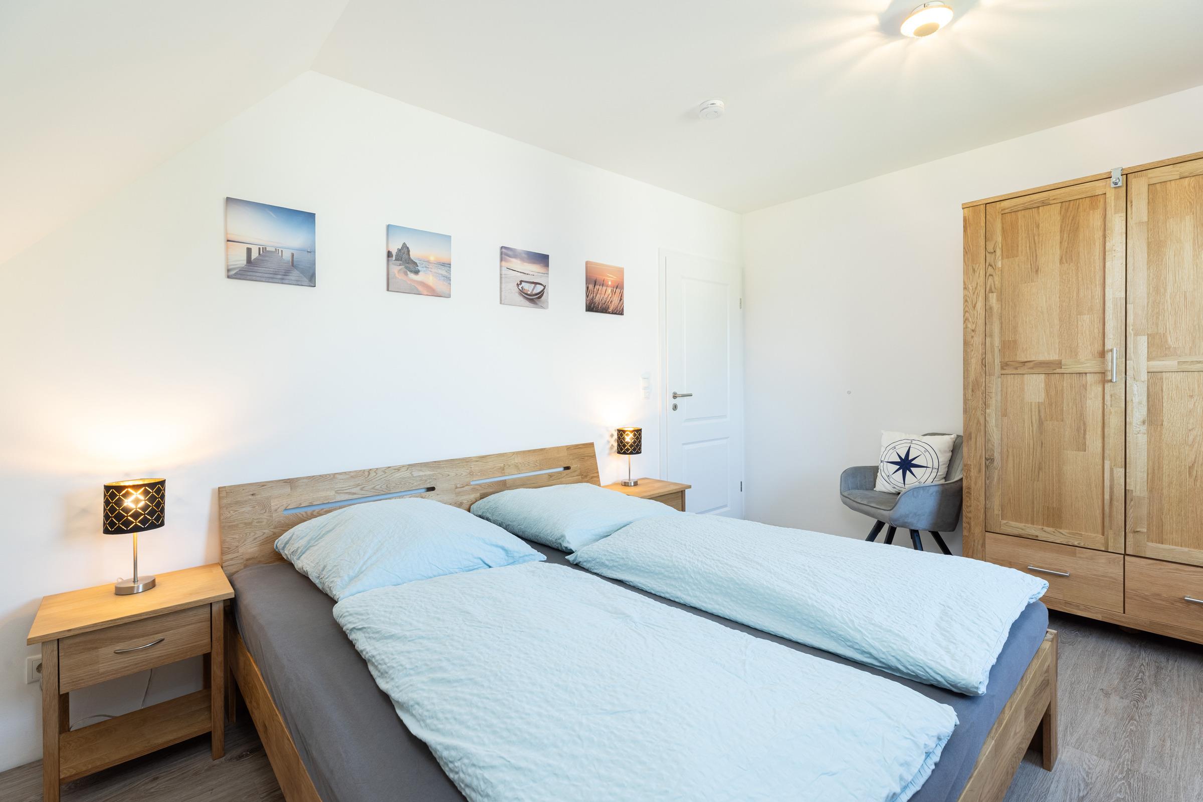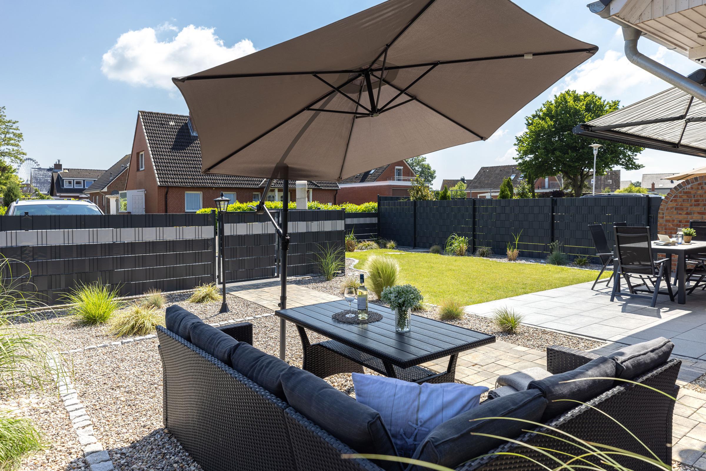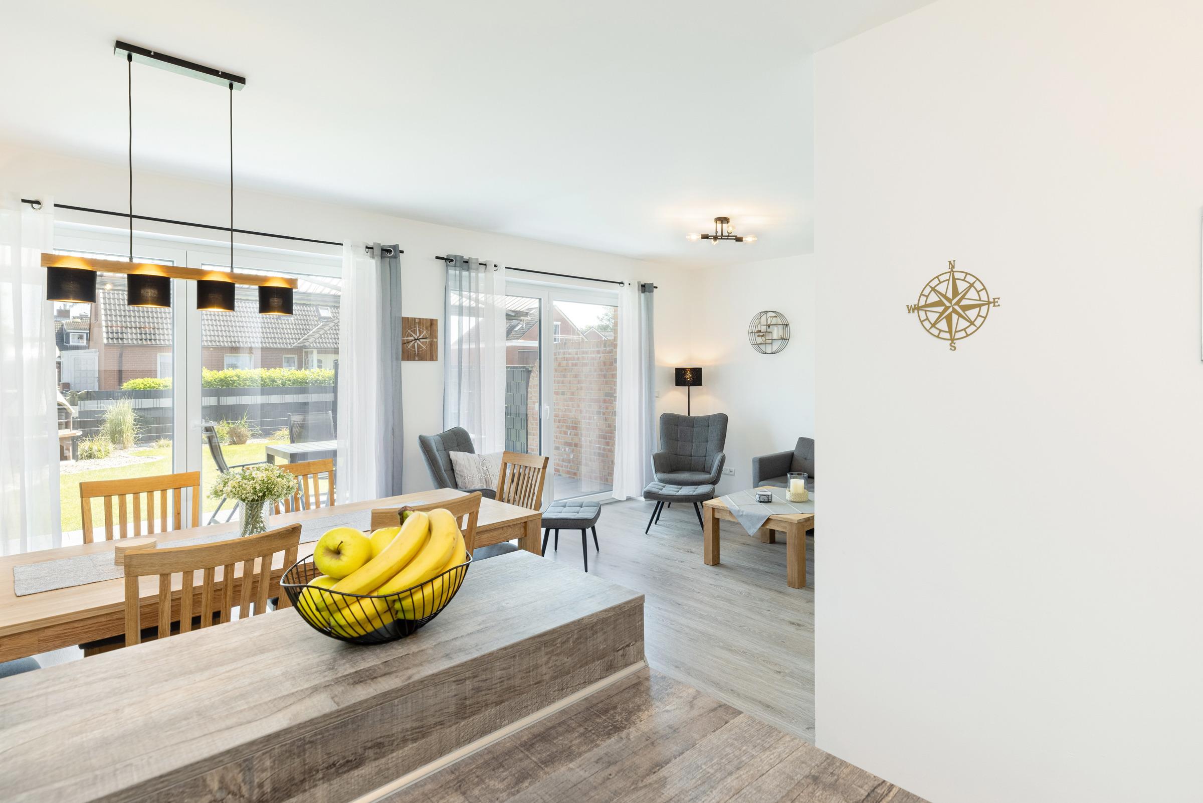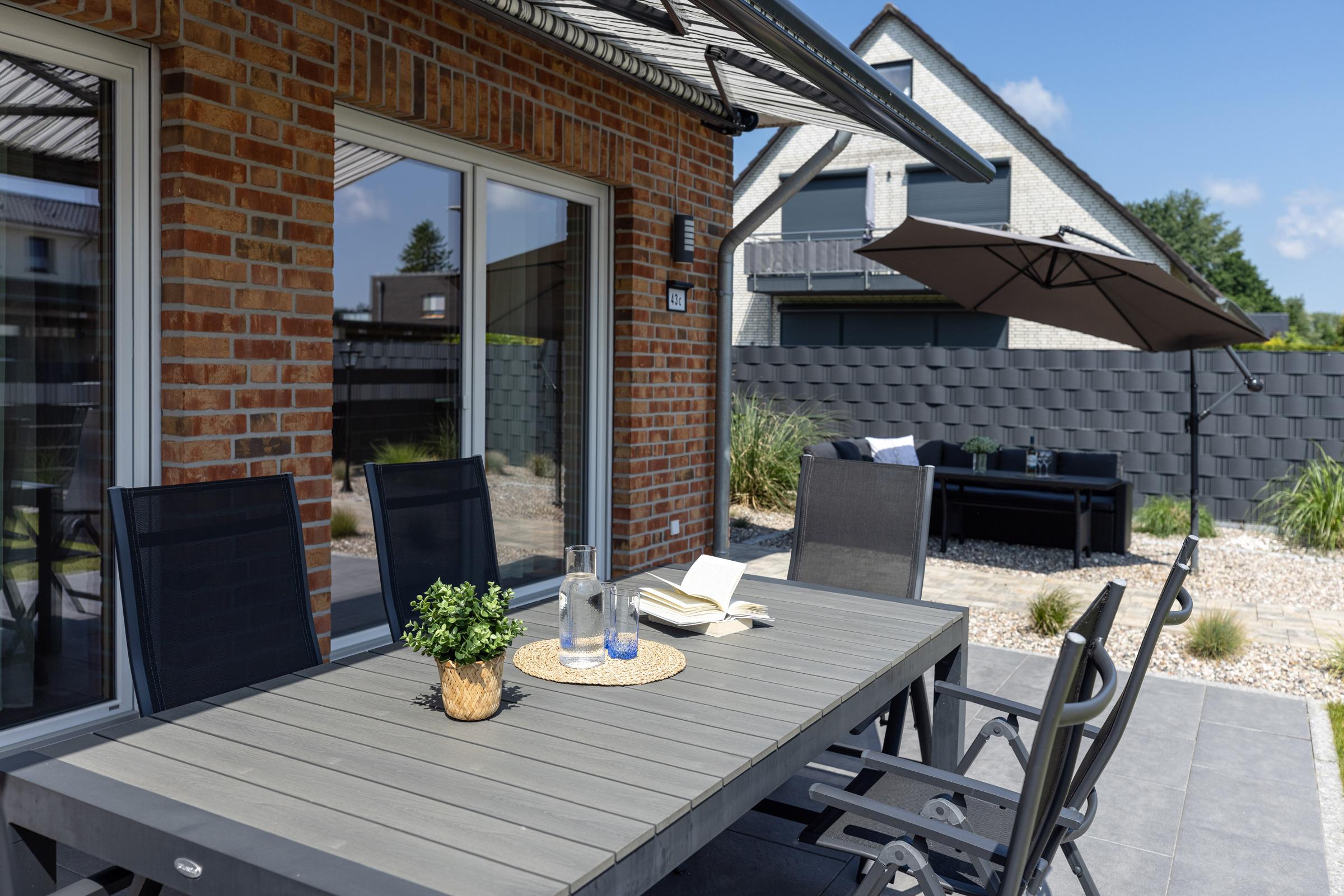 Dieses 5-Zimmer-Ferienhaus bietet Platz für bis zu 6 Personen (plus Kleinkind) auf 126 m². Im Erdgeschoss findest du einen offenen Wohnbereich mit Smart-TV, eine voll ausgestattete offene Komfort-Küche, einen großzügigen Essbereich und eine 20 m² große Südterrasse mit Grillmöglichkeit mit Markise und Lounge-Ecke mit Sonnenschirm. Ein modernes Tageslicht-Bad mit bodengleicher Dusche rundet das Erdgeschoss ab. Im Hauswirtschaftsraum befindet sich ein Waschtrockner, damit die Urlaubsgarderobe immer frisch bleibt.