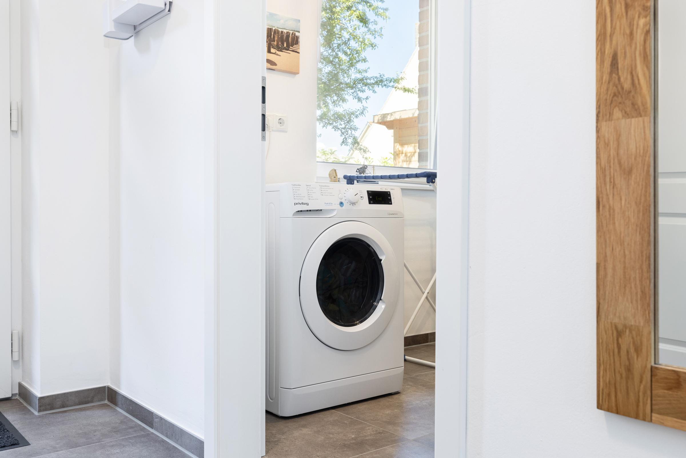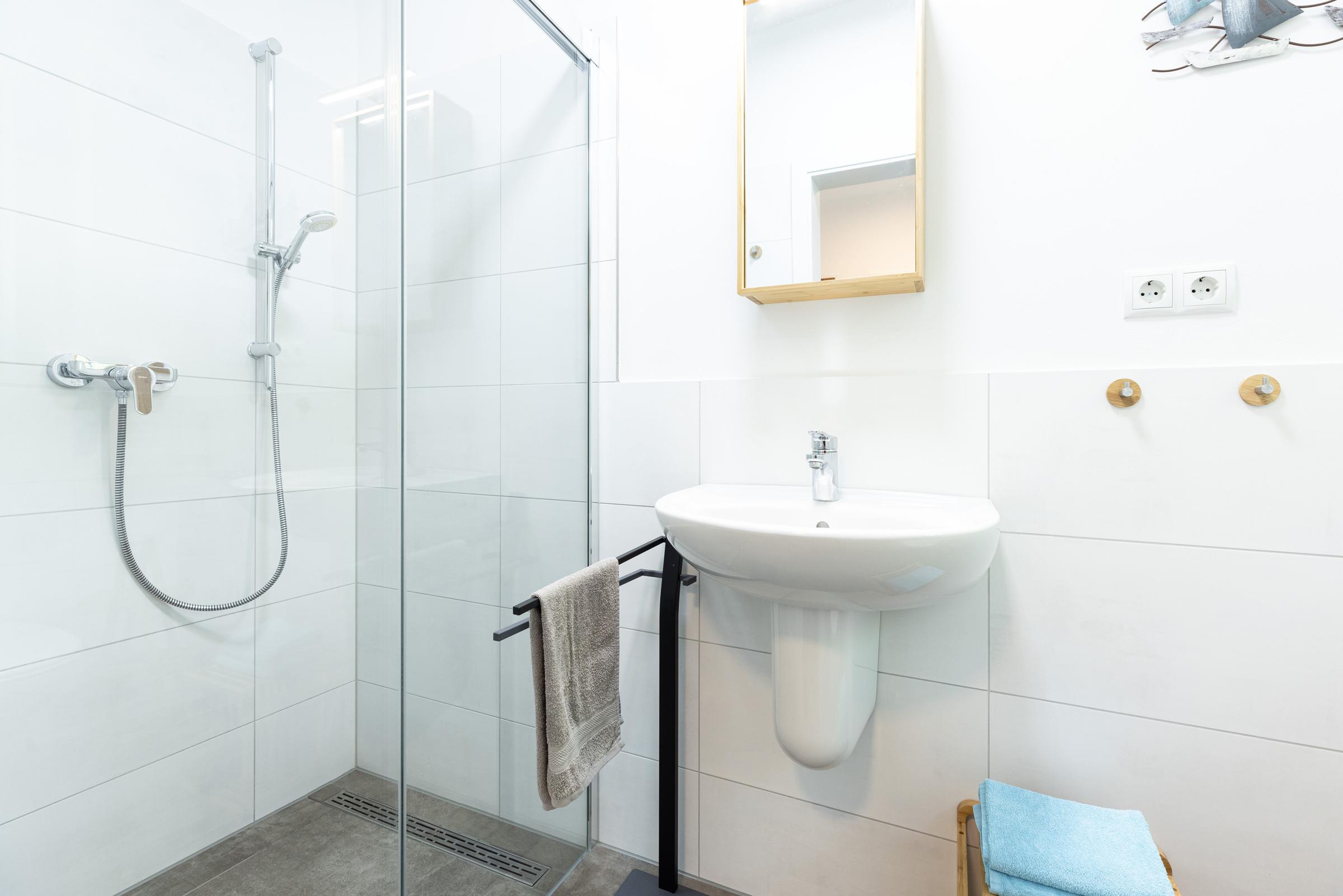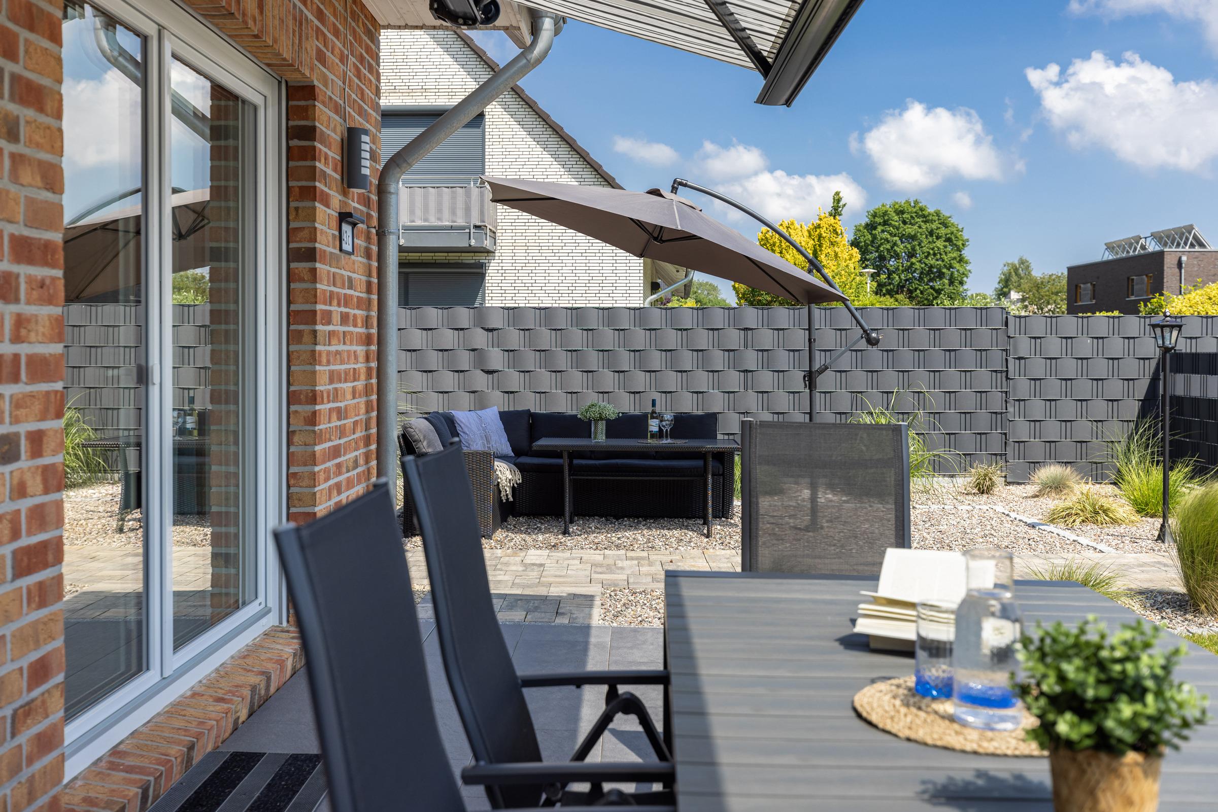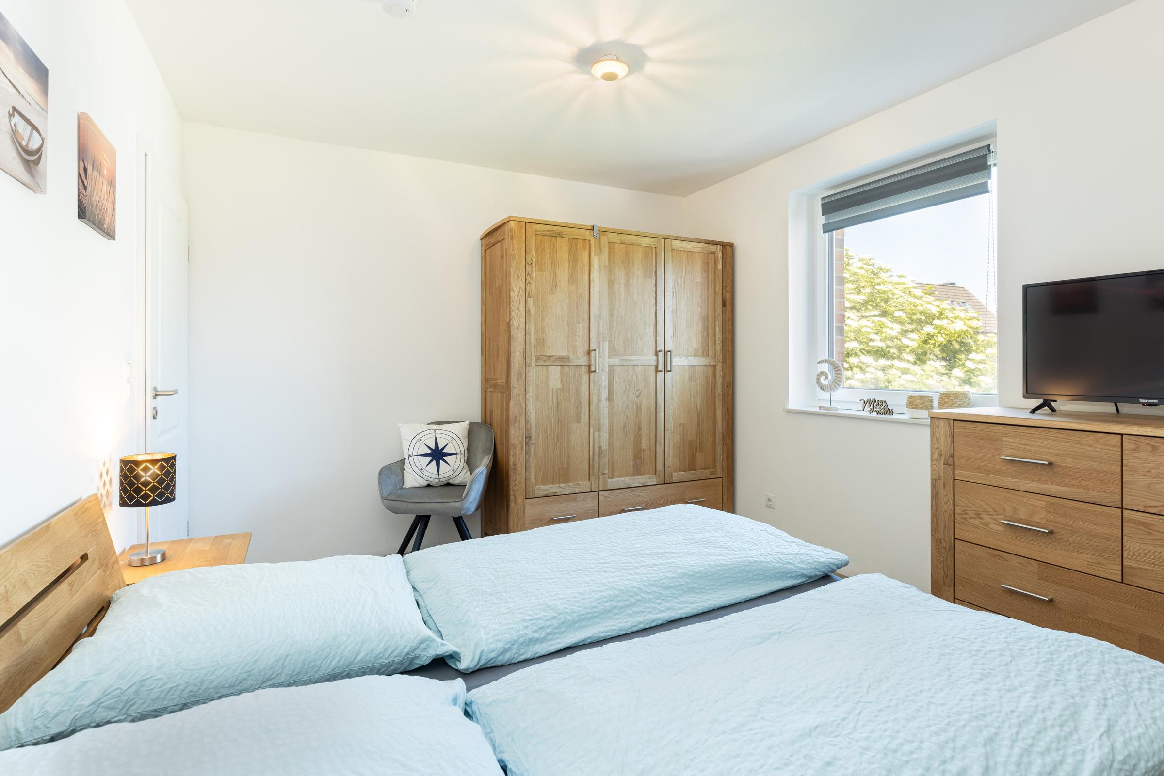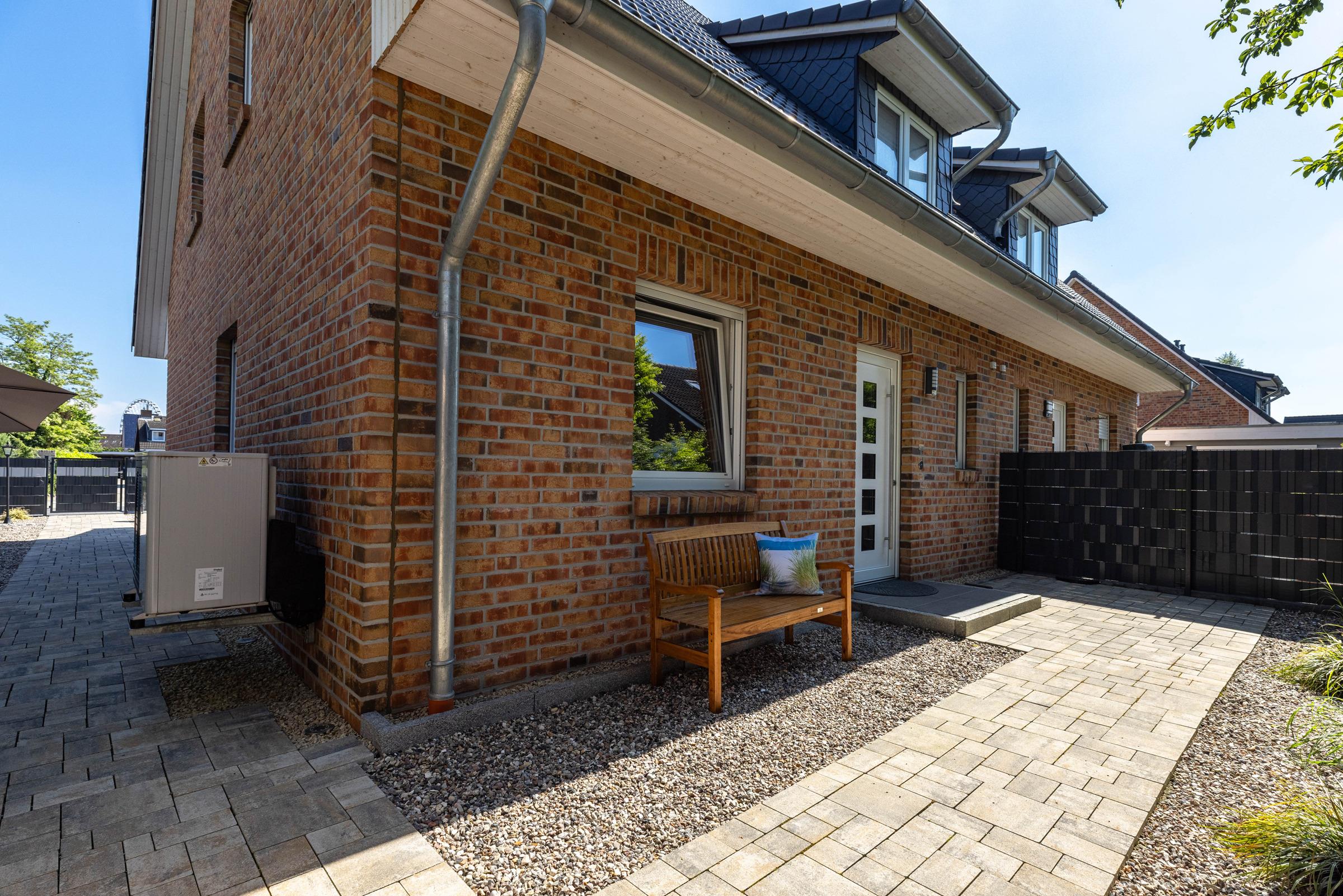 Dieses 5-Zimmer-Ferienhaus bietet Platz für bis zu 6 Personen (plus Kleinkind) auf 126 m². Im Erdgeschoss findest du einen offenen Wohnbereich mit Smart-TV, eine voll ausgestattete offene Komfort-Küche, einen großzügigen Essbereich und eine 20 m² große Südterrasse mit Grillmöglichkeit mit Markise und Lounge-Ecke mit Sonnenschirm. Ein modernes Tageslicht-Bad mit bodengleicher Dusche rundet das Erdgeschoss ab. Im Hauswirtschaftsraum befindet sich ein Waschtrockner, damit die Urlaubsgarderobe immer frisch bleibt.