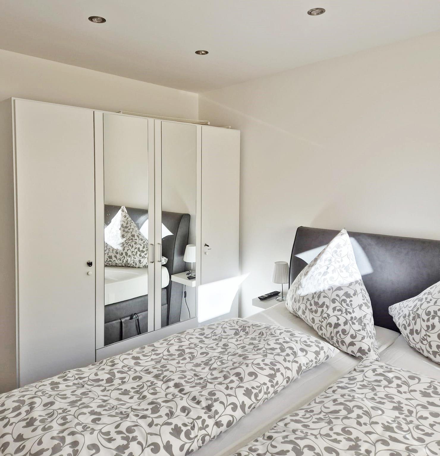 Das größere Schlafzimmer ist mit einem hochwertigen Boxspringbett (160x200cm), einem Kleiderschrank und einem TV eingerichtet. Im kleineren Schlafzimmer findet man ein Bett in der Größe von 90x200cm und einen kleinen Kleiderschrank mit TV. Das Badezimmer ist mit einer Dusche, einem Waschbecken sowie einem WC ausgestattet. Eine Handtuchheizung sorgt für angenehme Wärme. Alle Fenster sind mit Außenjalousien versehen.
