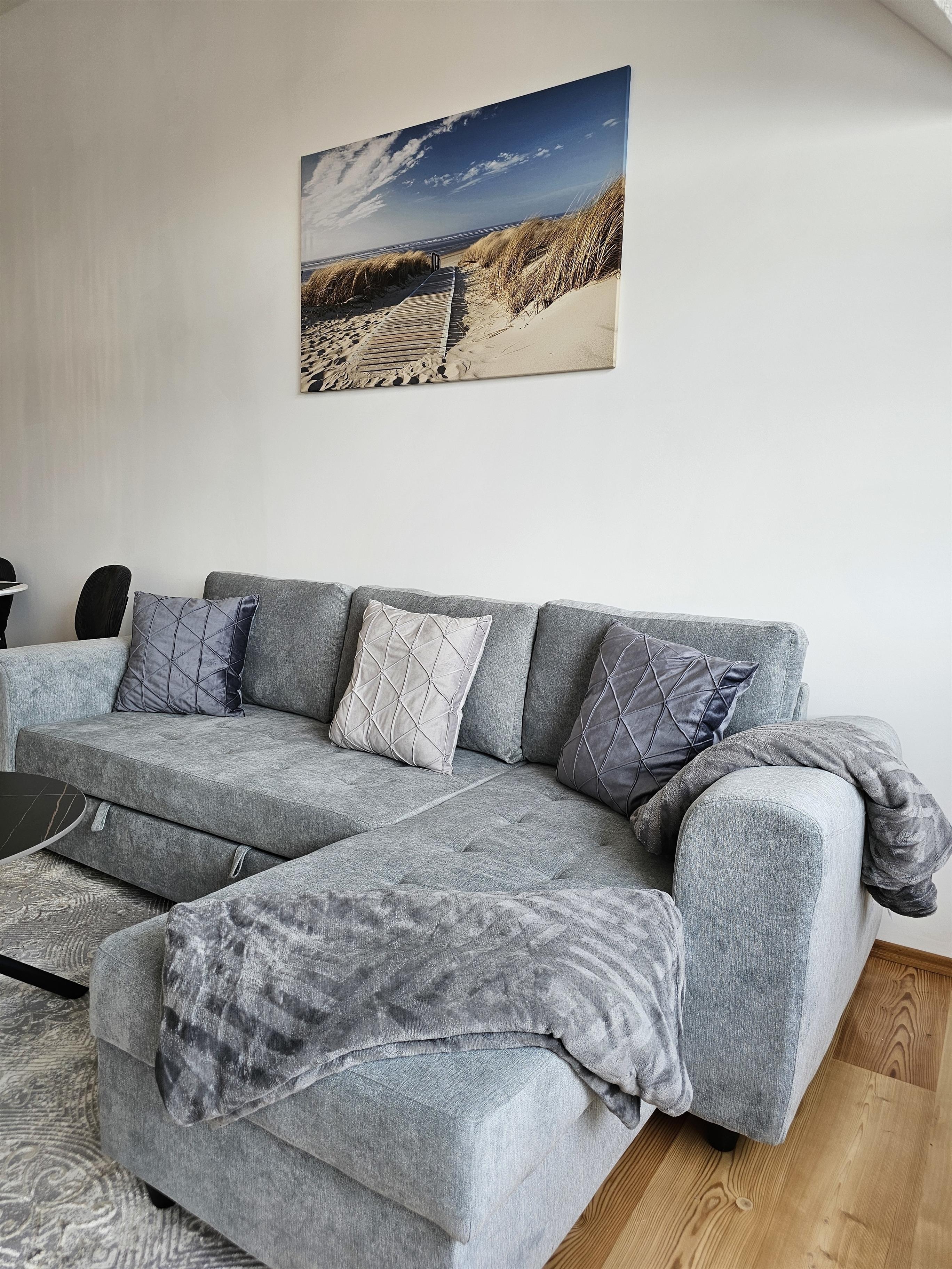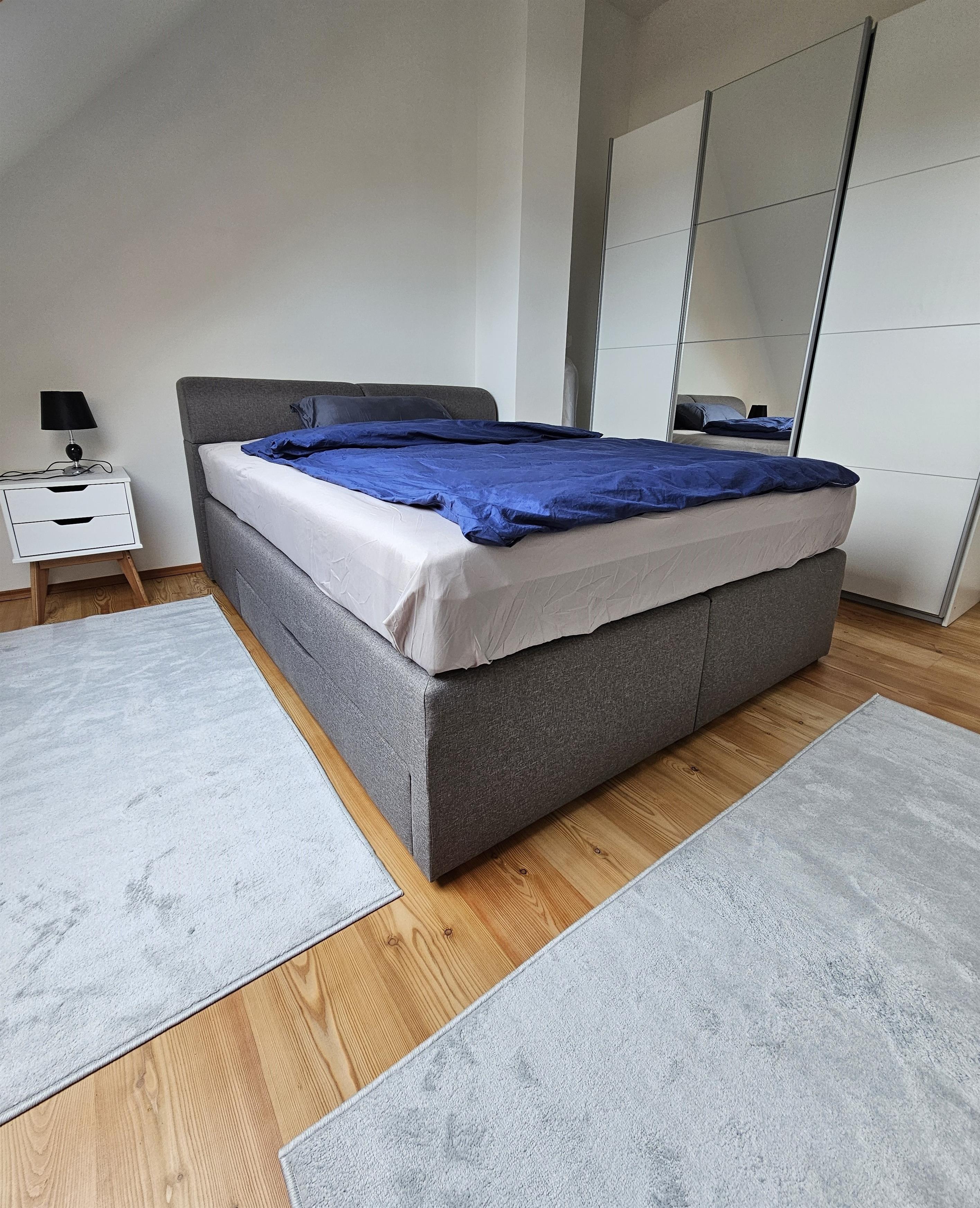 Das Schlafzimmer ist mit einem komfortablen Boxspringbett (1,60 x 2,00 m) und einem großen Schrank ausgestattet, sodass Sie sich wie zu Hause fühlen können. Im Wohnzimmer finden Sie eine Schlafcouch für 2 Personen, die mit einem separaten Topper (1,60 x 2,00 m) für zusätzlichen Schlafkomfort sorgt.