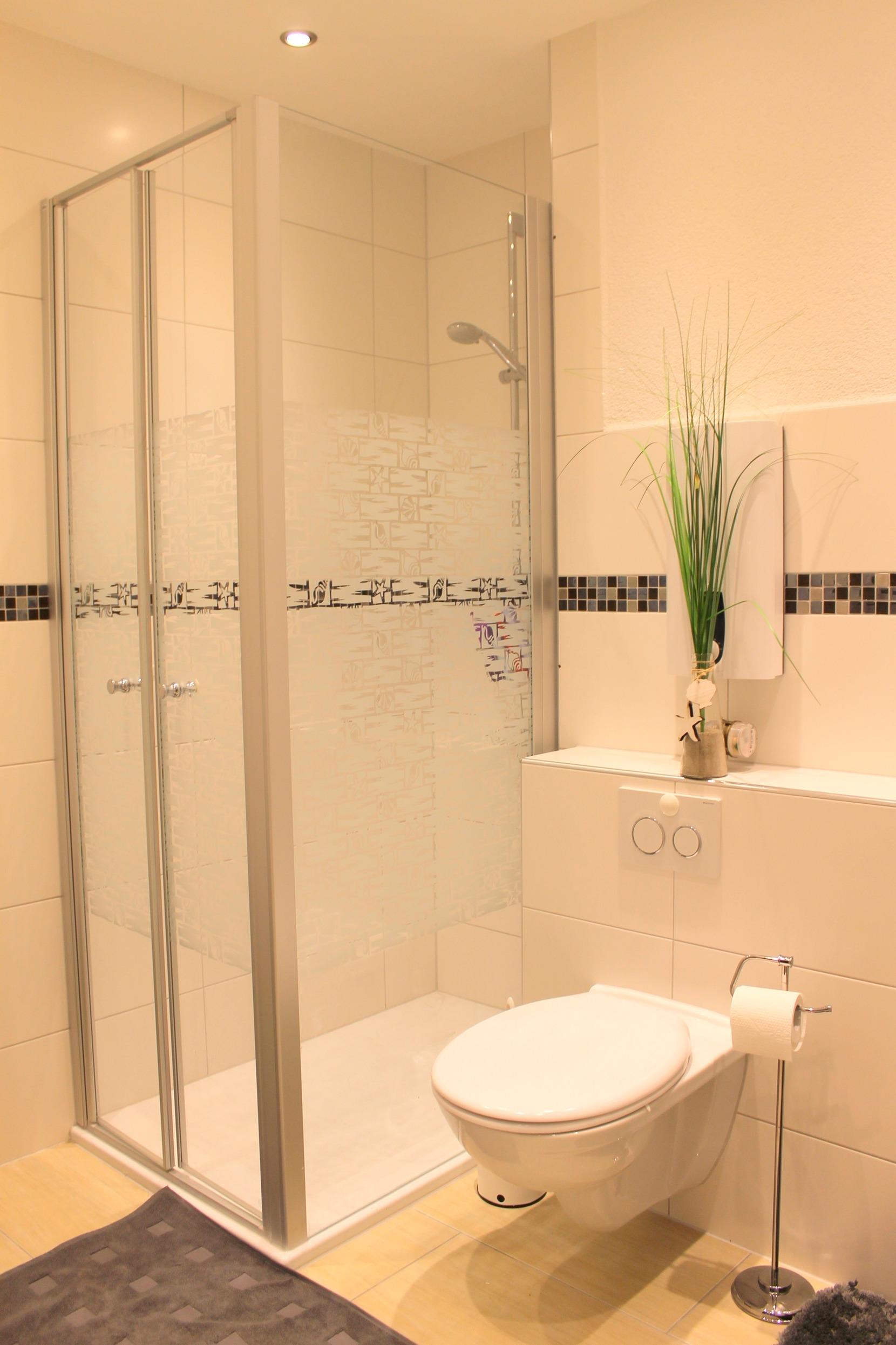 Modernes Bad mit Dusche, WC, Waschbecken & Handtuchheizung
