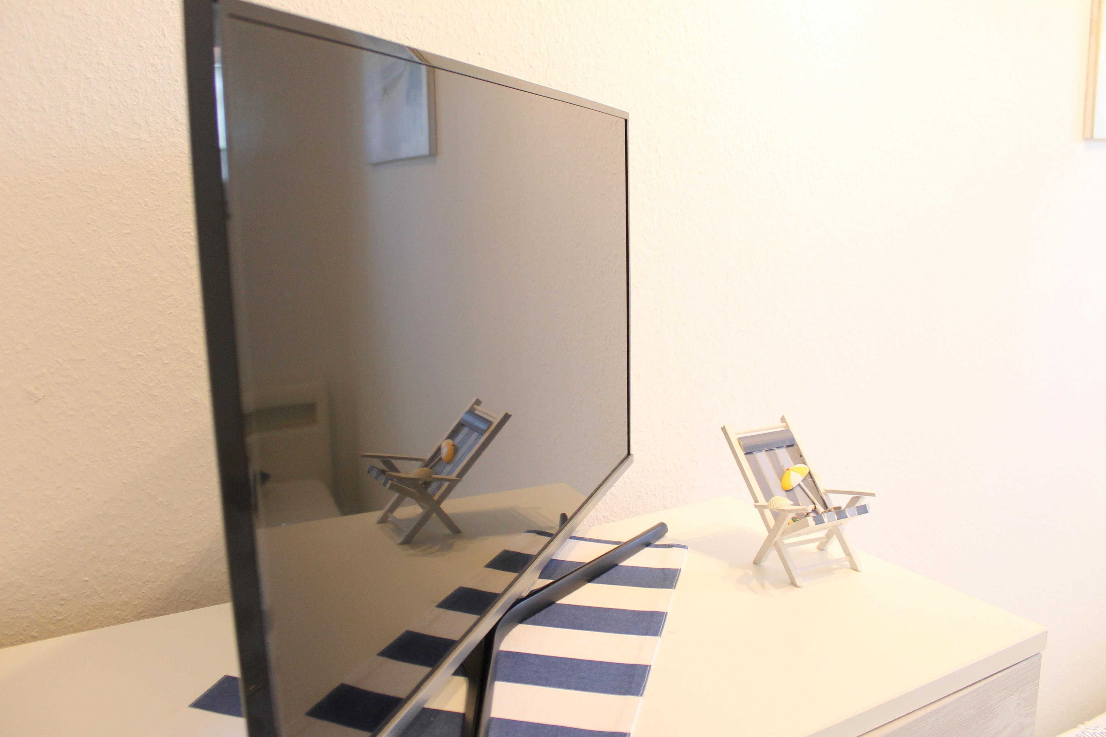 Das helle Wohnzimmer ist mit zwei Zweisitzersofas, einer Wohnwand, einem Essplatz mit vier Stühlen und einem großen Flachbild-TV ausgestattet. Ein Schlafzimmer ist mit Doppelbett (1,80 x 2 m) und großem Kleiderschrank ausgestattet, das zweite mit einem 1,40x 2 m Bett, einer kleinen Kommode und einem zweiten Fernseher. Beide Schlafzimmer sind mit einem Verdunkelungsrollo versehen. Die Küchenzeile ist im Eingangsbereich des Wohnzimmers integriert. Sie ist mit 2er Ceranfeldherd, Mikrowelle und Spülmaschine ausgestattet. Ein modernes Duschbad/WC ist vorhanden, im Flur sind Reinigungsgeräte in einem großen Schrank untergebracht. Die Wohnung verfügt über einen wind- und blickgeschützten überdachten Südbalkon mit Gartentisch und vier Stühlen sowie einem Sonnenschirm.