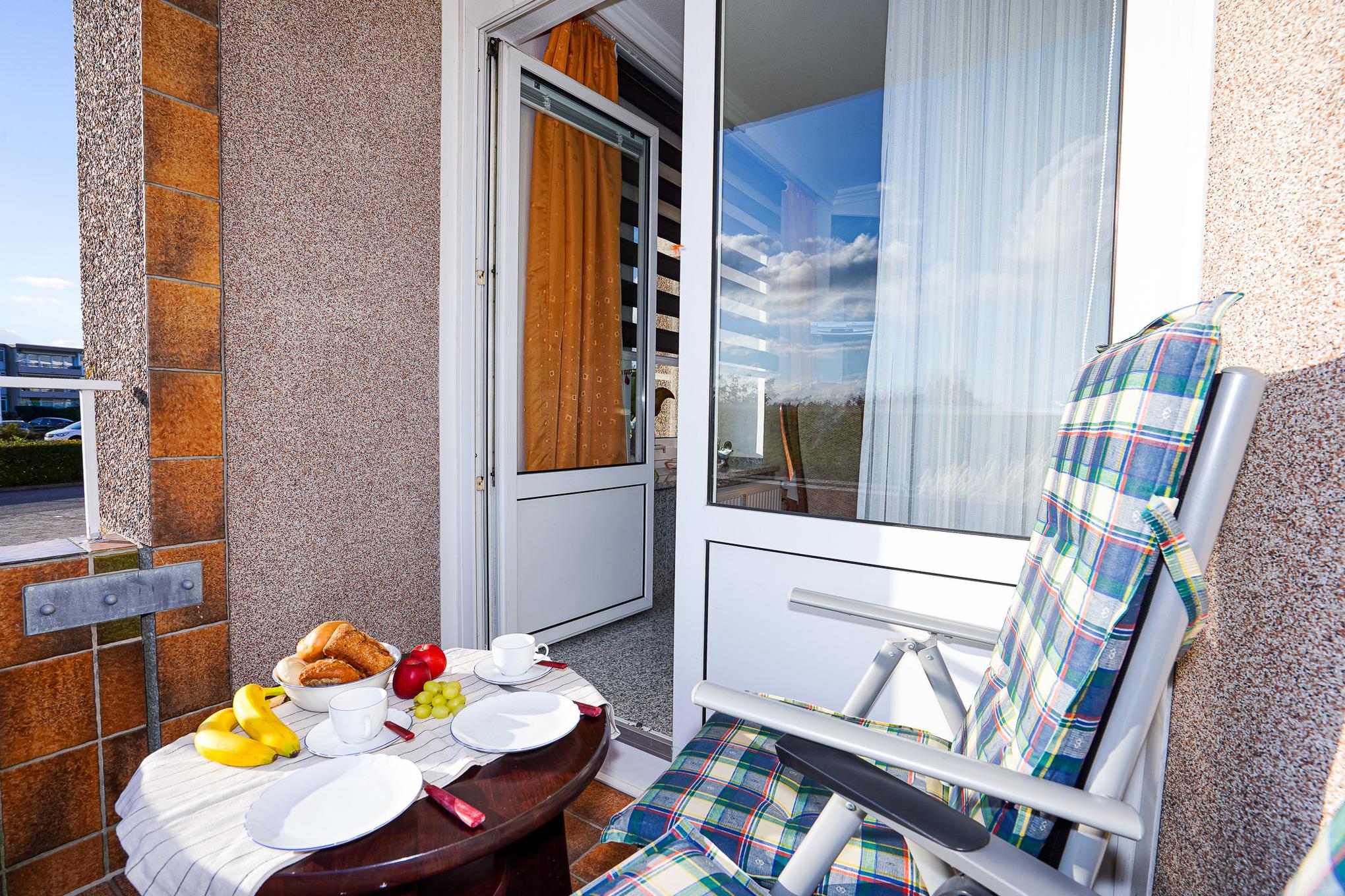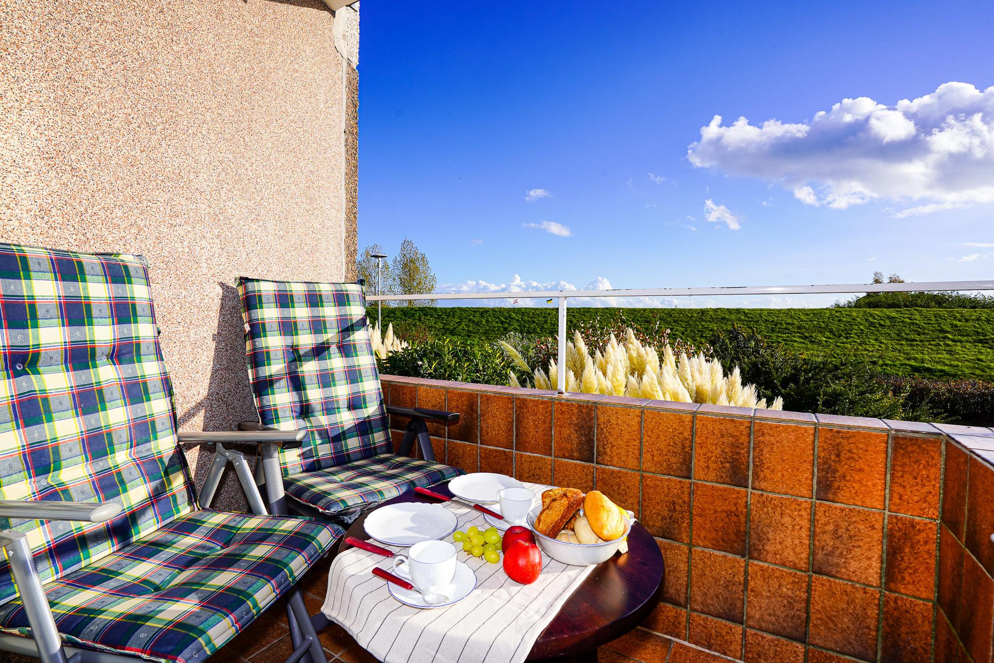 Helle 2-Zimmer-Ferienwohnung in Grömitz, direkt hinter dem Deich mit Balkon und strandnaher Lage.