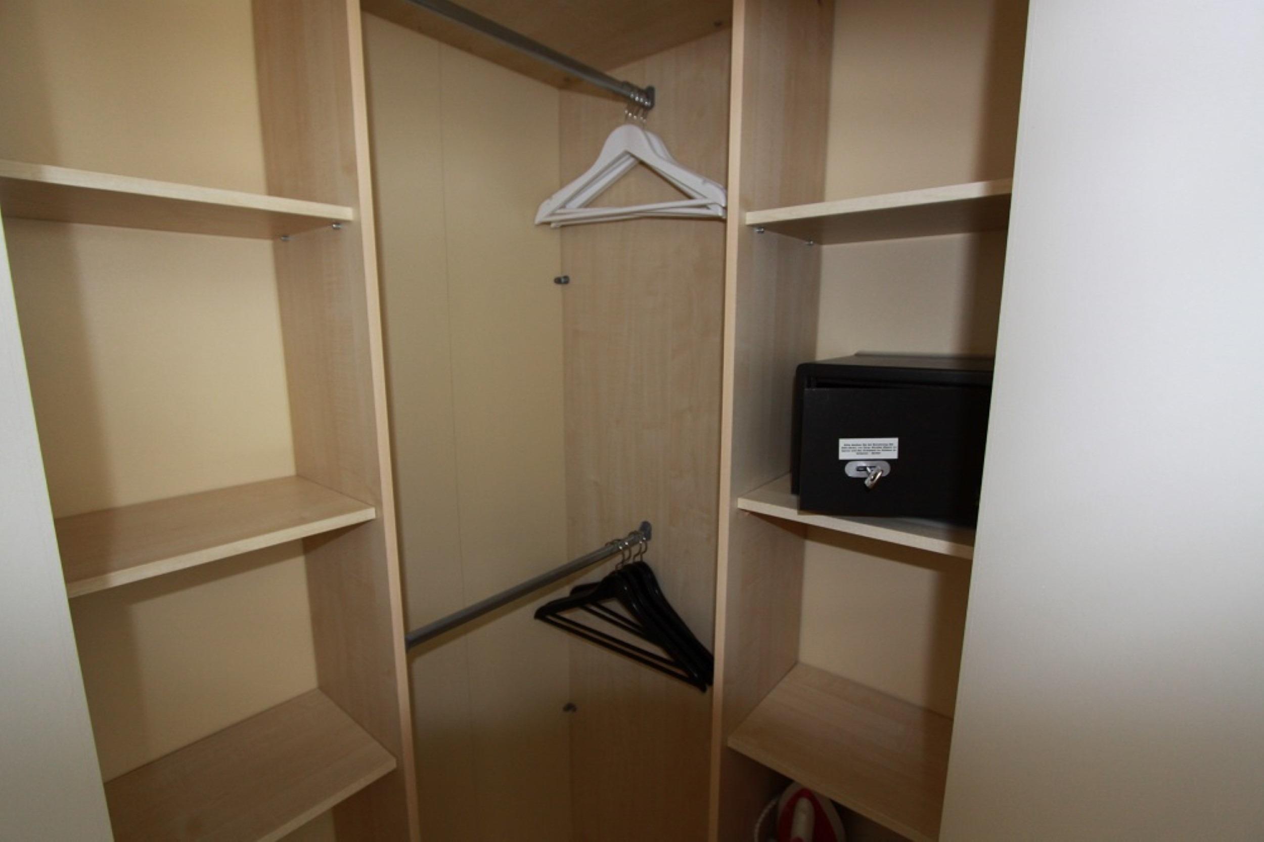 Das separate Schlafzimmer grenzt an den Wohnbereich an und bietet neben zwei Einzelbetten (90x200cm) einen großen Kleiderschrank mit Safe, einen weiteren Fernseher und einen Schreibtisch mit Stuhl.
