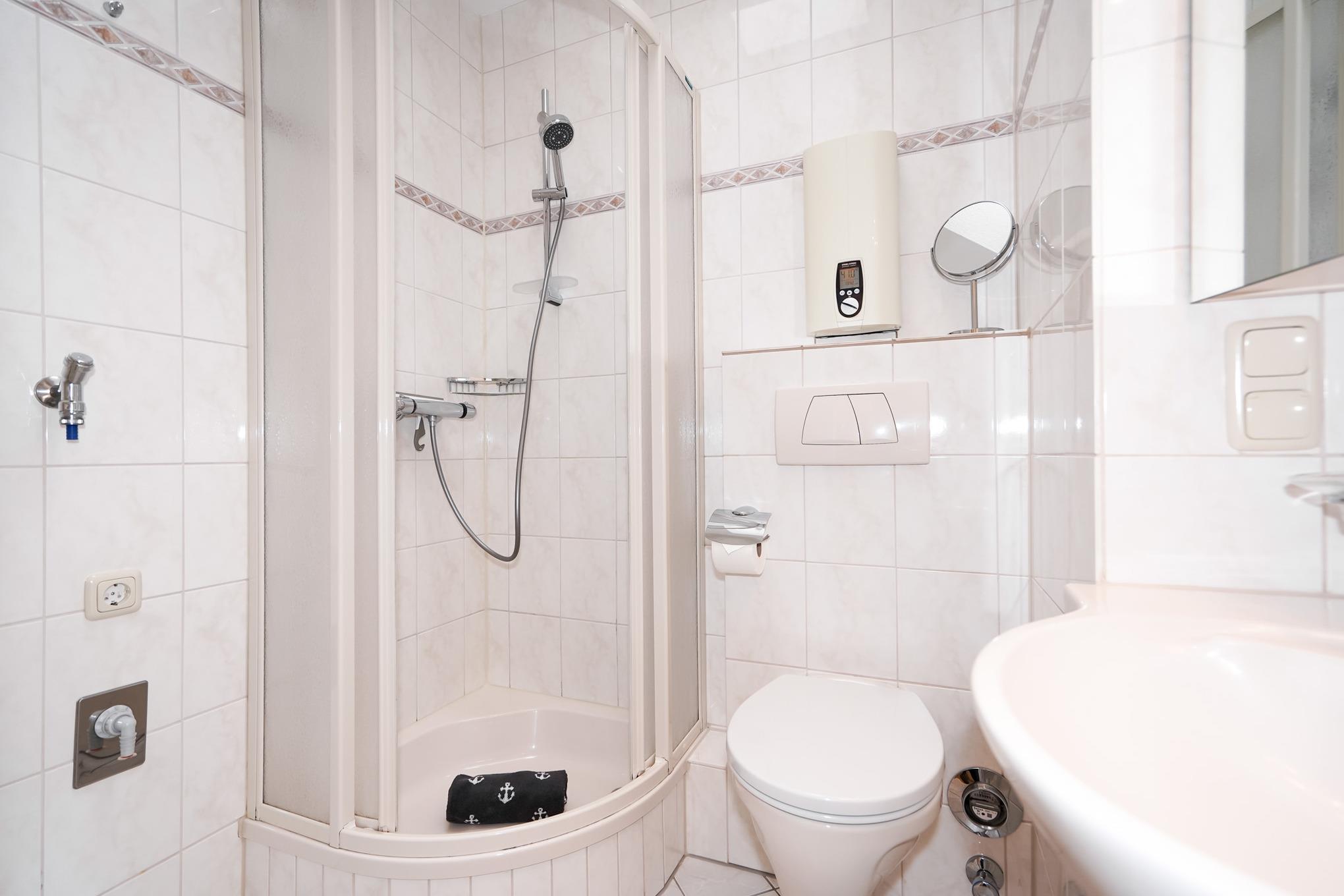 Im Schlafzimmer finden Sie ein Doppelbett, Nachttische sowie einen Kleiderschrank vor. Das Fenster lässt sich durch Vorhänge vollständig verdunkeln. Das hell geflieste Bad bietet Ihnen eine Dusche, einen Waschtisch, ein WC und diverse Ablagemöglichkeiten.
