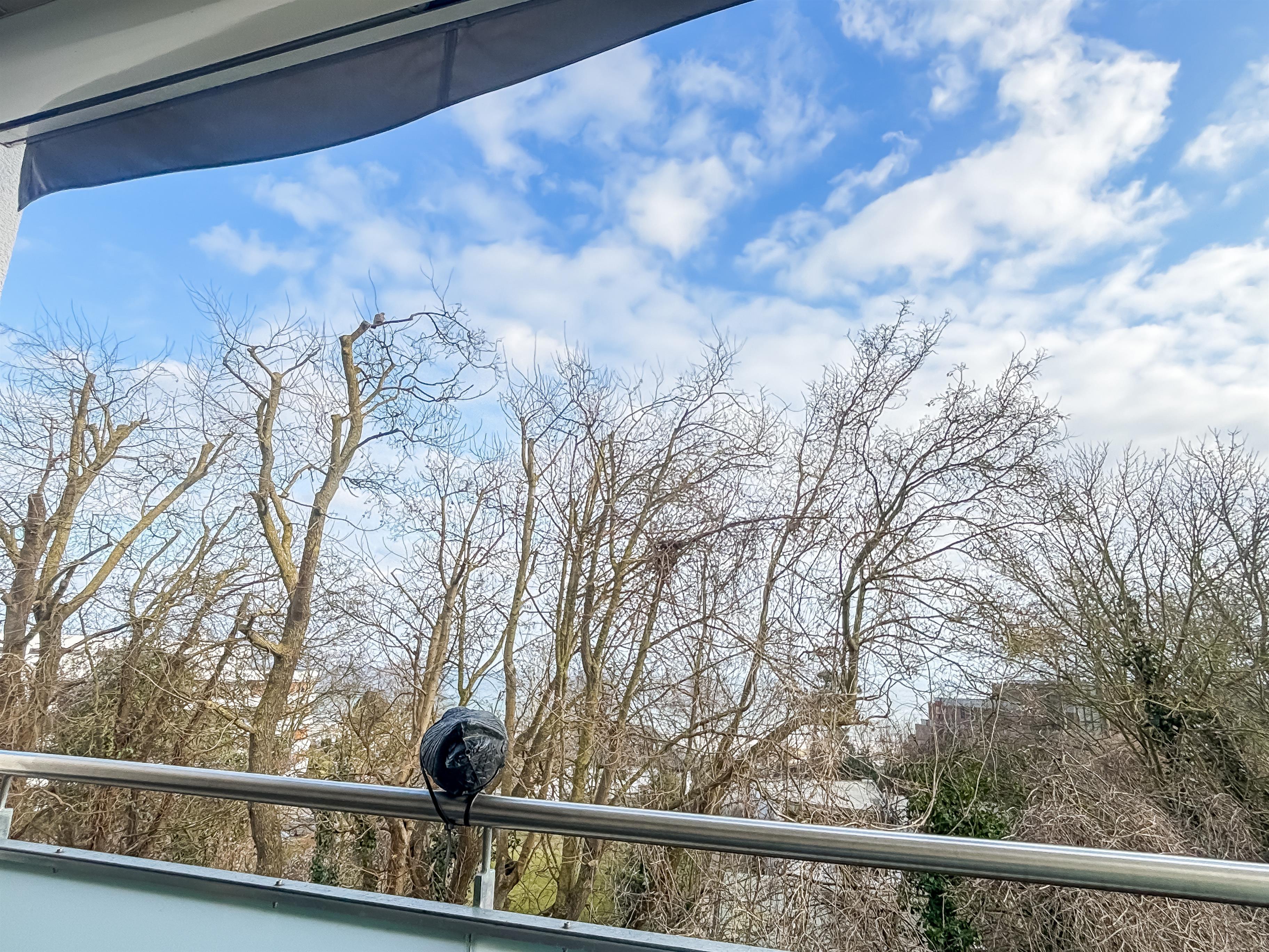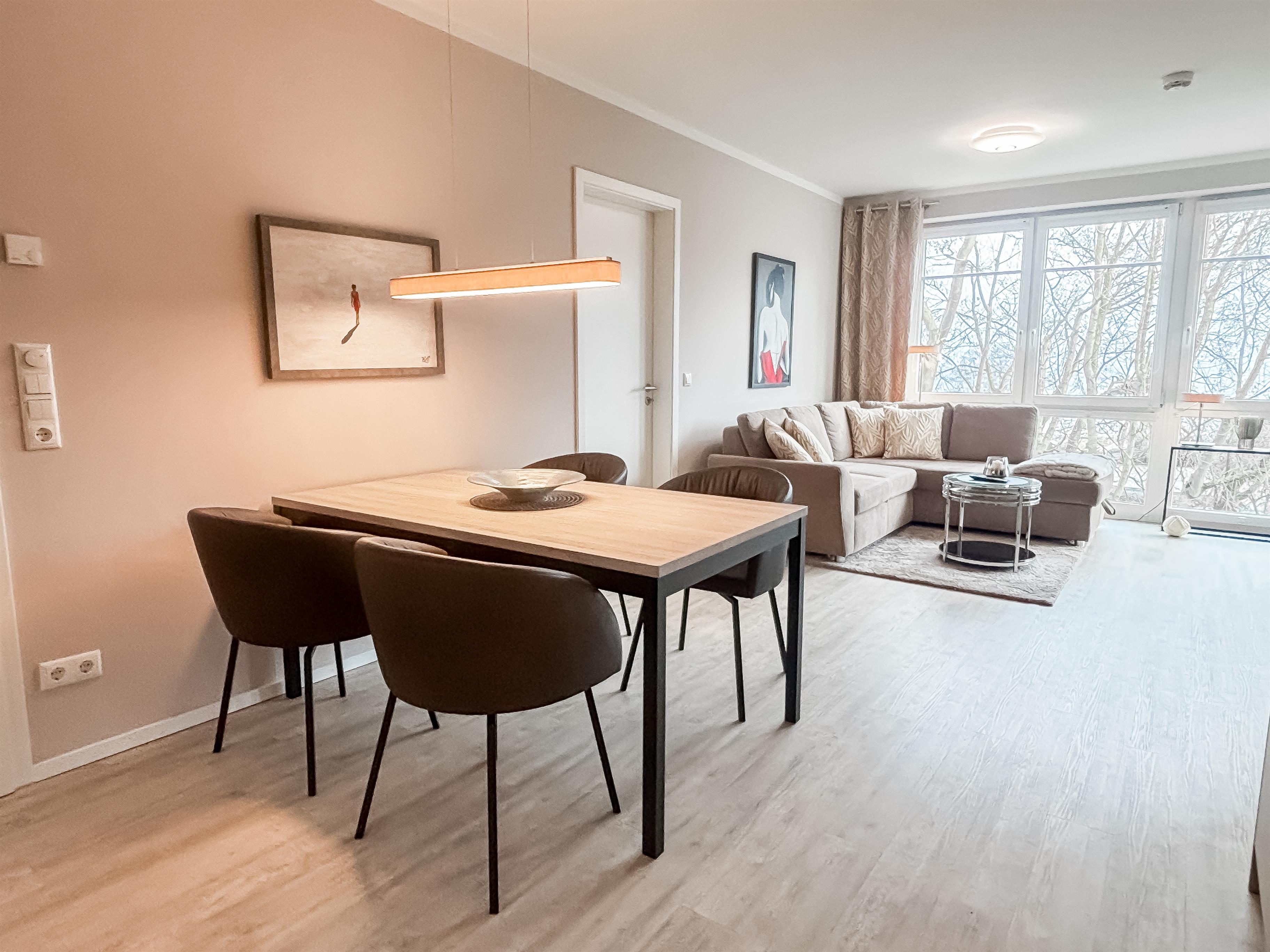 Das Herzstück der Wohnung ist der gemütliche Wohnbereich mit großem Esstisch, bequemer Couch und Flachbild-TV. Von hier aus gelangen Sie auf den möblierten Balkon – perfekt für entspannte Stunden im Freien.