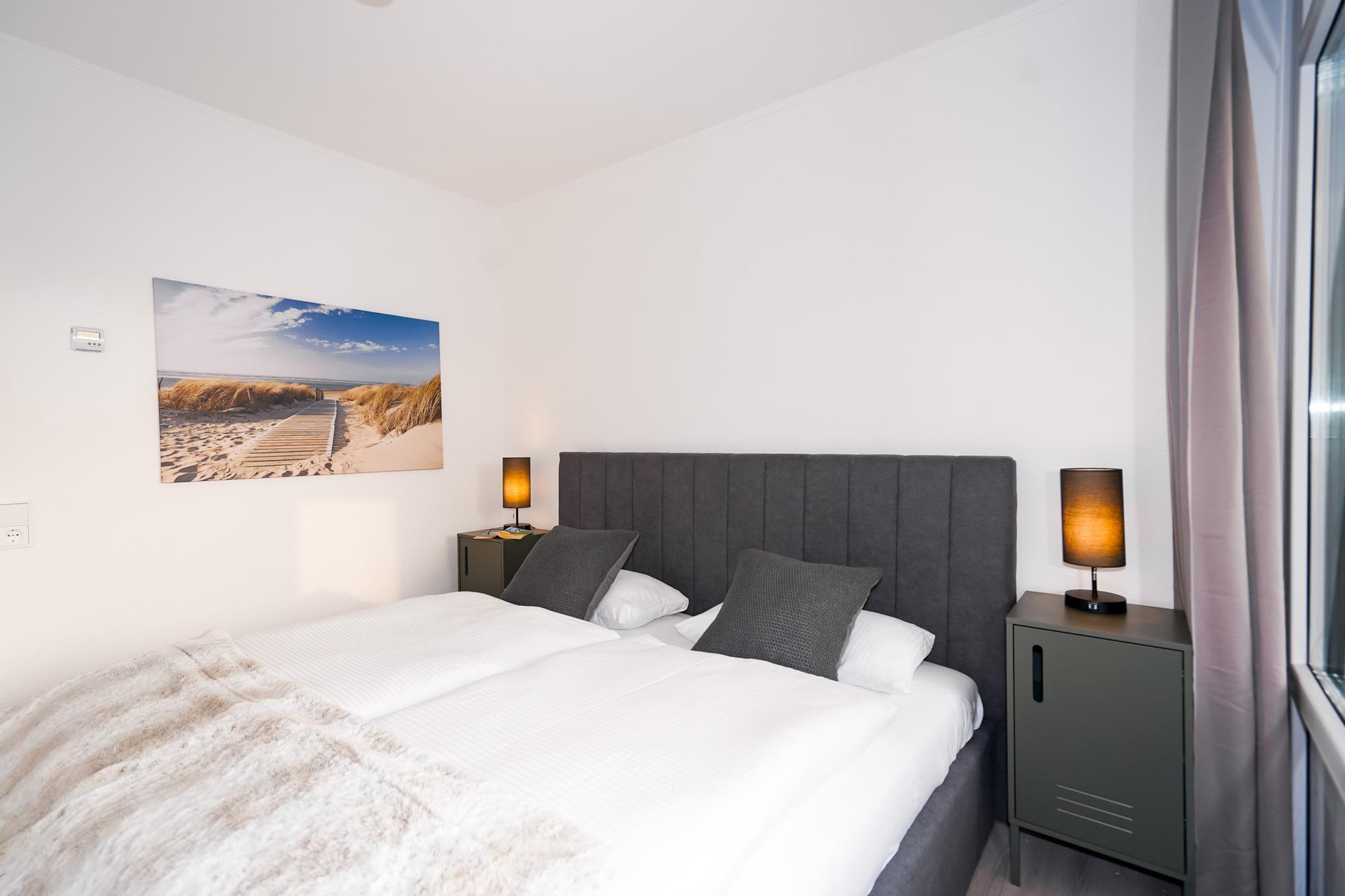 Das Hauptschlafzimmer verfügt über ein Doppelbett mit hochwertigen Matratzen (180x200) und einen großen Kleiderschrank. Durch das Schlafzimmer können Sie ebenfalls den Balkon betreten. Das zweite Schlafzimmer ist mit einem Einzelbett (90x200) ausgestattet. Alle Räume in der Wohnung lassen sich mit elektrischen Rollläden verdunkeln.