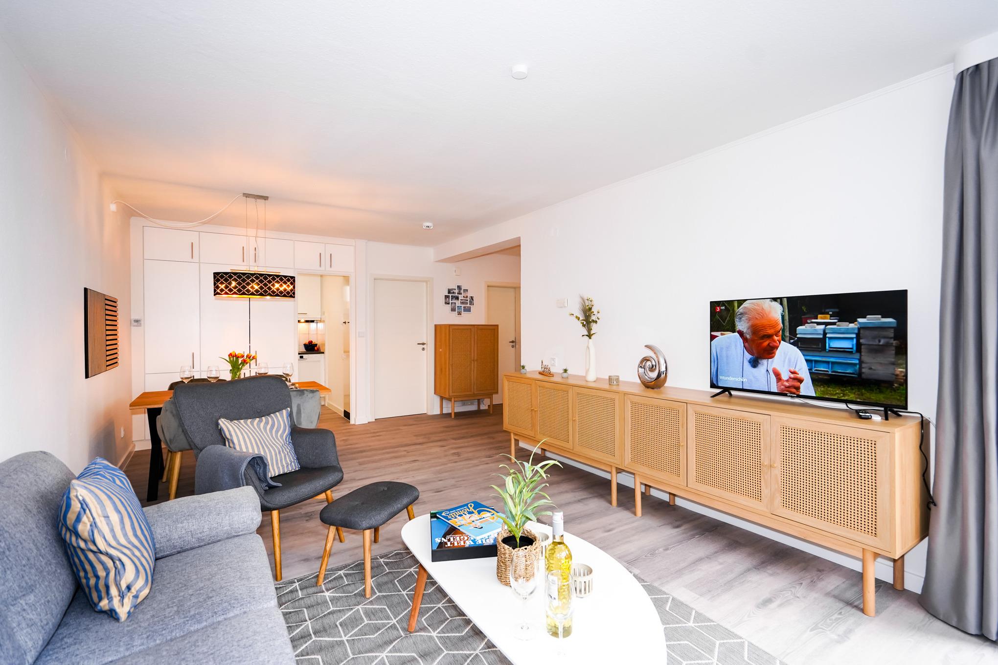Der helle Wohn- und Essbereich, mit direktem Zugang zum Balkon, ist mit zwei gemütlichen Sofas, einem Sessel und einem großen Esstisch ausgestattet. Ein Fernseher und kostenloses W-LAN ergänzen die Ausstattung.