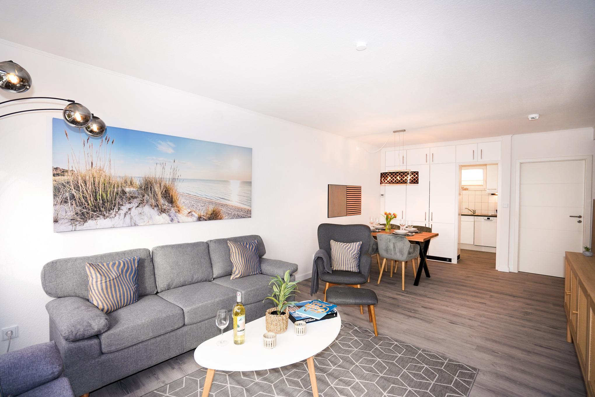 Moderne Ferienwohnung in Grömitz mit Balkon, Garage und Gartenfreisitz nahe Strand und Zentrum.