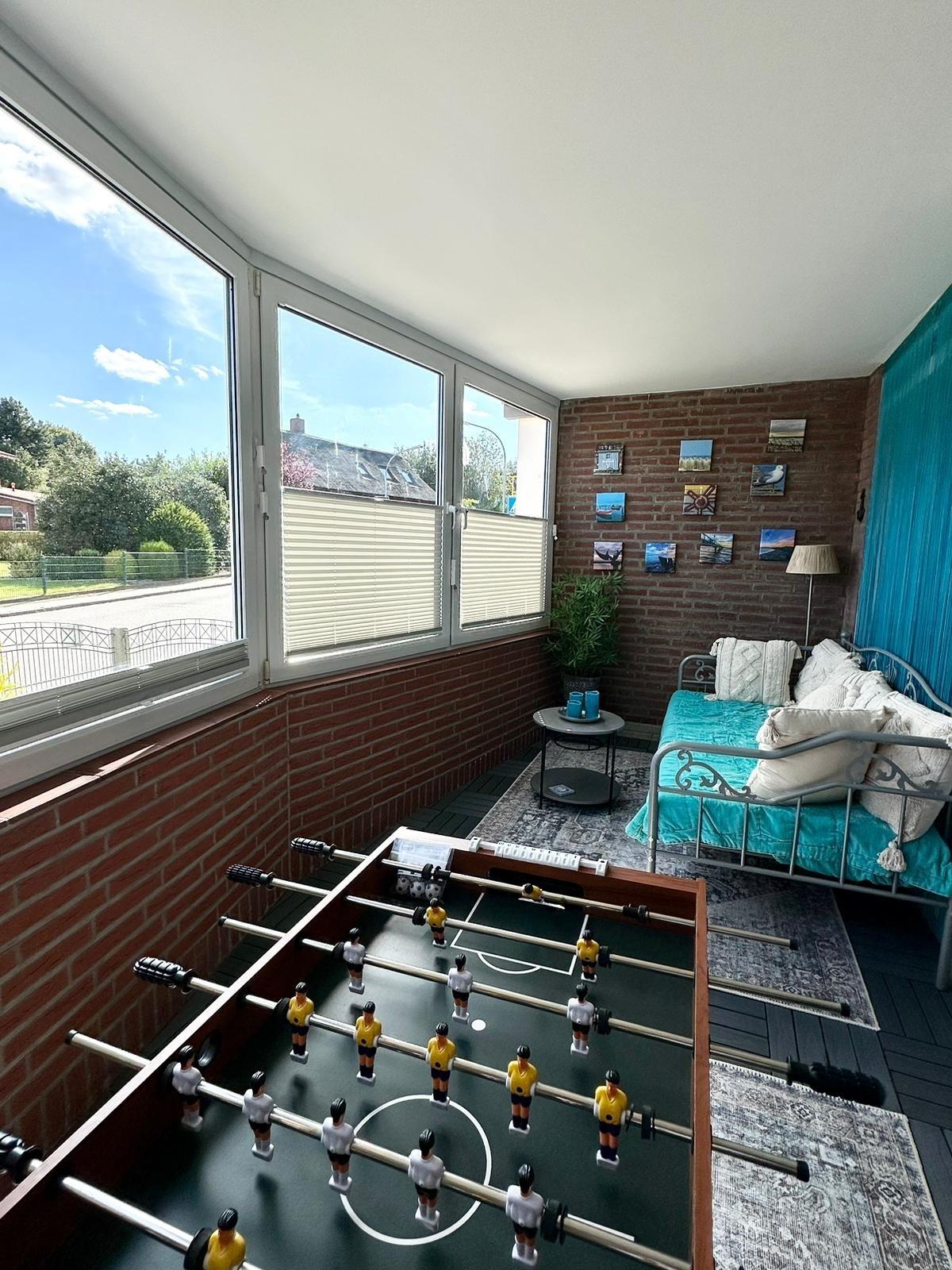 Entspannen Sie sich in dem stilvoll eingerichteten Wohnbereich nach einem Tag voller Abenteuer an der Küste oder nutzen Sie die voll ausgestattete Küche, um köstliche Mahlzeiten zuzubereiten und sie gemeinsam am Esstisch zu genießen. Sie können den Tag auch auf dem Balkon ausklingen lassen, oder eine runde Tischkicker im Wintergarten spielen.