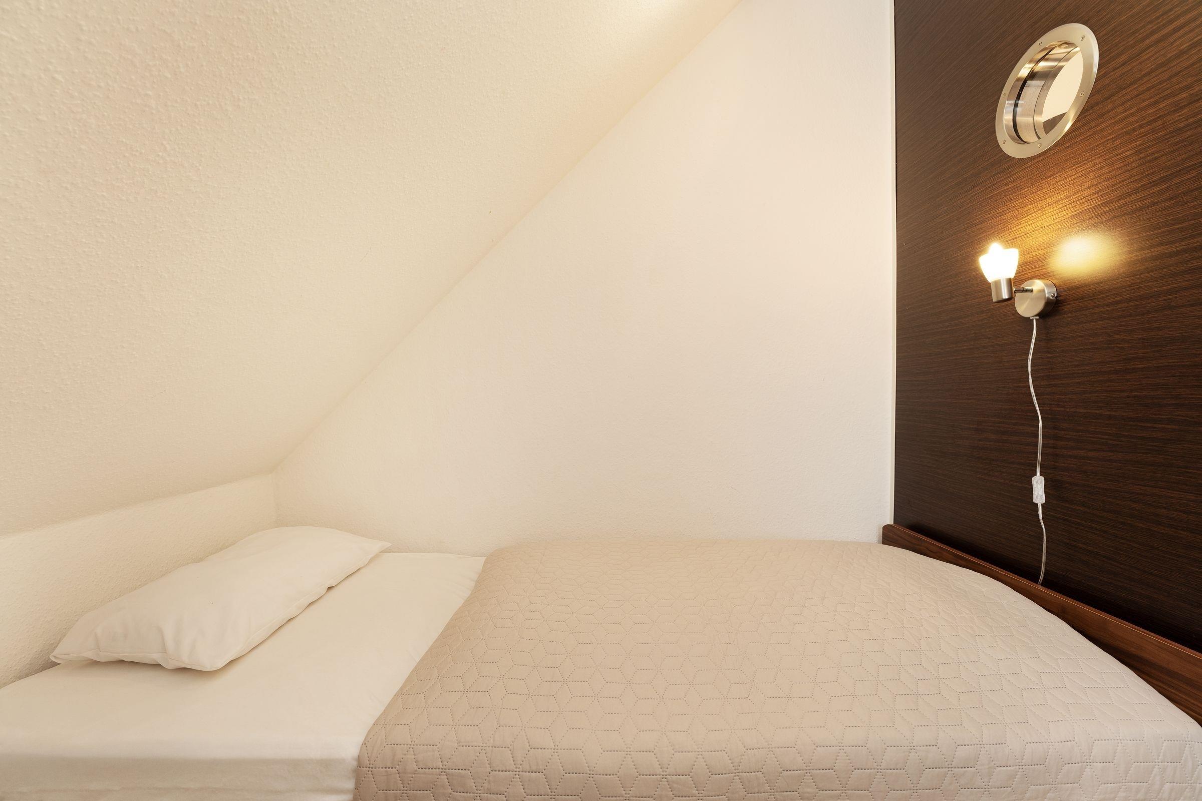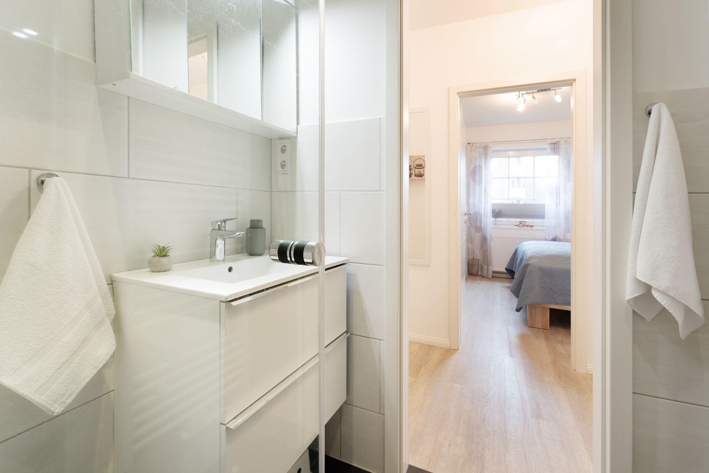 Der großzügige Essbereich mit Panoramablick ist ideal für gesellige Frühstücksrunden oder ein heiteres Dinner mit Freunden. Möchten Sie es sich Zuhause gemütlich machen anstatt am Strand zu flanieren, dann sorgt ein großer Flachbild-Fernseher mit 145 cm Bildschirmdiagonale im Wohnzimmer für Unterhaltung. Die separate Küche ist mit kleinen Alltagshelfern wie z. B. einem 4-Platten-Cerankochfeld, Mikrowelle und Backofen gut ausgestattet. So bereiten Sie problemlos leckere Mahlzeiten während Ihres Urlaubs zu. Zwei separate Schlafräume bieten reichlich Platz und Komfort. Eins der Schlafzimmer ist mit einem komfortablen Doppelbett mit luxuriöser Matratzenhöhe von gut 50 cm ausgestattet (Liegefläche 2x 90x200cm) - Hier werden Sie wie auf Wolken schlafen! Der großzügige Schiebetürenschrank bietet reichlich Stauraum und nimmt problemlos Ihre Feriengarderobe auf. Das zweite Schlafzimmer mit 2 Einzelbetten (je 90x200cm), die lauschig unter der Dachschräge platziert sind, garantiert ebenso erholsame Stunden. Modern und stilsicher schließt sich das stilvolle Designbad mit Annehmlichkeiten wie bodentiefer Wellnessdusche (90x90 cm mit Regenfunktion), beheizbarem Handtuchhalter, WC und Waschtisch dem überzeugenden Ambiente der Wohnung an.