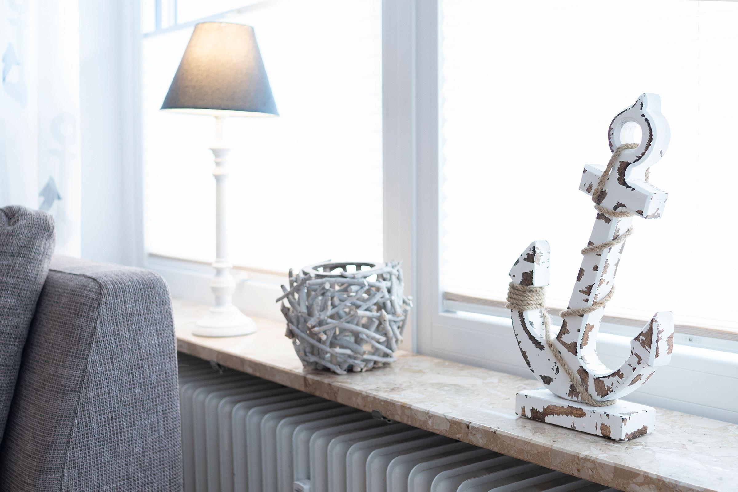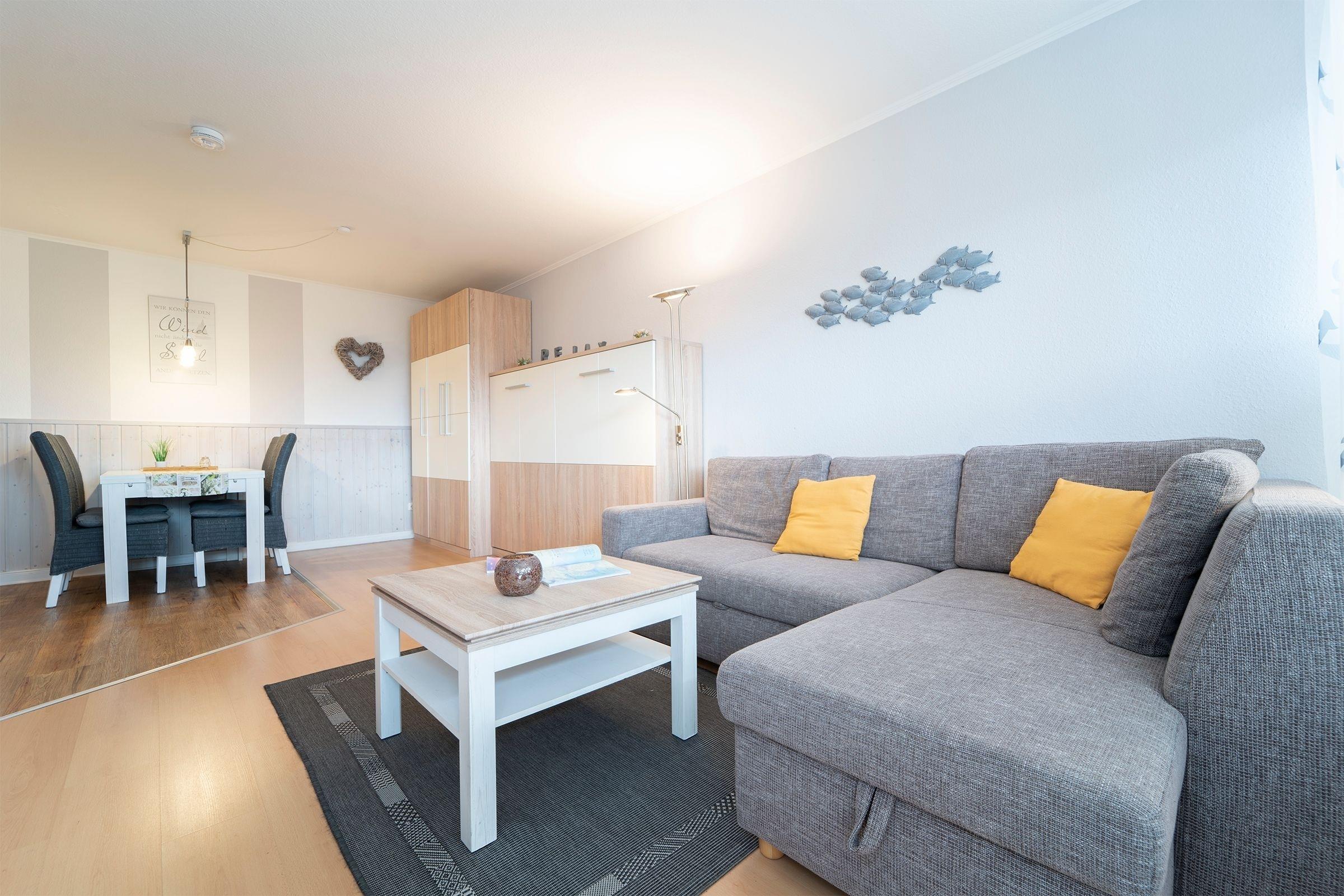 Ein kombinierter Wohn-/Essraum mit integrierter, gut ausgestatteter Küchenzeile bildet das Herzstück der Ferienwohnung. Im Wohnzimmer sorgen ein hochwertiges Sofa, ein bequemes Schrankbett (140x200 cm) sowie ein moderner Flachbildfernseher für Komfort und Unterhaltung. Im separaten Schlafzimmer befinden sich zwei Einzelbetten (je 80x200). Das Badezimmer ist modern mit WC, Waschbecken, Spiegel, Dusche und Föhn ausgestattet. Im Flur stehen Einbauschränke mit viel Stauraum zur Verfügung. Außenjalousien sorgen für angenehme Verdunklung. Auf dem großen, möblierten Süd-Balkon mit Blick in Richtung Deich können Sie zahlreiche Sonnenstunden genießen.