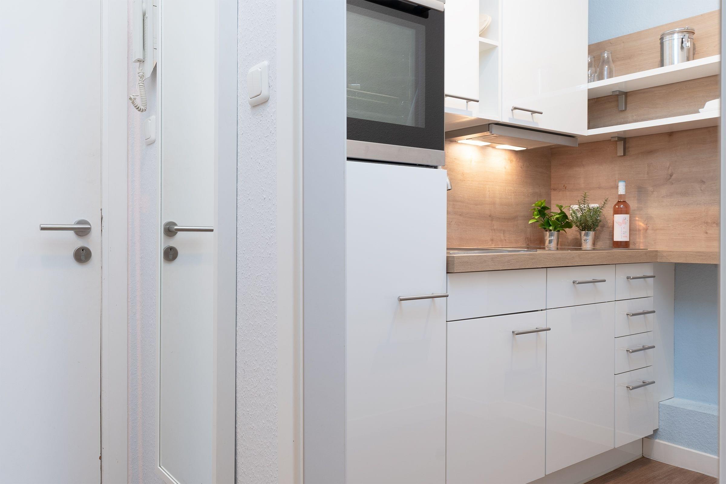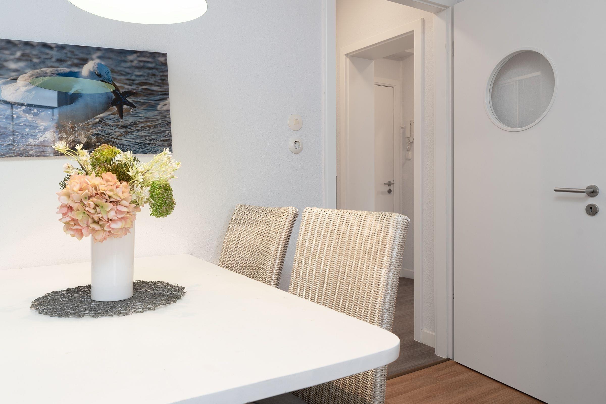 Die Ferienwohnung ist zeitlos im modernen Landhausstil eingerichtet, warme Farben und maritime Elemente sorgen für ein gemütliches Wohnambiente und Komfort. Der lichtdurchflutete, offen gestaltete Wohnbereich ist mit Sofa, Sessel, Flatscreen-TV, Vitrine und Essplatz für 4 Personen ausgestattet. Von hier aus führt ein direkter Zugang auf den möblierten Balkon mit Südwest-Ausrichtung, hier genießen Sie zahlreiche Sonnenstunden und können dem Meeresrauschen lauschen. Das hochwertige Schlafsofa bietet bei Bedarf einen Schlafplatz für eine Person (90x200 cm), Plissees und Vorhänge sorgen für angenehme Verdunklung. Das separate Schlafzimmer ist hell und großzügig geschnitten und mit ein bequemem Doppelbett (2x 90x200 cm), Kommode, Spiegel und Kleiderschrank möbliert. Plissees und Vorhänge sorgen auch hier für angenehme Verdunklung. In der separaten, gut ausgestatteten Küche bereiten Sie problemlos kleine Mahlzeiten zu, Annehmlichkeiten wie Ceranfeld, Backofen in angenehmer Arbeitshöhe und Spülmaschine helfen im Urlaubsalltag. Das hell geflieste Badezimmer ist mit Dusche, Spiegelschrank und Handtuchheizung ausgestattet.