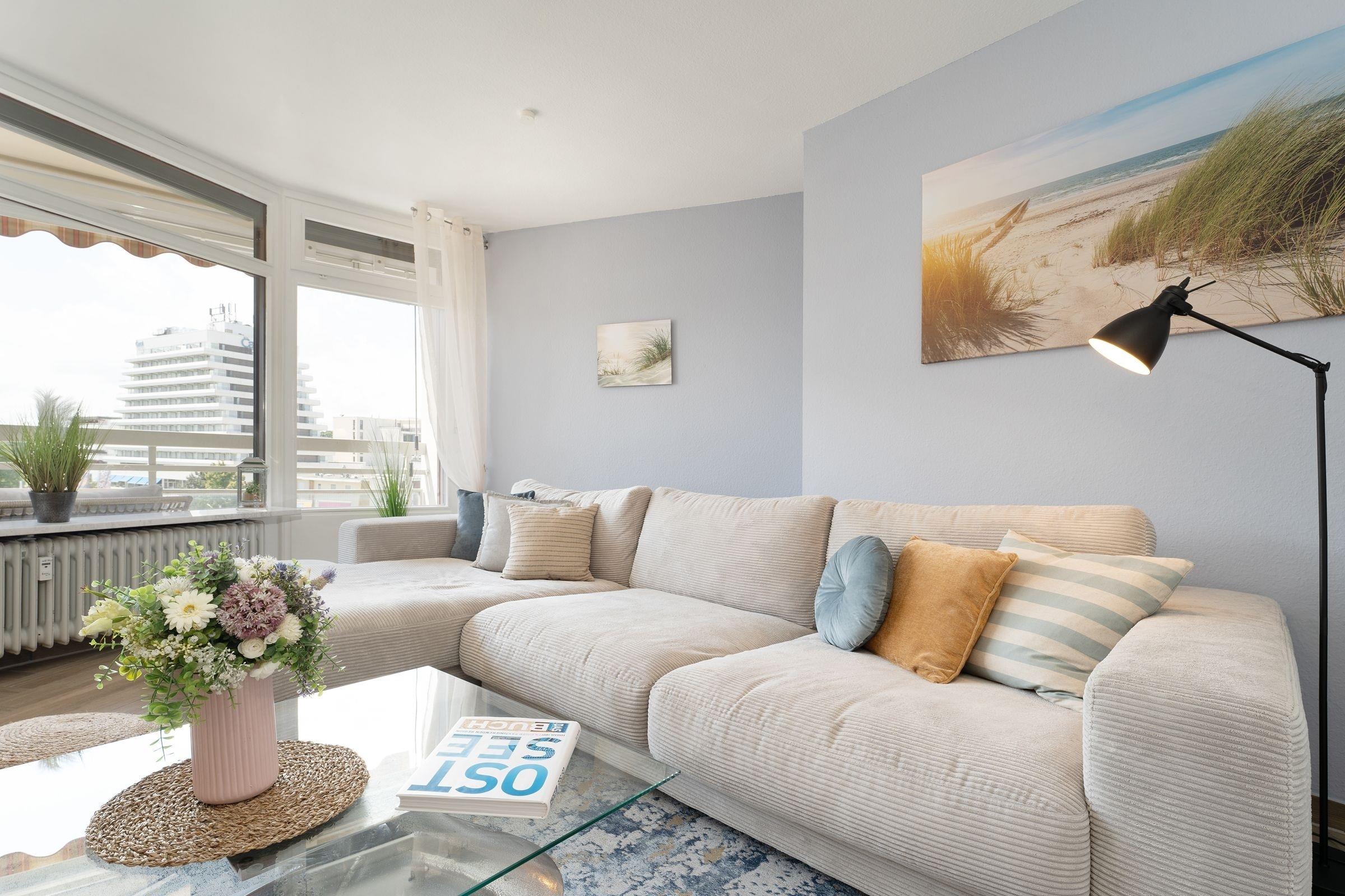 Diese traumhafte 3-Zimmer-Ferienwohnung im 5. Stock in bester Lage von Grömitz ist für bis zu 4 Erwachsene und 1 Kind geeignet und erwartet Sie auf 63 m² mit einer geschmackvollen Einrichtung und einem seitlichen Meerblick.