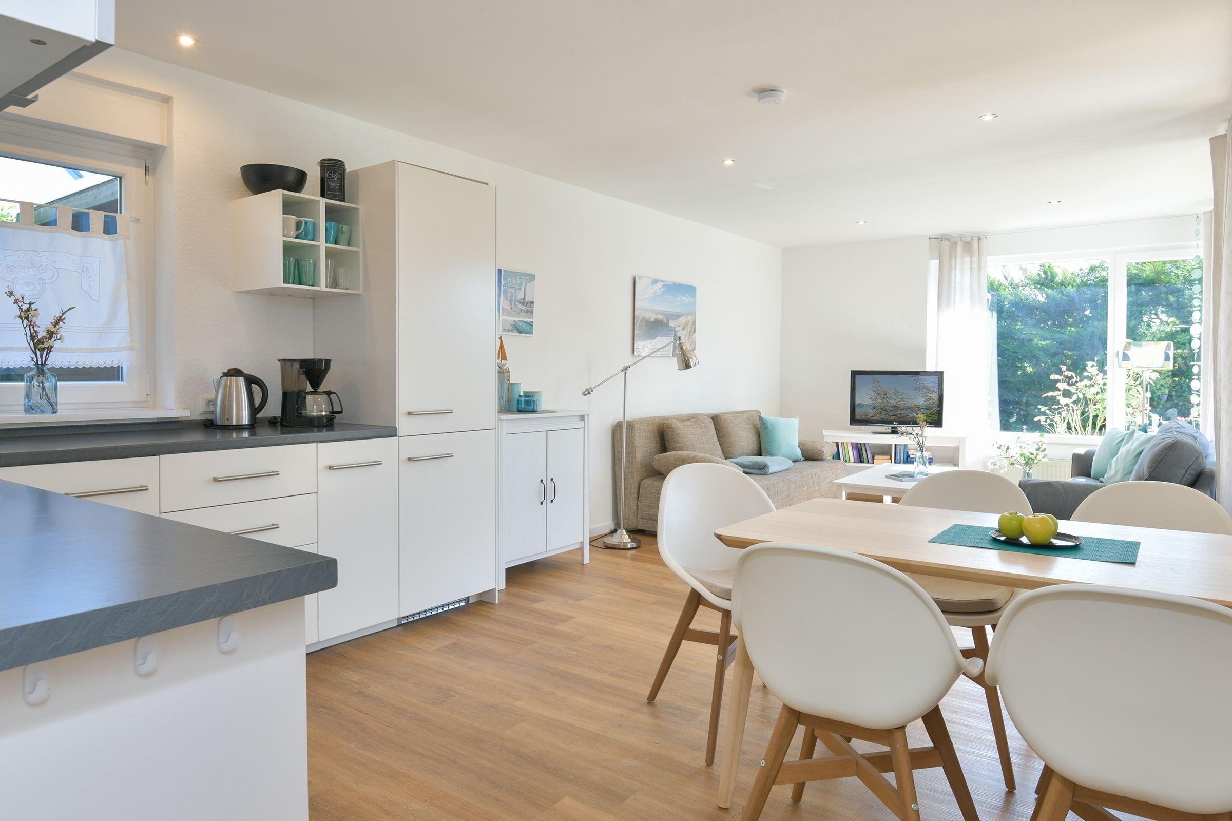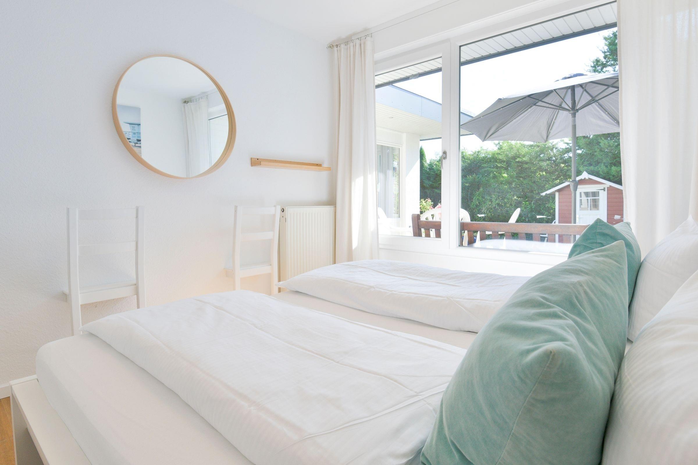 Im großen Wohn-, Essbereich finden bis zu 4 Erwachsene und 1 Kind reichlich Platz. Vom Wohnzimmer betreten Sie direkt Ihre großzügige möblierte Terrasse mit Südostausrichtung und den schön angelegten Garten. Zum Übernachten gibt es hier ein Schlafzimmer mit Doppelbett und ein weiteres mit einem Etagenbett (2x 90x200 cm). Die Wohnung lässt sich über Außenjalousien komplett verdunkeln. Für die fünfte Person kann im Wohnzimmer das Schlafsofa genutzt werden.