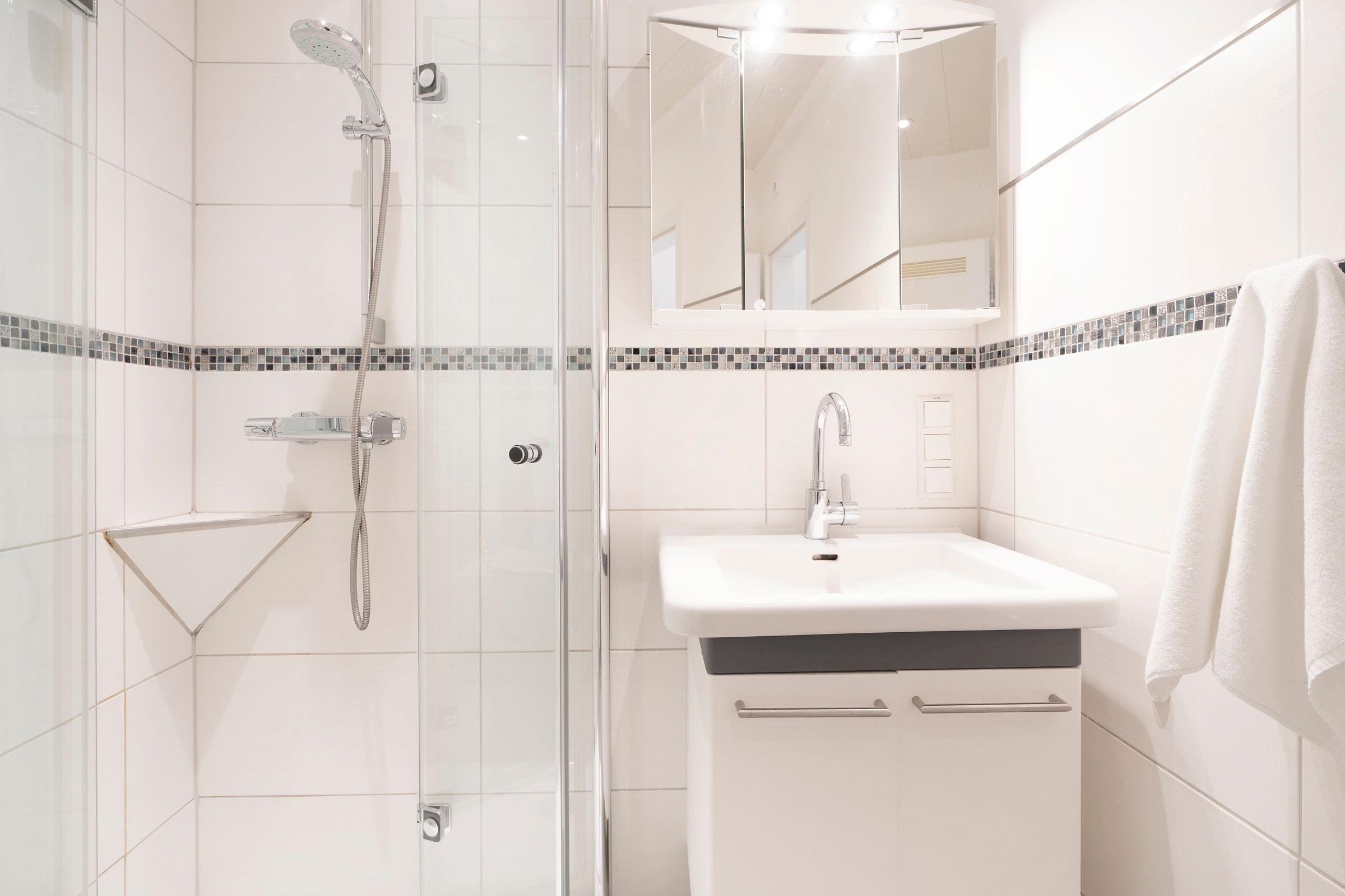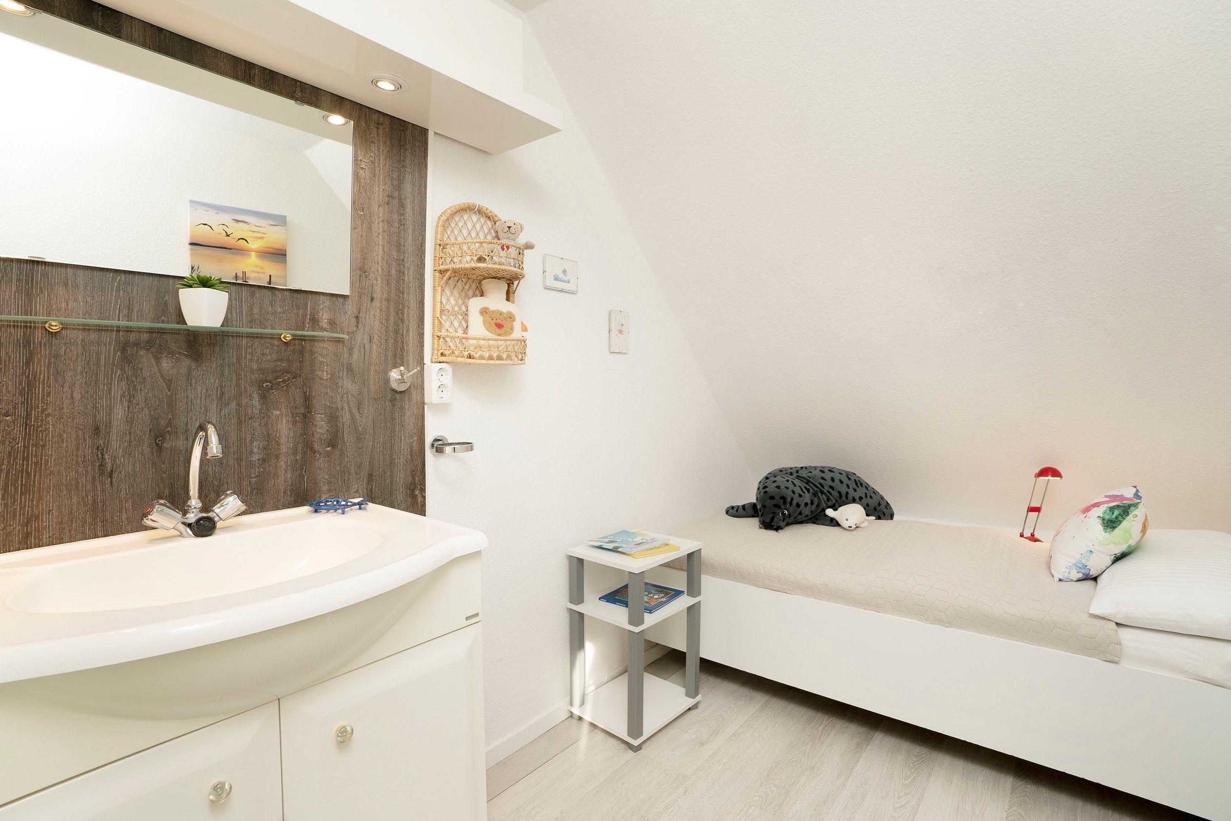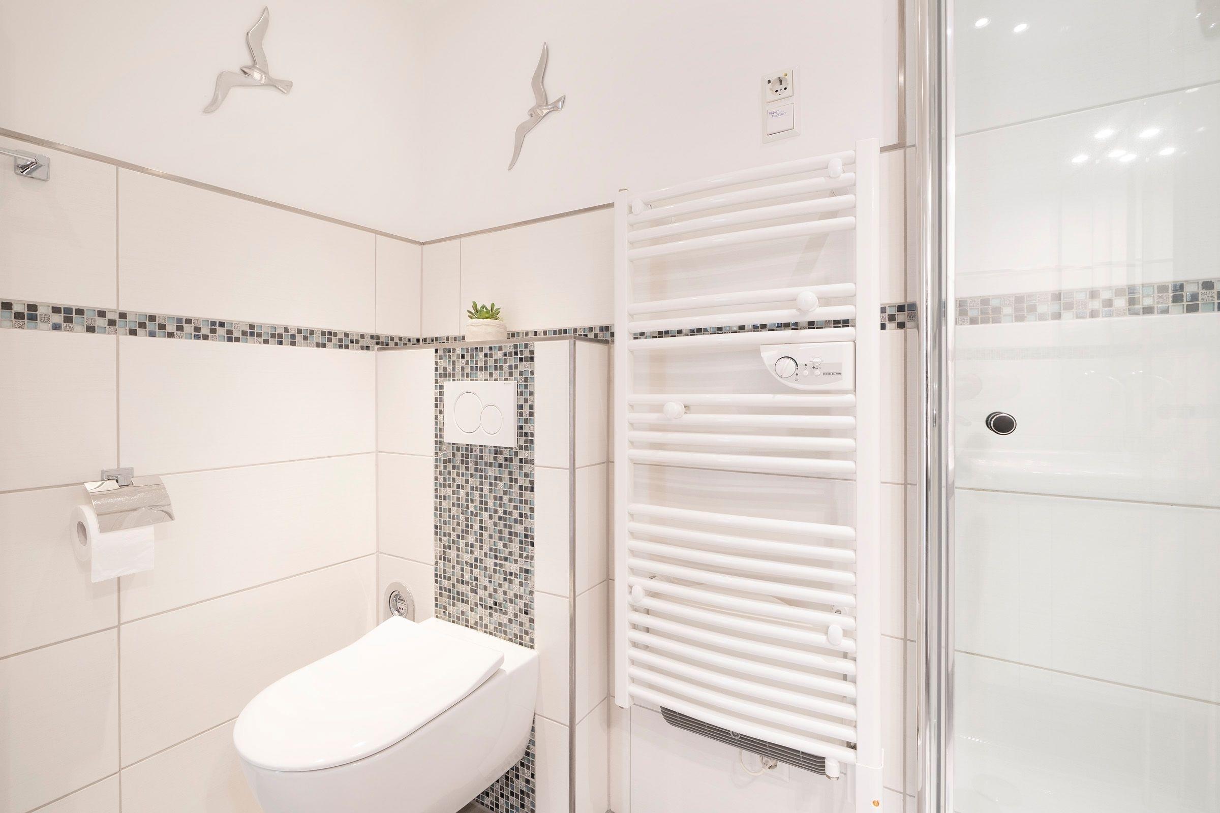 In dieser ersten Etage befindet sich ein nordisch-maritimes Schlafzimmer mit einem gemütlichen Doppelbett (2x80x200cm). Das hell geflieste Wohlfühlbad bietet mit einer geräumigen Dusche, WC, Fön, Waschtisch mit Spiegel und einer praktischen Handtuchheizung alle Annehmlichkeiten.