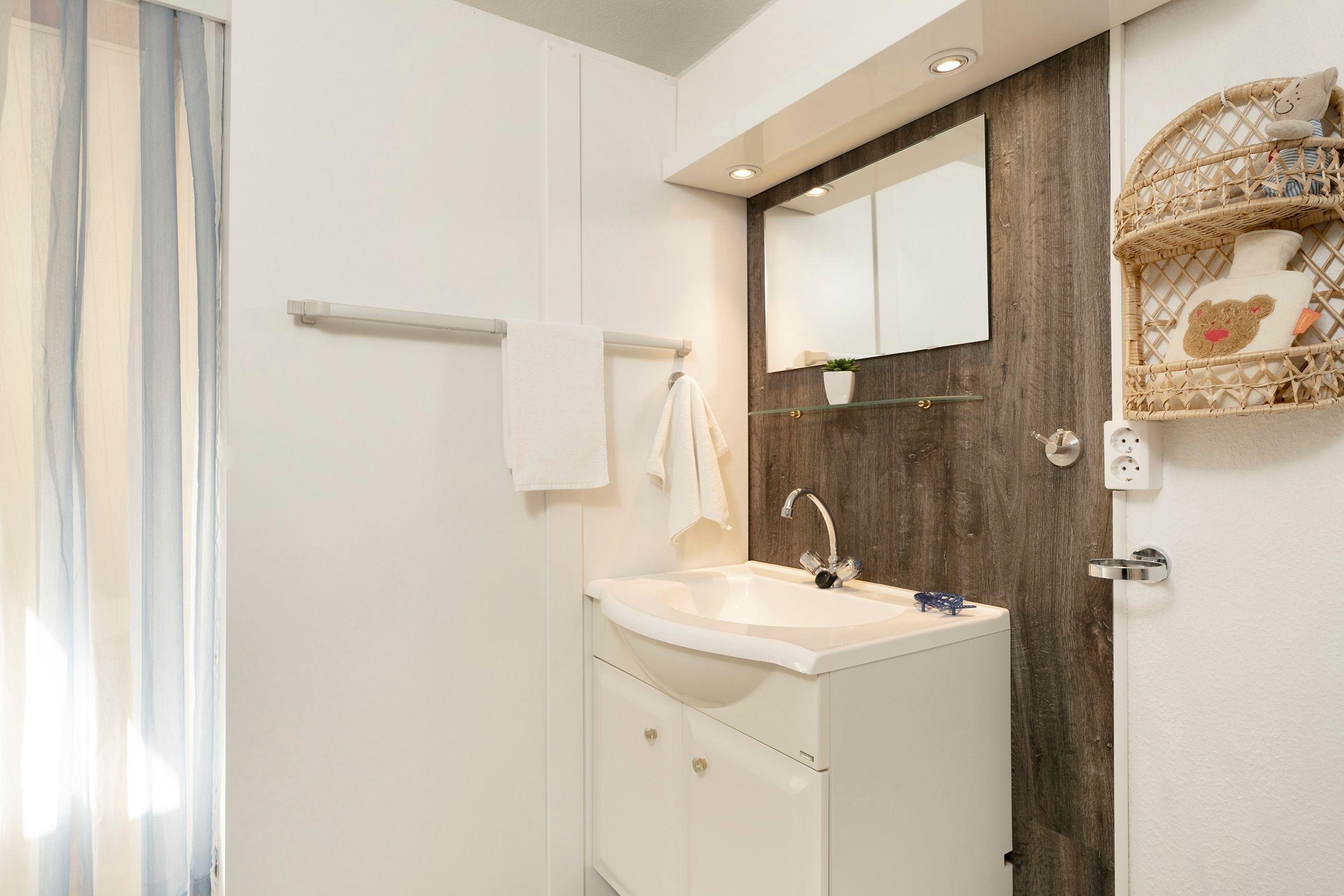 Gehen Sie in den oberen Bereich der Wohnung, dann finden Sie dort zwei weitere Schlafzimmer mit Doppelbett (2 Matratzen je 80cmx200cm), eines davon mit TV und noch einem weiteren Schlafbereich, vom großen Schlafzimmer mit Vorhang abgeteilt, mit einem Einzelbett (70cmx170cm) ausgestattet. Ein kleiner Waschbereich mit Spiegel und Waschbecken in der Schlafnische sorgt für kurze Wege nach dem Zähneputzen und einen frischen Start in den Tag.