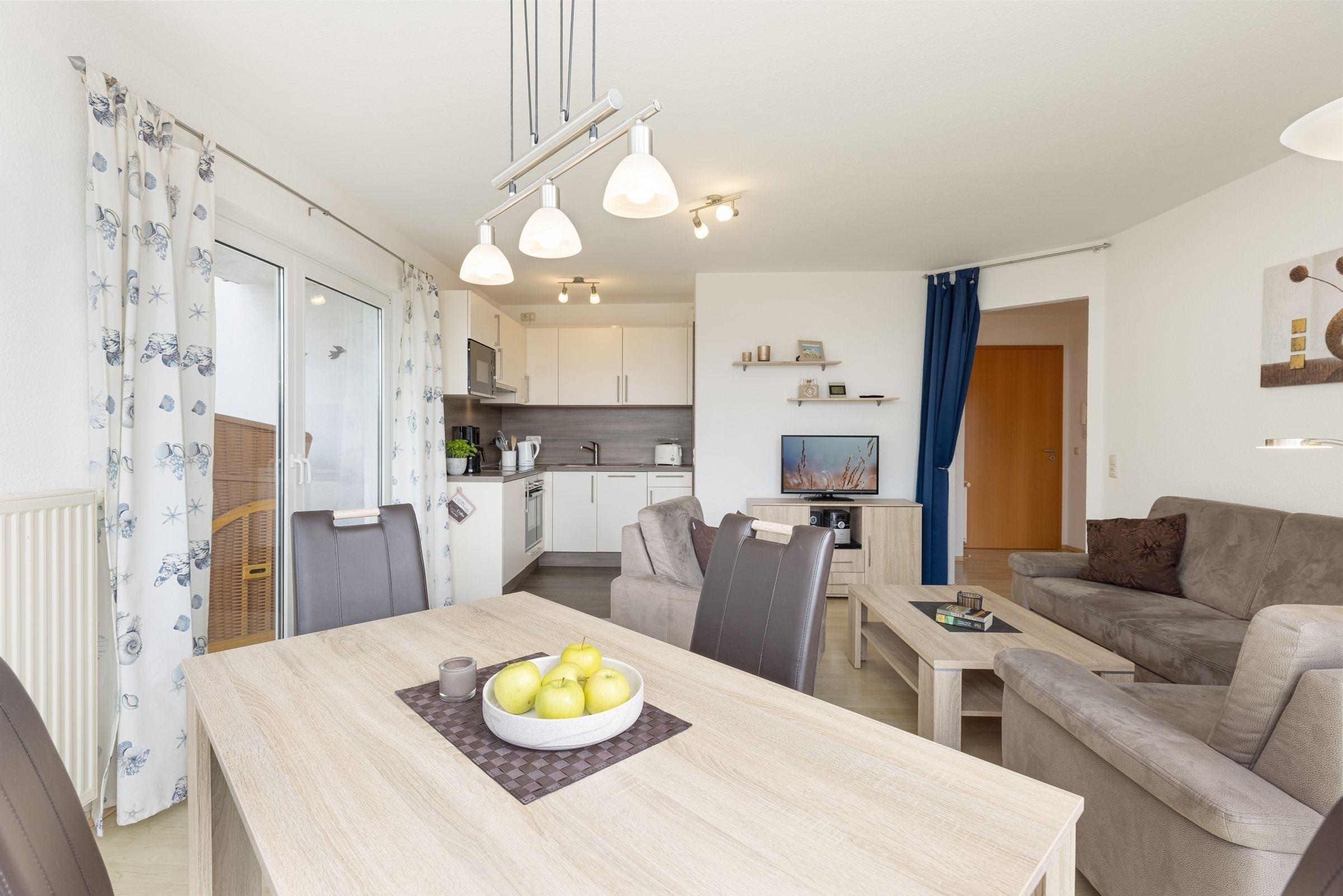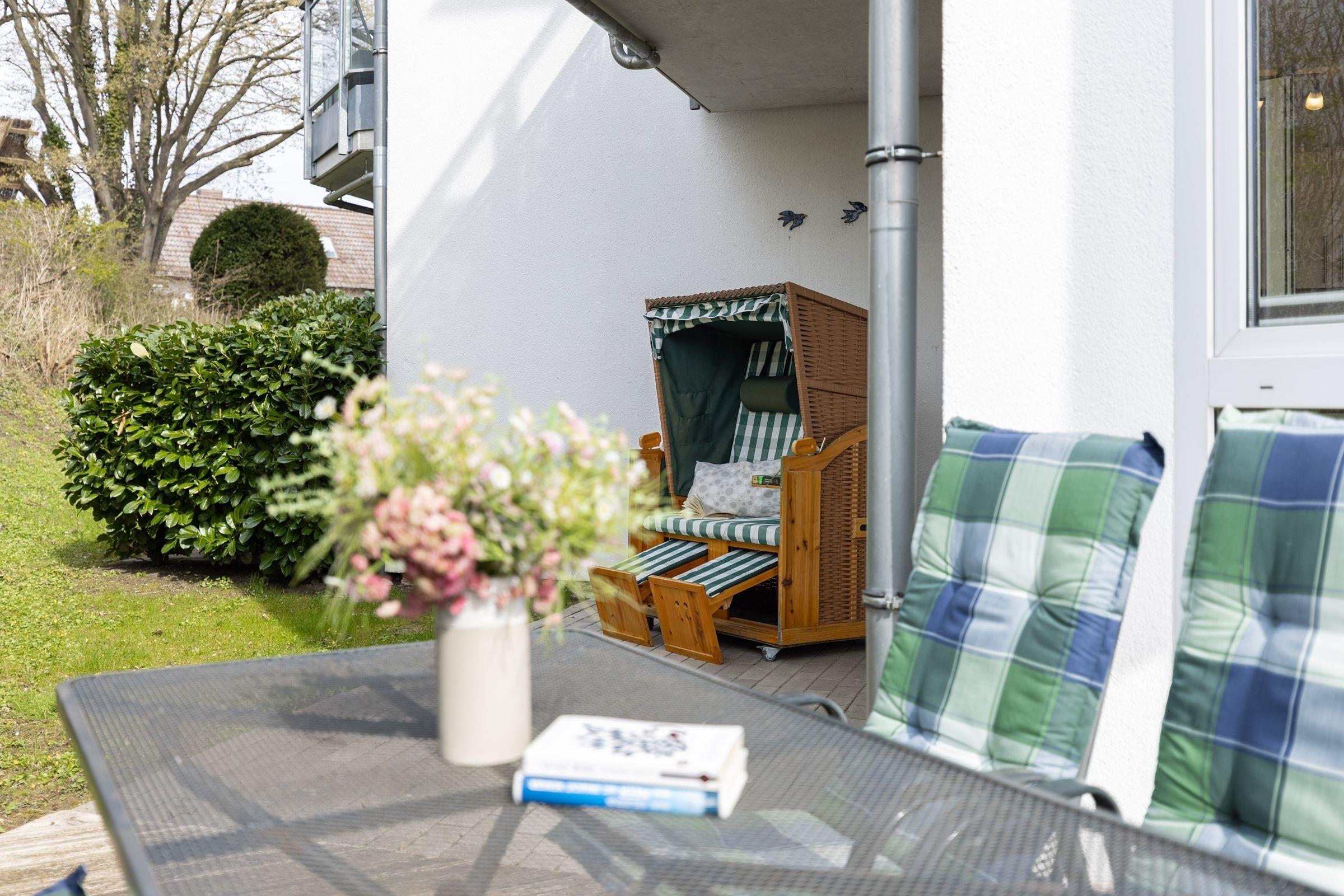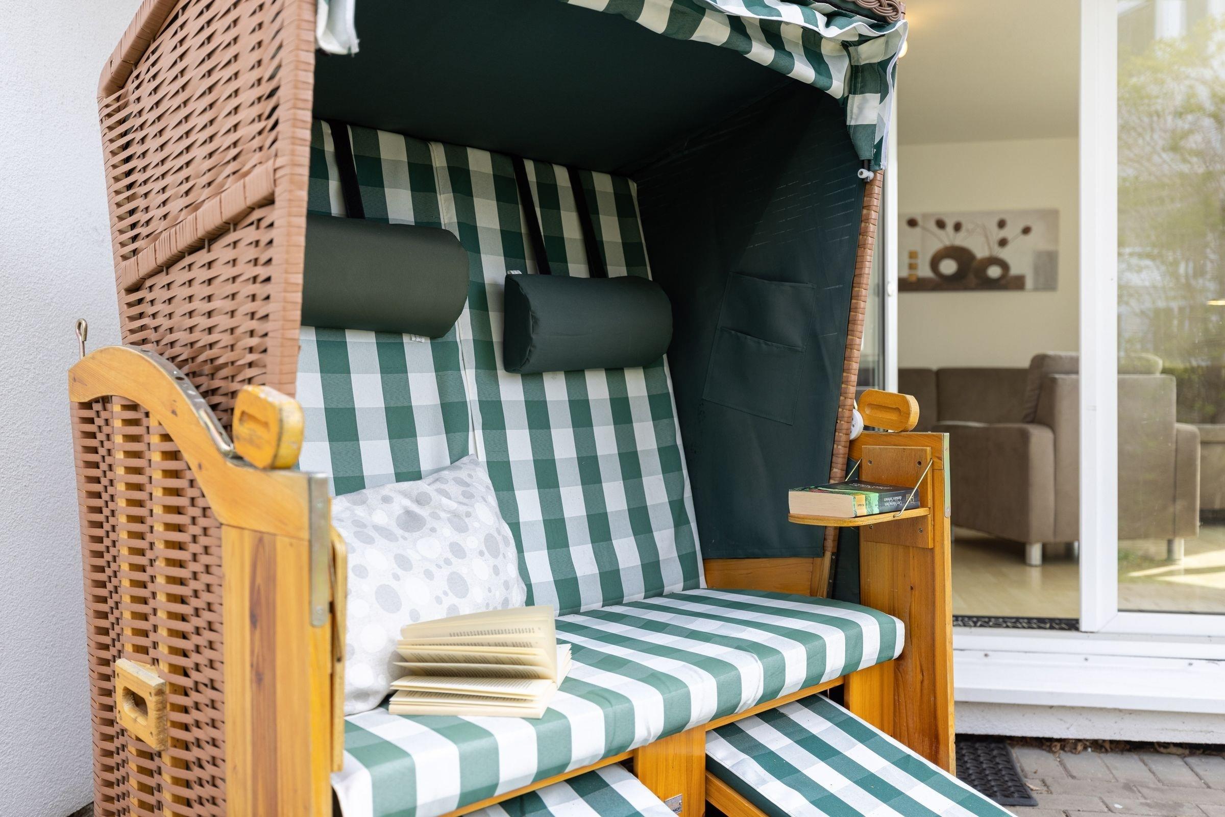 Gemütliche Ferienwohnung in Grömitz mit Terrasse, Strandkorb und moderner Ausstattung für entspannte Tage.