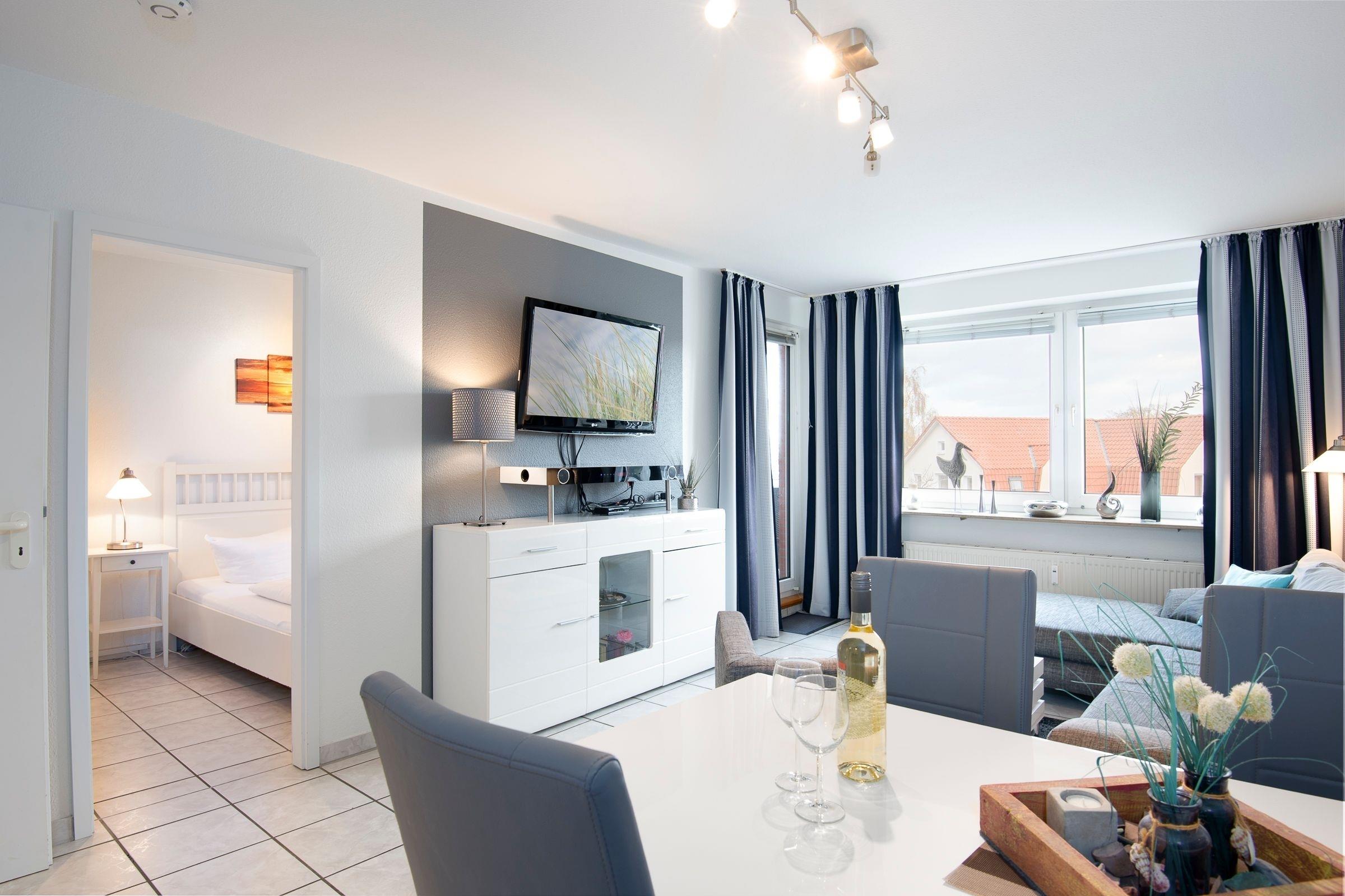 Es erwartet Sie ein modern eingerichtetes Wohnzimmer mit Eckgarnitur (als vollwertige Schlafmöglichkeit für 2 Personen schnell umzubauen ca. 130x240 cm), ein Essplatz für 4 Personen, ein 42-Zoll-Flachbildschirm, WLAN sowie eine Infotainment - Bar (Steckplatz f. i-Phone oder i-Pad, alle Geräte auch über Bluetooth). Hier bleiben keine Wünsche offen. Das Schlafzimmer ist mit einem großen Schrank, einem Doppelbett (2x 180x200 cm) und einem Flachbildschirm ausgestattet. Der Fahrstuhl und die Inneneinrichtung der Wohnung mit Duschhocker, erhöhtes WC, mobilen Handgriffen und ebenerdiger Dusche ( nur eine kleine Kante von 3 cm zum Einstieg) machen das Appartement auch für Personen mit Einschränkungen (Geh-Wagen oder Delta-Rad) interessant und ohne Probleme nutzbar. Des Weiteren gehört ein überdachter Balkon mit Südostausrichtung zur Wohnung.