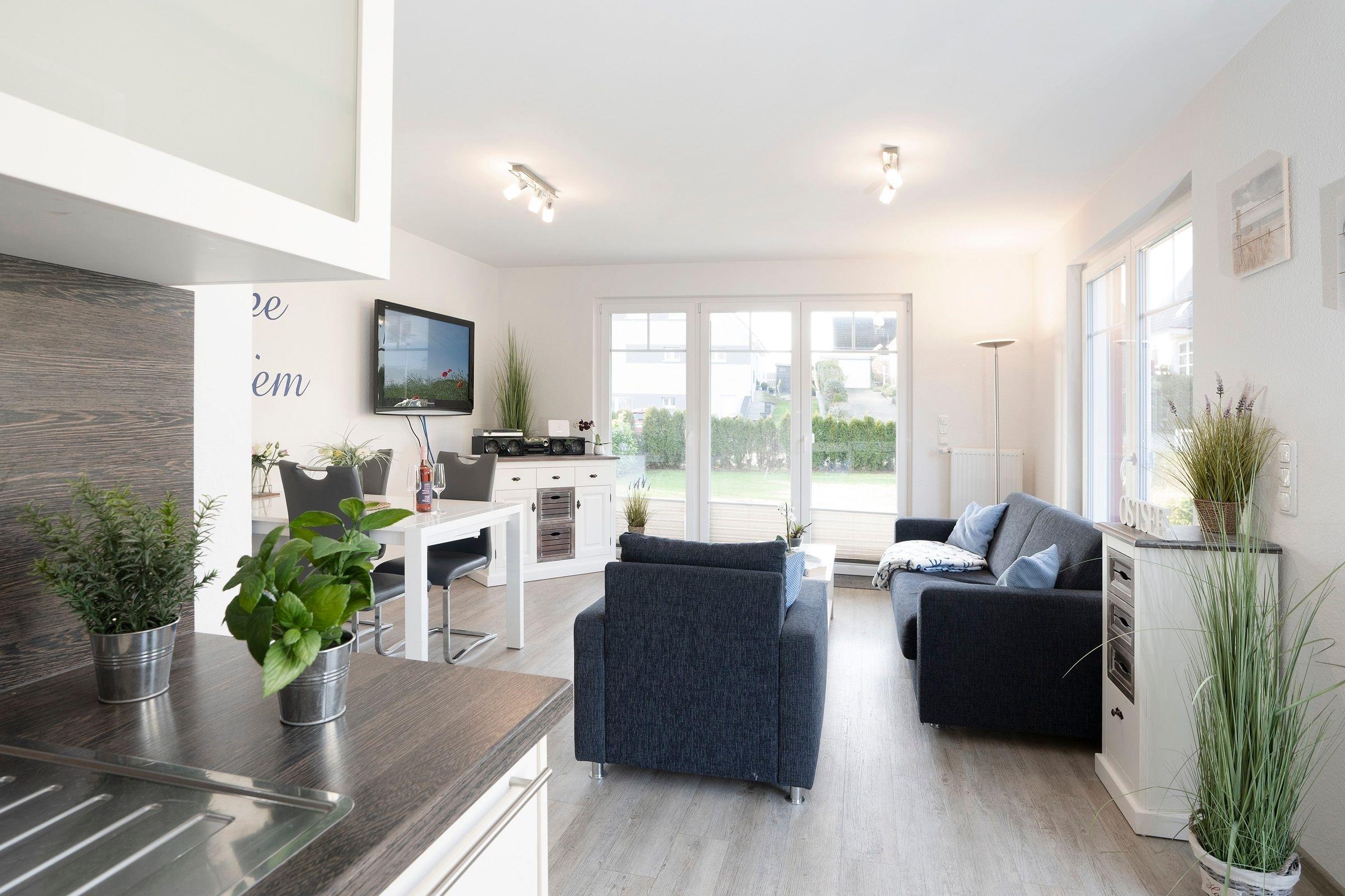 Ihre 2-Zimmer-Ferienwohnung erwartet Sie mit einem modernen, ruhigen Schlafzimmer, das mit einem großen Doppelbett (2x 100x200 cm) und einem Flat-TV ausgestattet ist. Das Wohnzimmer mit zusätzlicher Schlafcouch (160x190 cm) und dem großen 55 Zoll Fernseher sowie die Küche mit 4-Platten Ceranfeld, Spülmaschine und diversen Extras lassen ebenso keine Wünsche offen wie das ansprechende Bad mit ebenerdiger Dusche und Radio. Die großzügige, ca 40 m² große Terrasse ist mit hochwertigen Gartenmöbeln inkl. Liege ausgestattet. In der kompletten Wohnung sorgt eine Fußbodenheizung für wohlige Wärme.