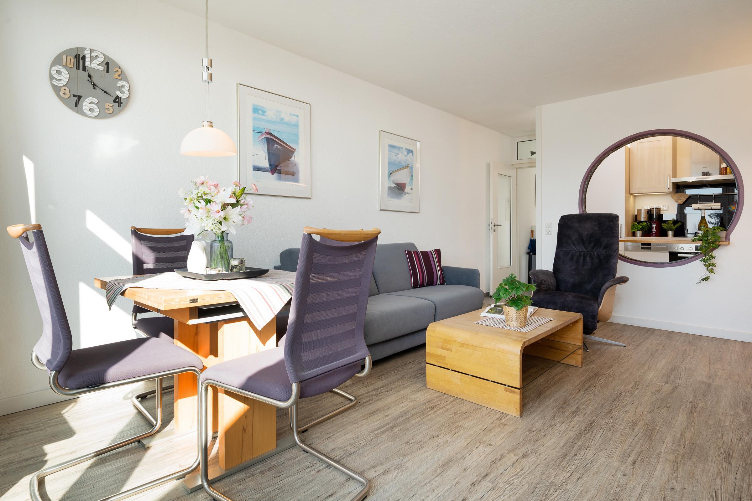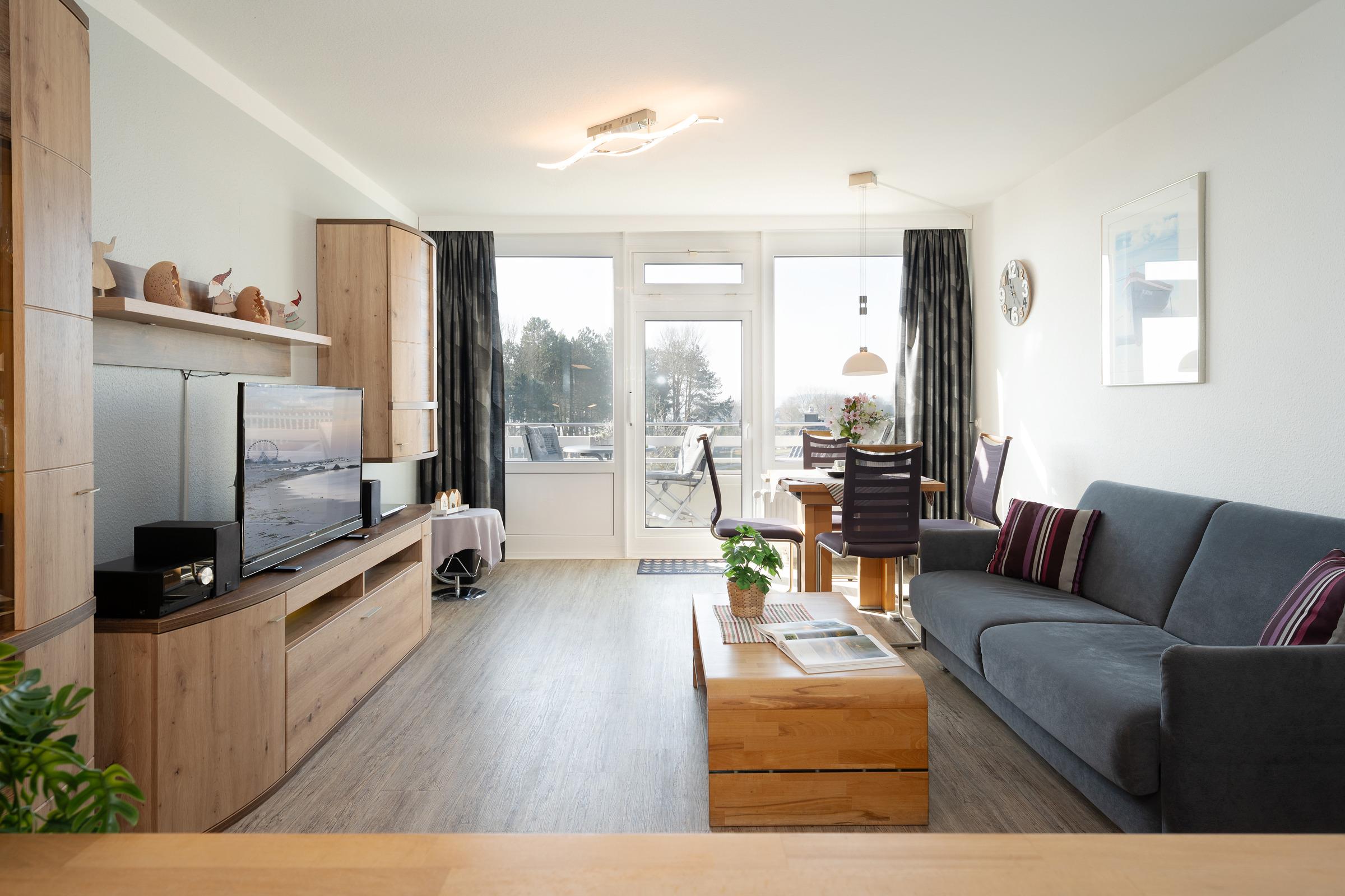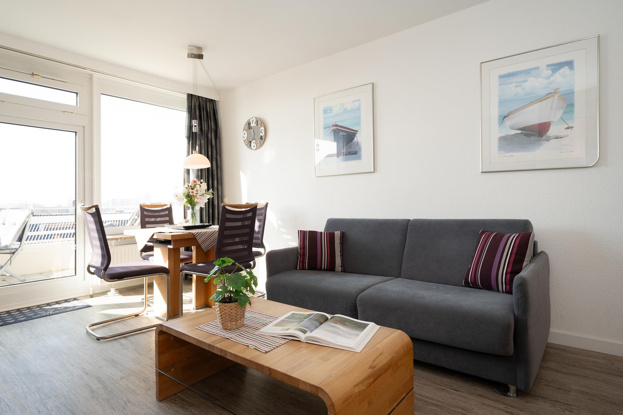 Ein geschmackvoll und gemütlich eingerichtetes Wohn-/ Esszimmer mit komfortabler Schlafcouch (in Komforthöhe, Liegefläche ca. 140x195 cm) und direktem Zugang auf den Balkon. Genießen Sie einen wunderbaren Ausblick vom möblierten und geschützten Balkon, eine ausfahrbare Markise schützt an sonnigen Tagen vor zu starker Sonneneinstrahlung.