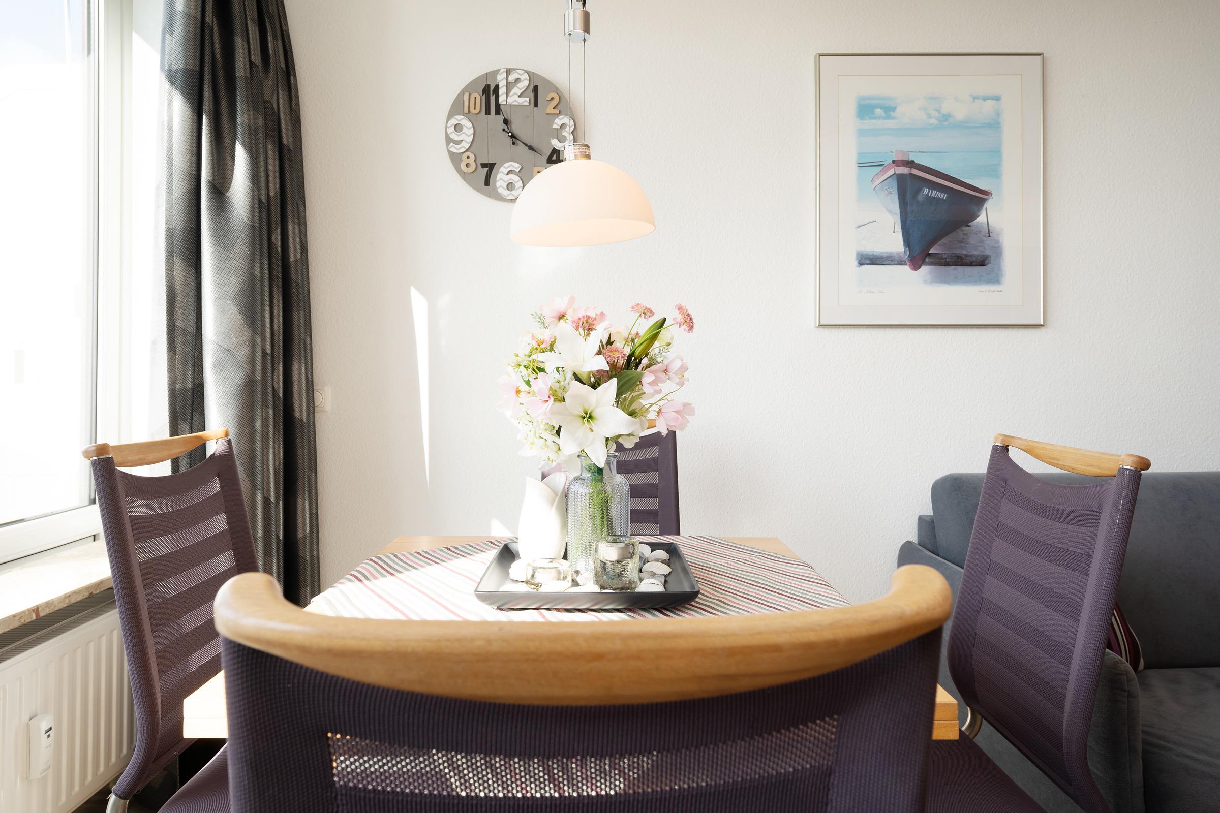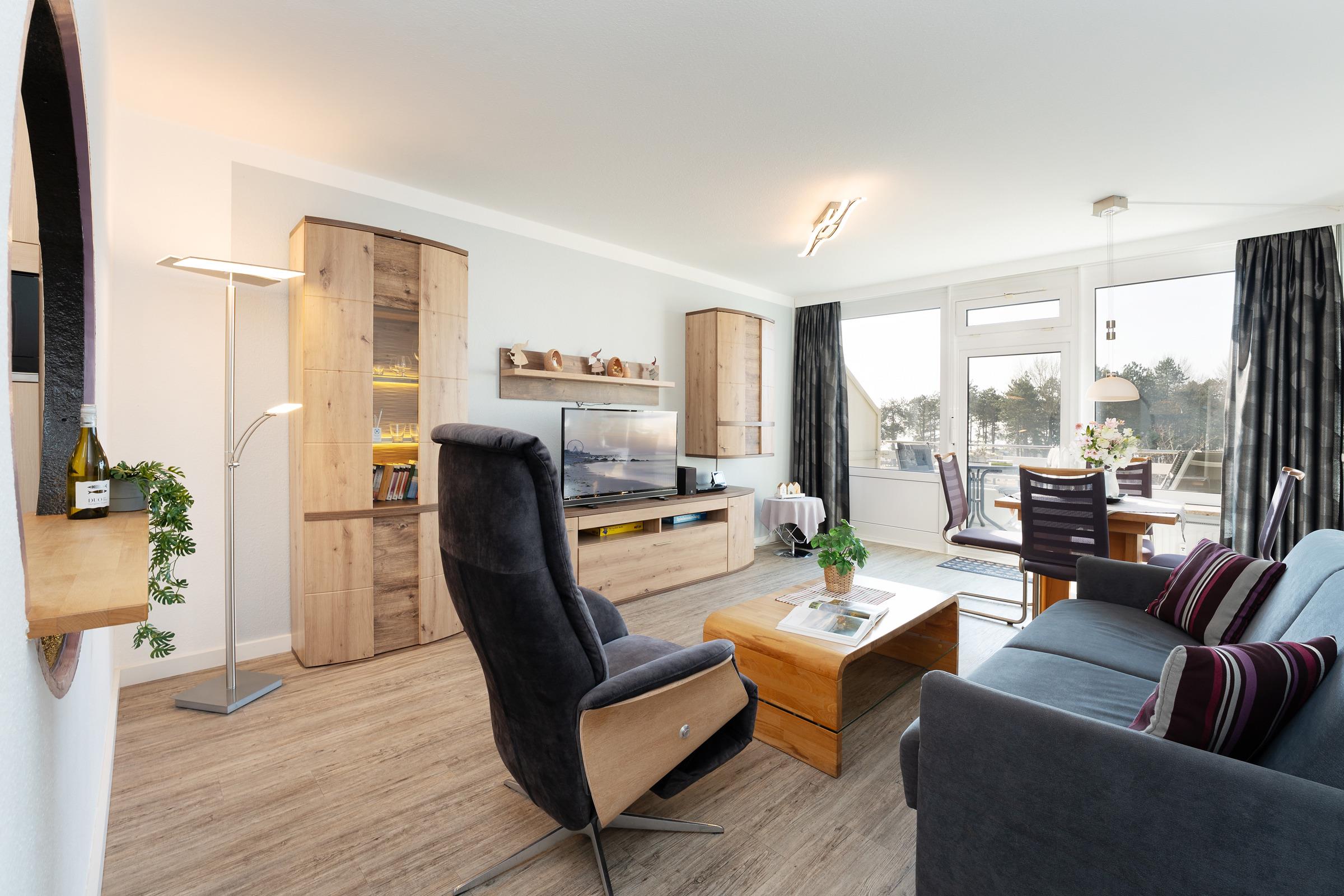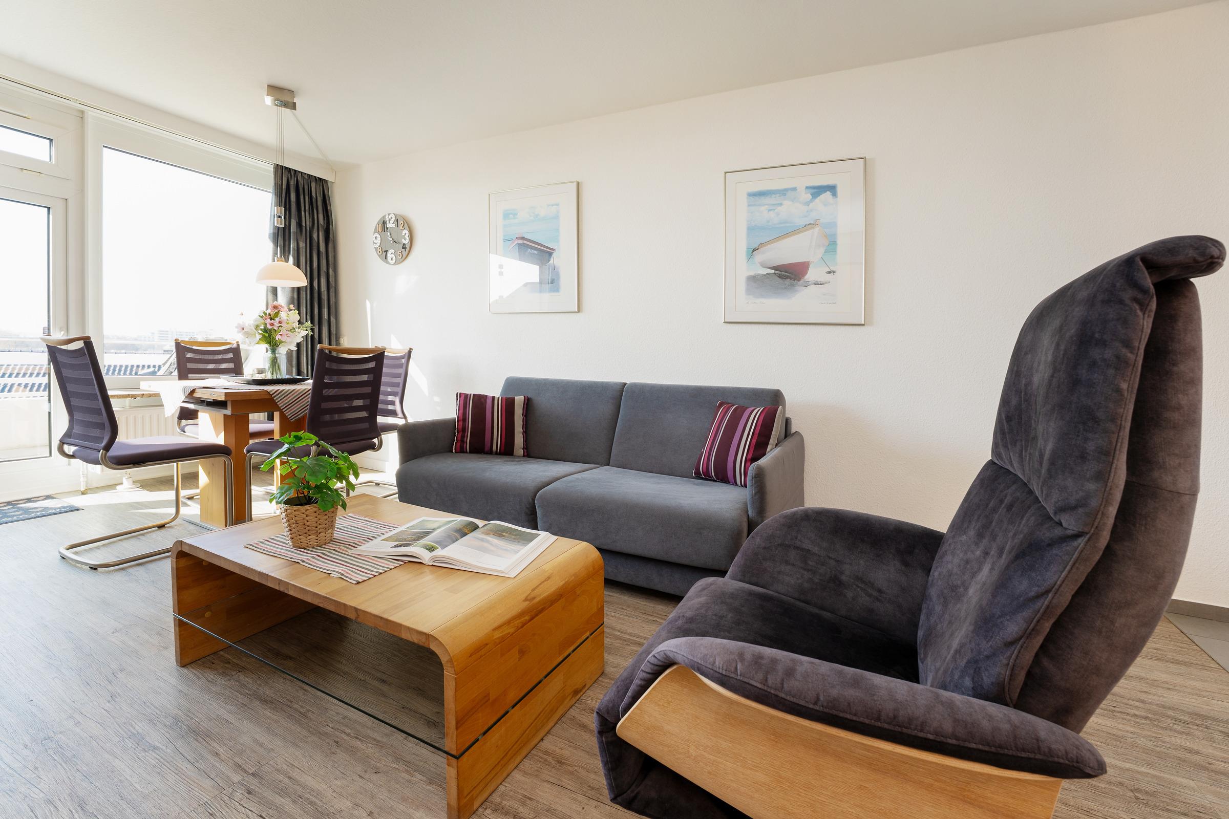 Ein geschmackvoll und gemütlich eingerichtetes Wohn-/ Esszimmer mit komfortabler Schlafcouch (in Komforthöhe, Liegefläche ca. 140x195 cm) und direktem Zugang auf den Balkon. Genießen Sie einen wunderbaren Ausblick vom möblierten und geschützten Balkon, eine ausfahrbare Markise schützt an sonnigen Tagen vor zu starker Sonneneinstrahlung.