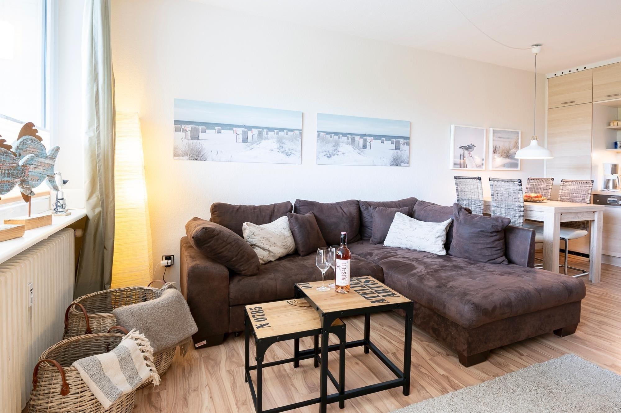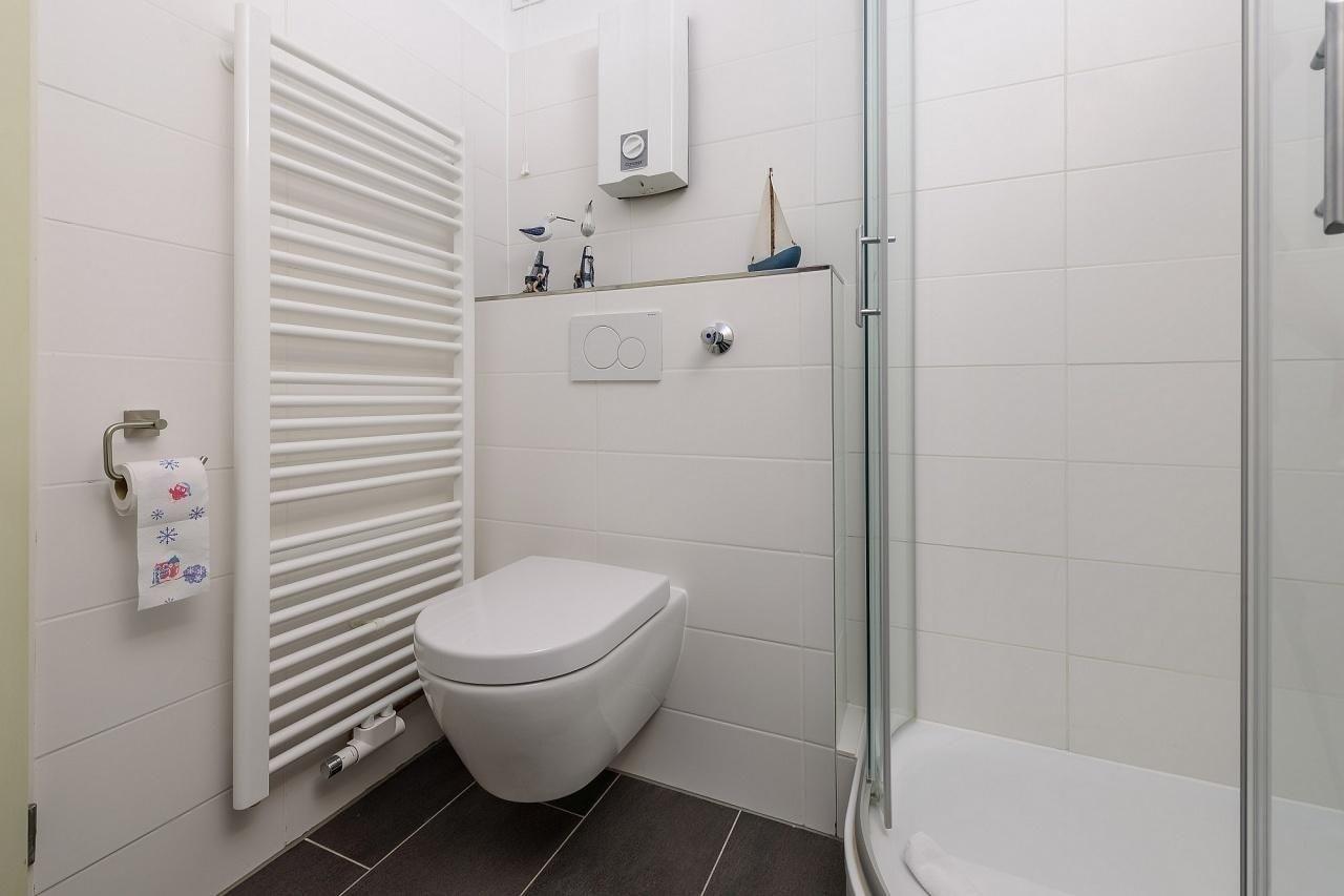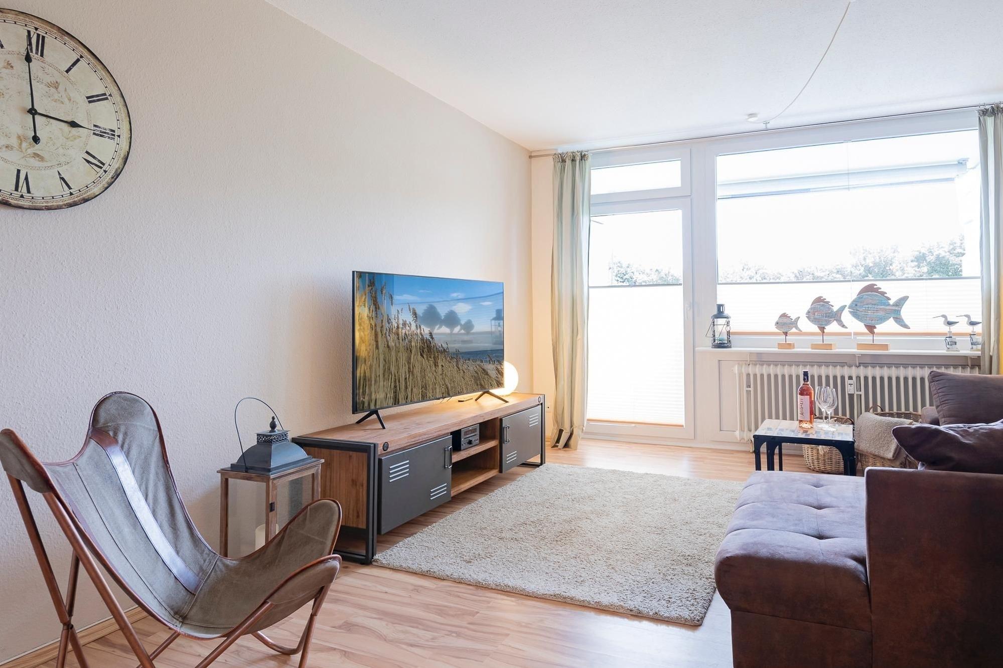 Ein lichtdurchfluteter, kombinierter Wohn-/Essraum mit stilsicher integrierter Küchenzeile und angrenzendem Essbereich für 4 Personen erwartet Sie. Die Küche verfügt über eine gute Grundausstattung inkl. kleinem, tragbaren Backofen für Ihre Urlaubsmahlzeiten - kochen Sie hier in geselliger Runde was das Herz begehrt! Im Wohnzimmer finden Sie eine bequeme Schlafcouch (200x200 cm) sowie einen modernen 55 Zoll Flachbildfernseher vor. Vom Balkon mit Südostausrichtung blickt man über die Dächer von Grömitz und in der Ferne blitzt sogar die Ostsee auf. Eine Markise sorgt für Sonnenschutz auf Ihrem geräumigen Außenbereich, wertige Lounge Möbel sorgen für Komfort - hier kann man am Abend bei einem guten Glas Wein angenehm entspannen oder morgens bei Sonnenschein frühstücken. Im separaten Schlafzimmer mit verdunkelnden Außenjalousien können es sich 2 Personen im Doppelbett bequem machen (140x200 cm, durchgängige Matratze). Im Wandschrank finden gibt es Stauraum für Ihre Ferienkleidung, zudem gibt es Im Schlafzimmer einen zweiten Flachbildfernseher, sowie einen Radiowecker. Das Duschbad ist ebenso geschmackvoll und stilsicher gestaltet, wie die gesamte Wohnung. Ein dunkler Fliesenboden im Kontrast zur weißen Ausstattung strahlt hochwertige Moderne aus, Annehmlichkeiten wie eine geräumige, halbrunde Eckdusche, sowie eine Handtuchwandheizung sorgen für gute Laune. Im Eingangs- /Flurbereich stehen weitere Einbauschränke mit viel Stauraum zur Verfügung.