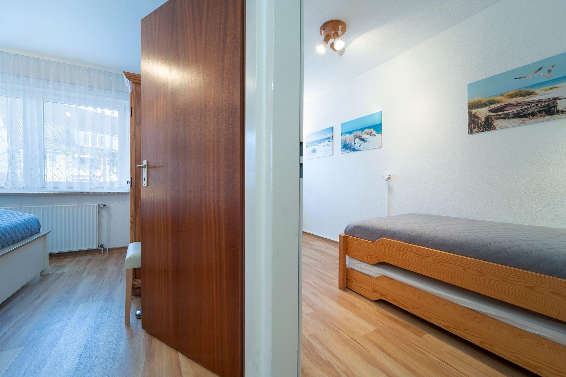 Das großzügige Wohnzimmer mit Flat-TV und Blu-Ray-Player sowie direkt angrenzendem Balkon liegt ruhig an einem Fußweg. In der voll ausgestatteten Küche finden Sie alles, was Sie für die Zubereitung von Mahlzeiten benötigen. Für die Nachtruhe stehen Ihnen ein Schlafzimmer mit Doppelbett (2x 90x200 cm) sowie ein Schlafzimmer mit Einzelbett, unter dem Sie noch ein weiteres Bett ausziehen können (je 90x200 cm) zur Verfügung. Die geschmackvolle Einrichtung der Wohnung lässt keine Wünsche offen.