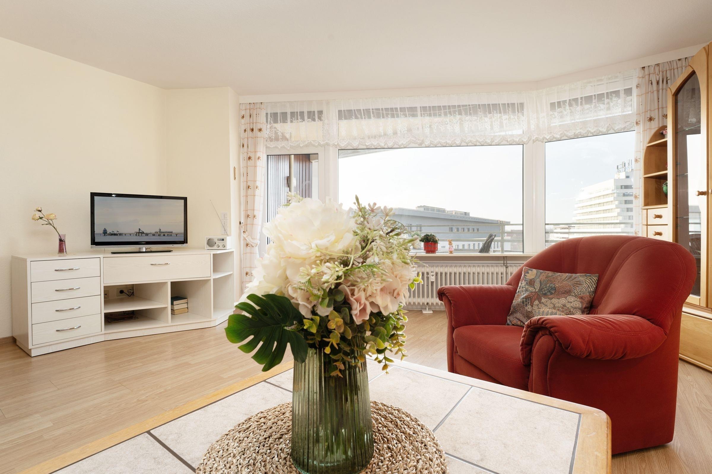 Verbringen Sie die schönsten Tage des Jahres in dieser liebe- und geschmackvoll eingerichteten 3-Zimmer Ferienwohnung im 7. Stock mit Balkon und seitlichem Meerblick sowie Aufzug und einer Wohnfläche von ca. 50 qm für bis zu 4 Personen.