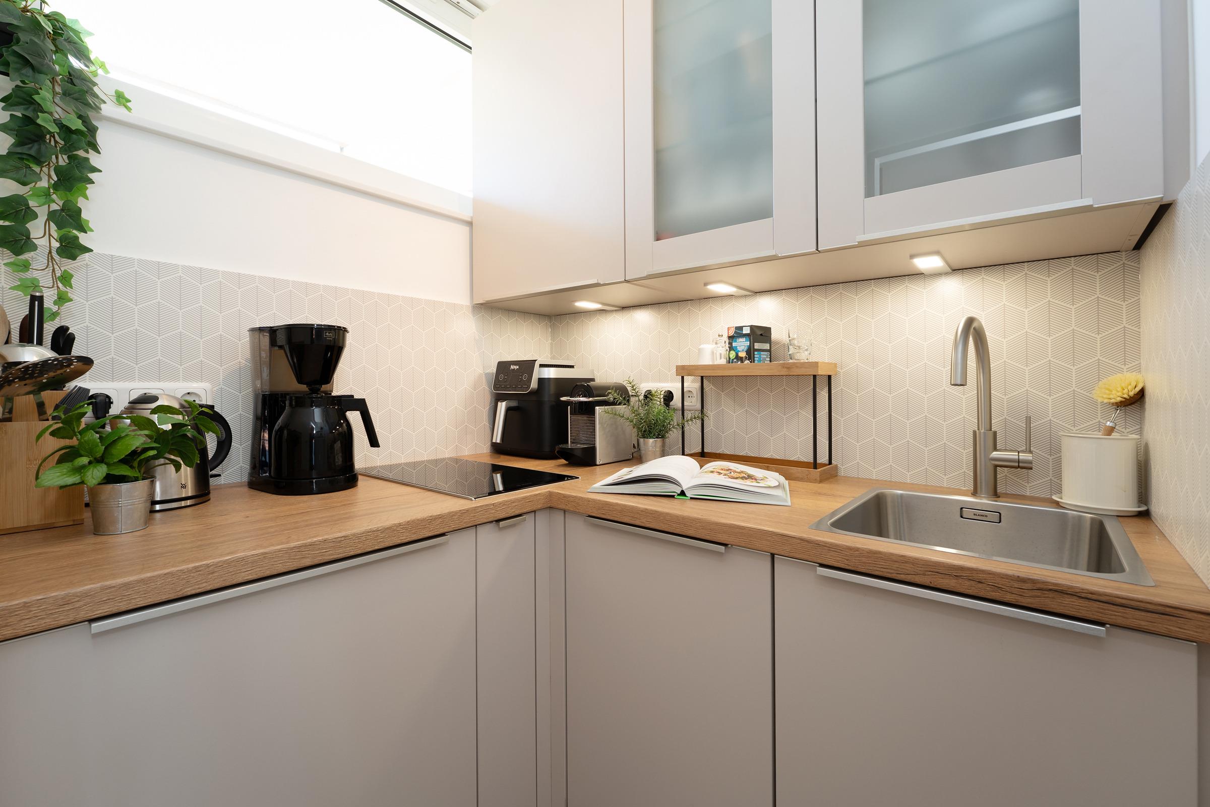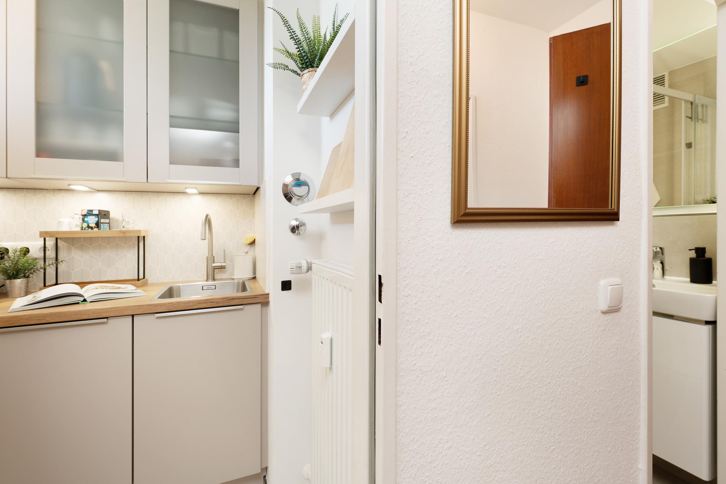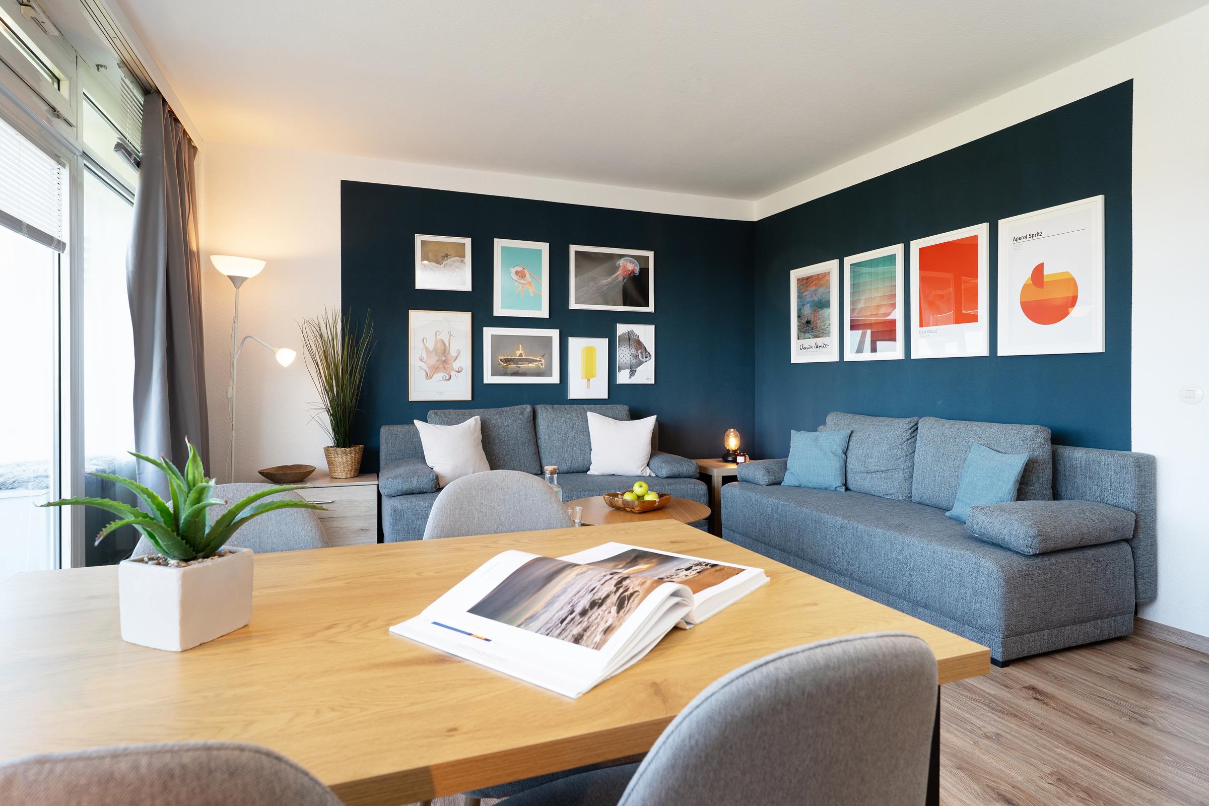 Ostsee pur! Diese wunderschöne Ferienwohnung liegt nur rund 50 Meter vom Strand entfernt und begrüßt Sie in einem meeresblauen Gewandt und mit einer liebevoll ausgesuchten Einrichtung. Auf der kuscheligen Sofalandschaft können Sie es sich gemütlich machen - genauso auf dem möblierten Balkon mit Südwestlage. Die kleine separate Küche ist mit Induktionsherd, Geschirrspüler, Heißluftfriteuse, Kaffee- & Nespressomaschine funktional ausgestattet und ermöglicht eine gute Selbstversorgung. Nach einem tollen Tag an der Ostsee können Sie für die Nacht die Schlafcouch im Wohnzimmer in ein Doppelbett (ca. 145x200 cm) umwandeln oder sie nutzen das Doppelbett (2x 80x200 cm) im Schlafzimmer. Im modernen Duschbad können sie sich nach einem ausgiebigen Strandtag in die vorgewärmten Handtücher einkuscheln.
