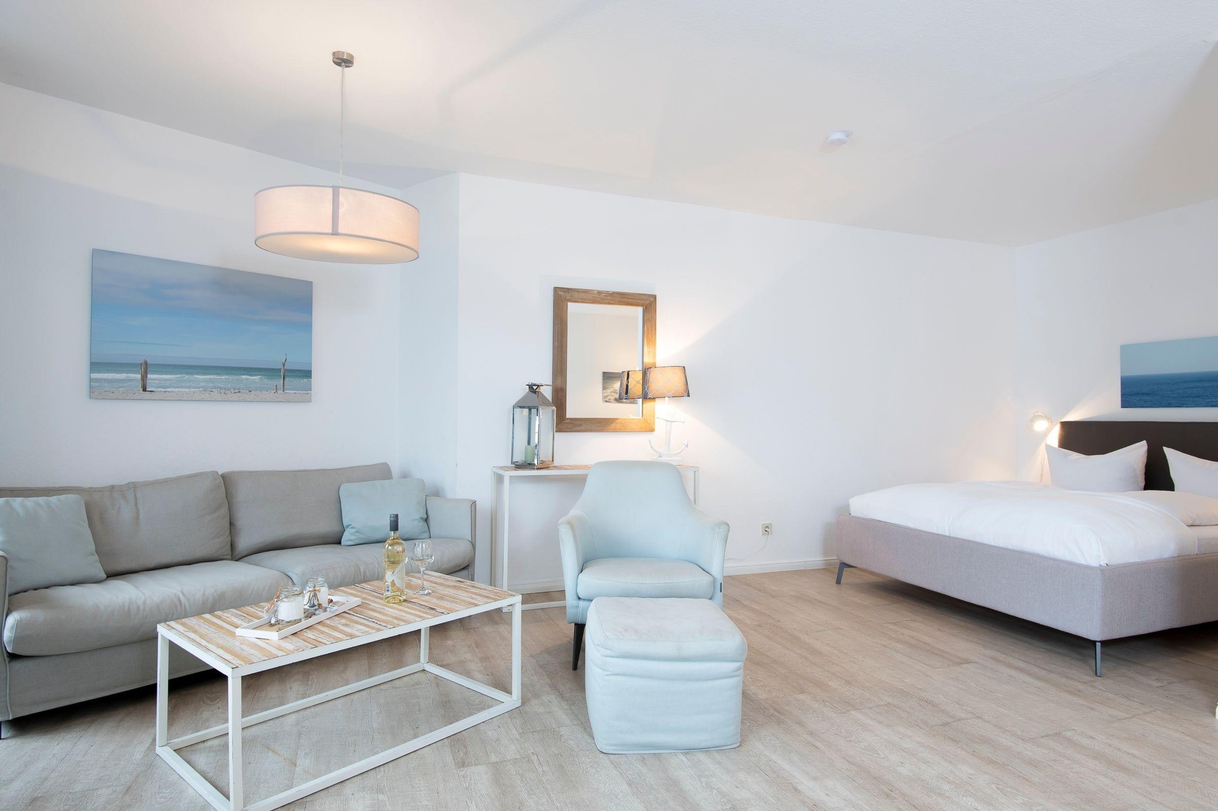 Zur Wohnung gehört ein großer Balkon, von dem man einen tollen Blick auf die Ostsee hat. Im Wohnzimmer erwartet Sie ein Fernseher und ein Radio und ein kostenloser WLAN Anschluss um immer Up to Date zu sein.