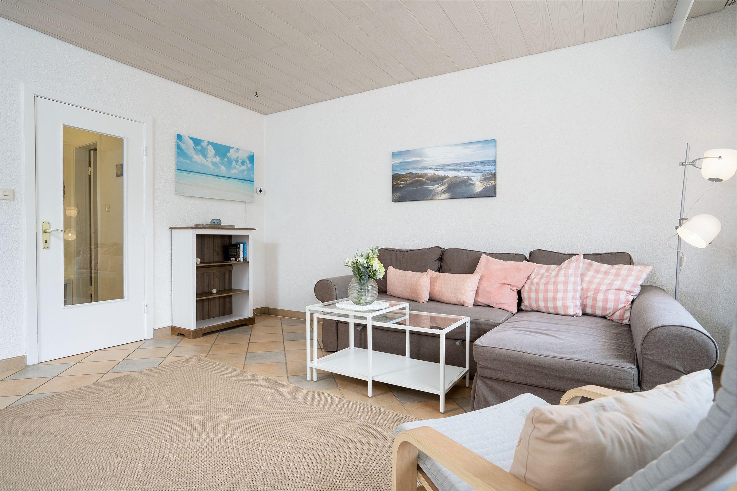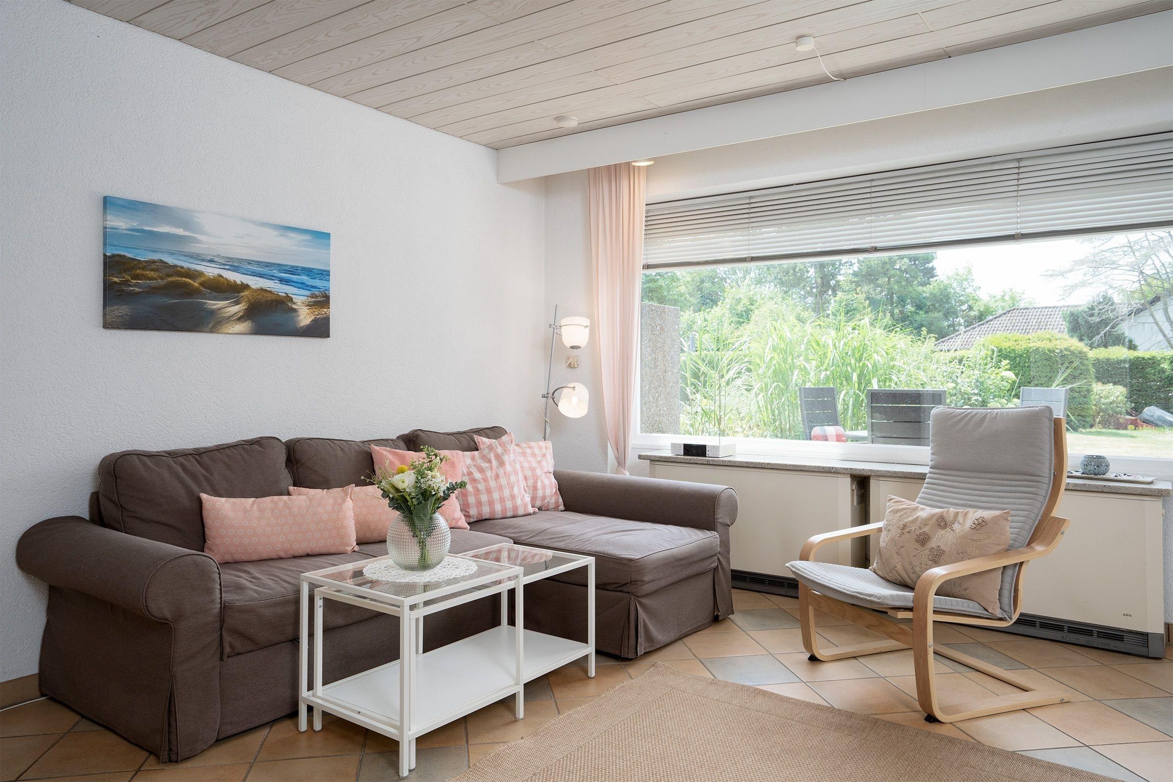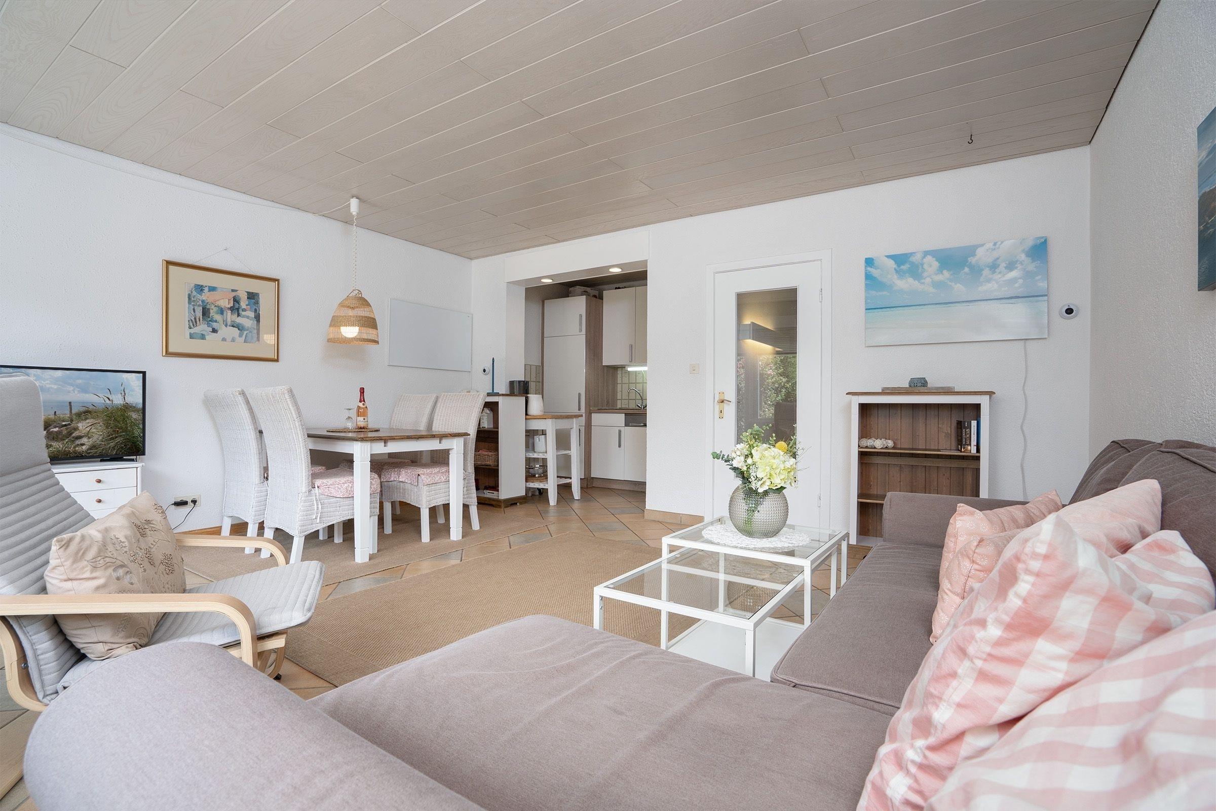 Das Herzstück dieser Ferienwohnung ist der offen gestaltete, lichtdurchflutete Wohn- und Essbereich mit integriertem Essplatz und moderner Küchenzeile. Ausstattungsmerkmale wie ein Backofen, Cerankochfeld und Spülmaschine erleichtern den Urlaubsalltag. Machen Sie es sich auf dem großzügigen Schlafsofa (2x 70x200 cm) bequem - Hier sorgt ein großer Flachbildfernseher für Unterhaltung. Von hier aus geht es direkt auf die große, möblierte Terrasse mit Blick ins Grüne und eigenem, kleinen Gartenbereich. Starten Sie hier den Tag mit dem ersten Kaffee am Morgen oder genießen abends stilvolle Sundowner, eine Markise schützt hier an sonnigen Tagen vor zu starker Sonneneinstrahlung. Das separate Schlafzimmer verfügt über ein Doppelbett (2x 90x200 cm). Das hell geflieste Badezimmer ist mit Dusche, WC, Waschbecken und beleuchtetem Spiegelschrank klassisch eingerichtet. Der Fußboden der Ferienwohnung ist komplett mit Fliesen ausgelegt. Außenjalousien sorgen für angenehme Verdunklung. Der WLAN-Anschluss ist für Sie inklusive.