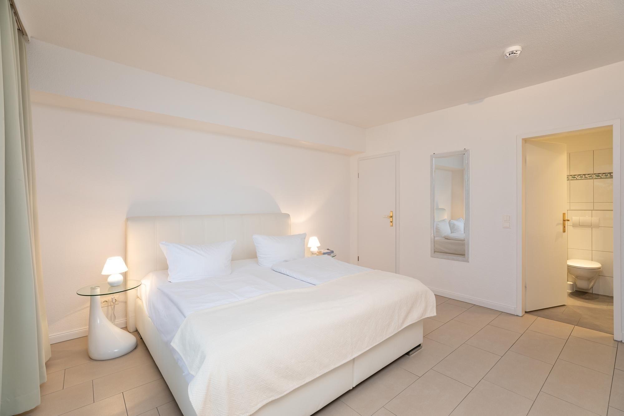 Schlafzimmer: 1 Boxspringbett (180x200 cm), Kleiderschrank, eigenes Bad, Verdunkelung (Gardinen), durchgehender Topper