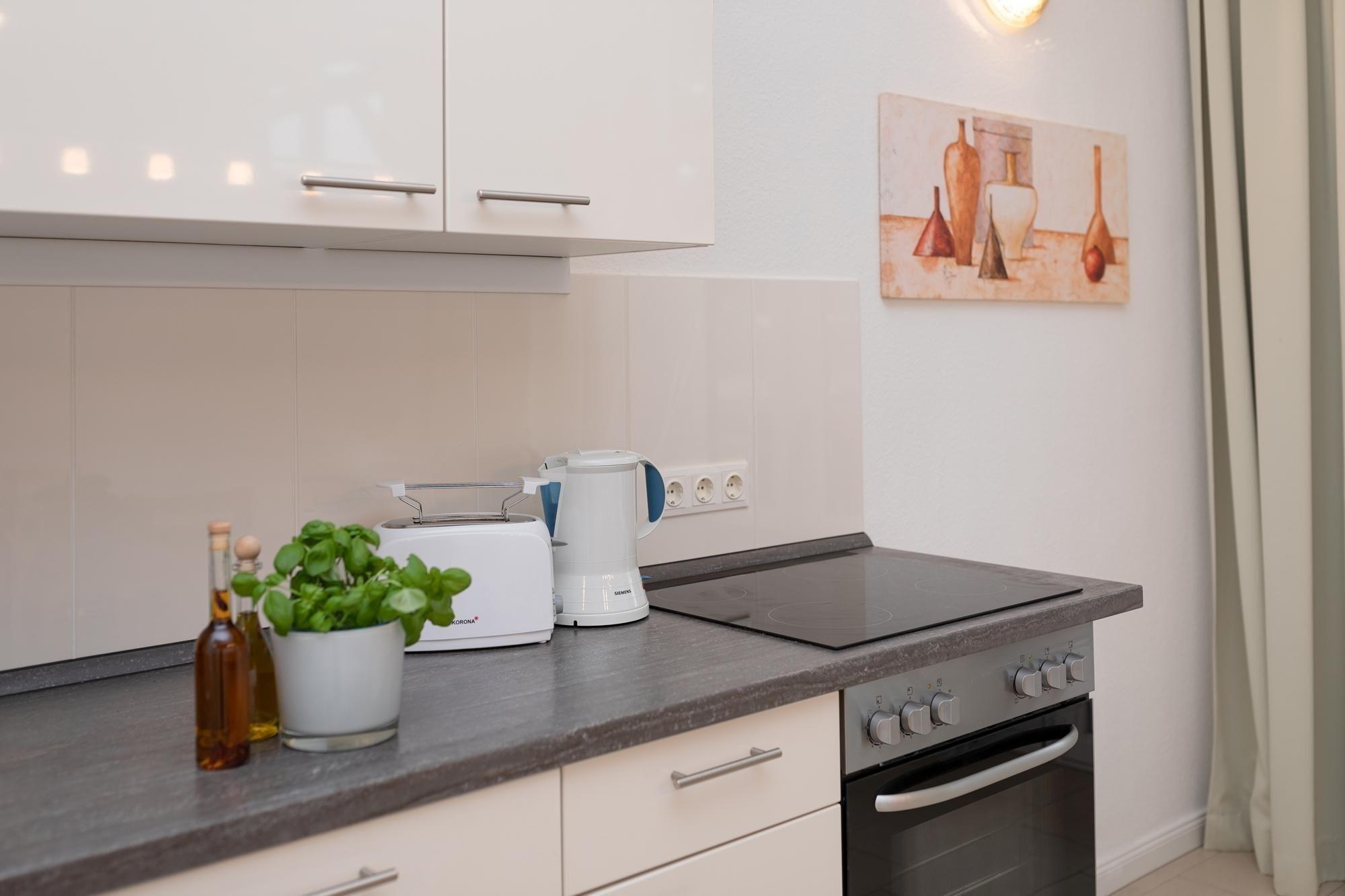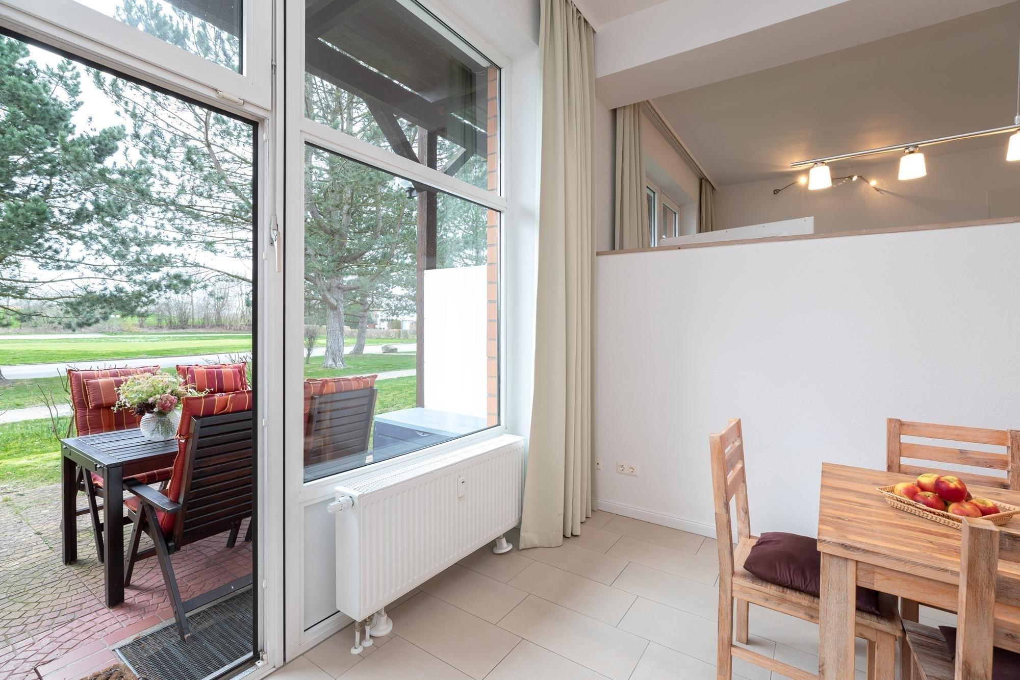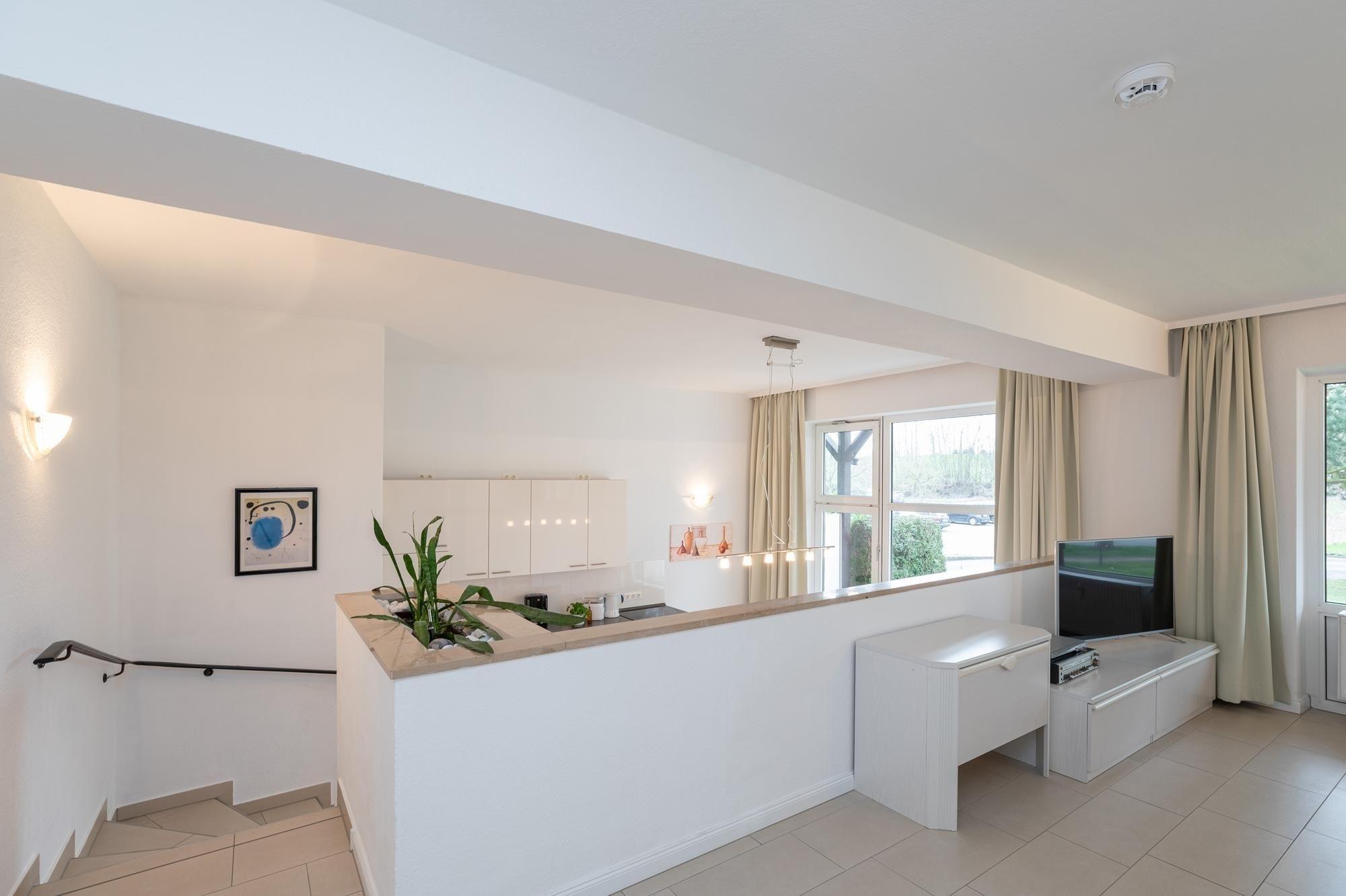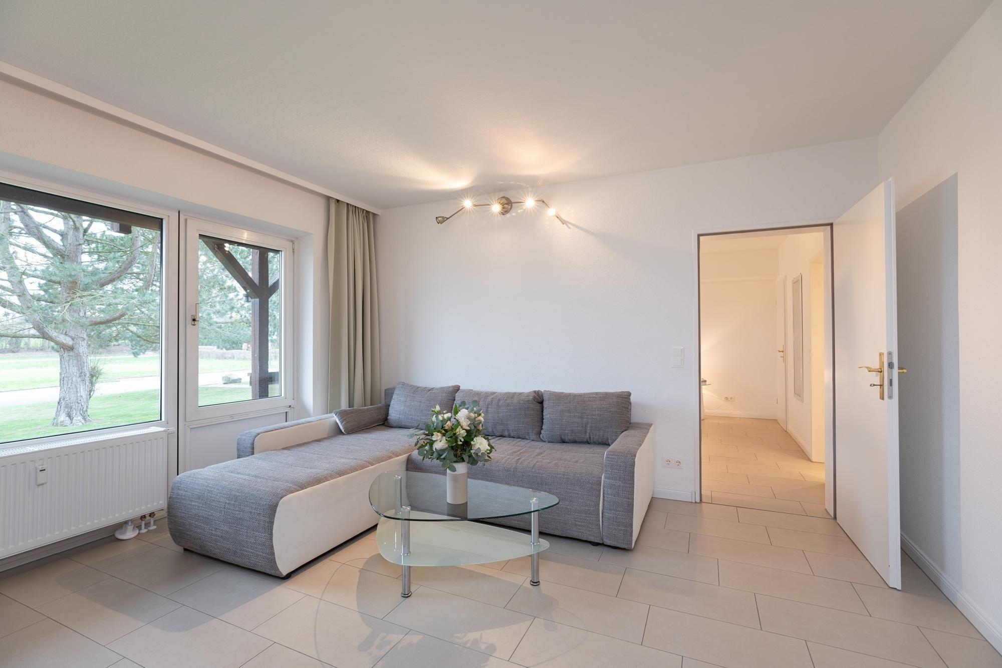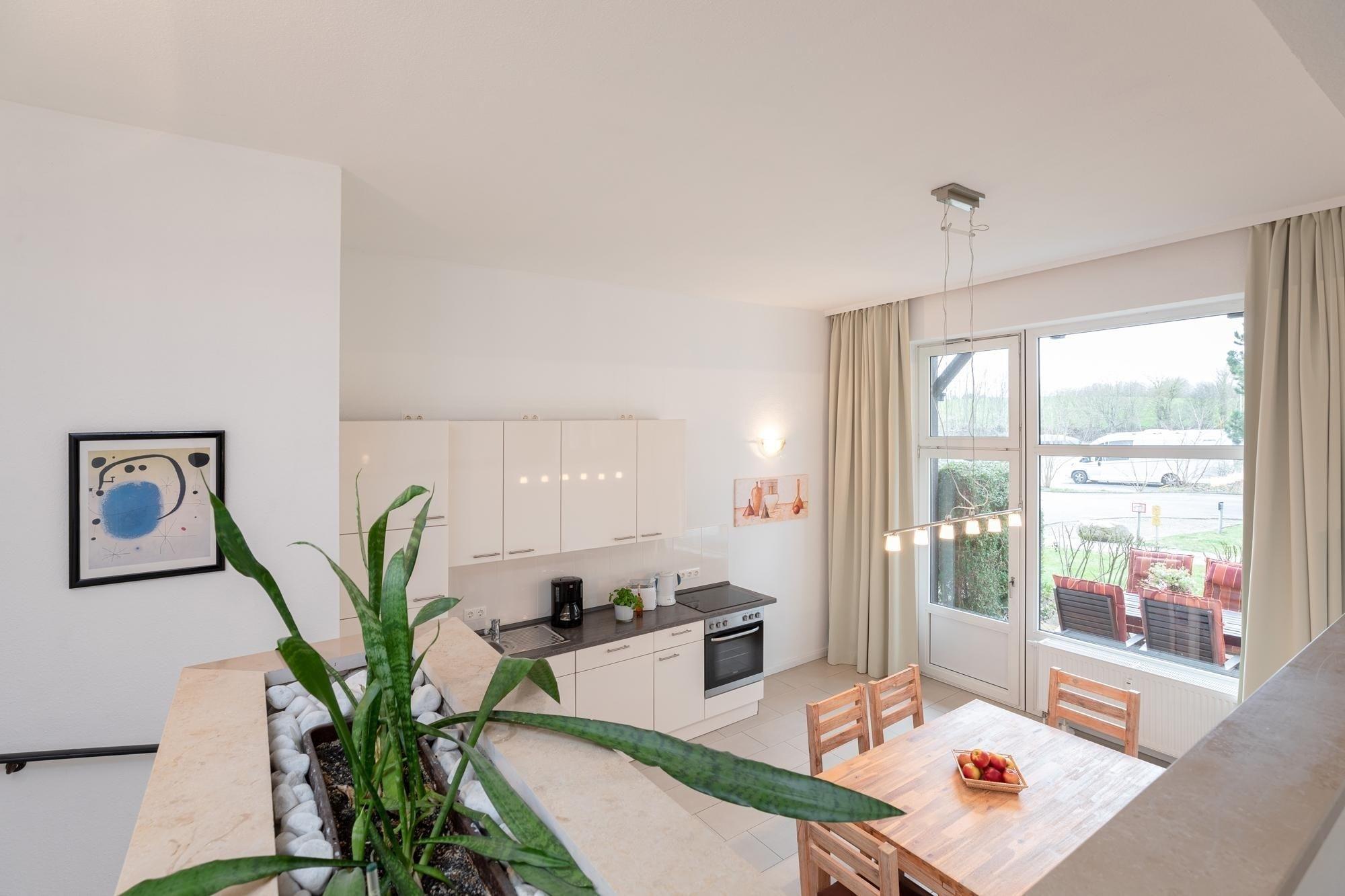 Im Wohnbereich erwarten Sie ein großzügiges und hochwertige Ecksofa mit Schlaffunktion (140x200 cm), für Unterhaltung sorgt der Flatscreen TV. Das separate Schlafzimmer verfügt über ein bequemes Doppelbett (180x200 cm), Nachtisch und Leselampe, sowie einen herrlichen Blick in grüne Baumwipfel. Angrenzend an das Schlafzimmer befindet sich das hell geflieste Bad, hier lässt es wunderbar in der Badewanne entspannen. WC, beleuchteter Spiegelschrank und praktische Handtuchheizung sorgen für alltäglichen Komfort. Vom Wohnbereich führen einige Stufen in den hellen und einladenden Küchenbereich hinunter. Moderne Annehmlichkeiten wie 4-Platten-Ceranherd, Backofen und Spülmaschine erleichtern den Urlaubsalltag, der Blick ins Grüne vom gemütlichen Essplatz sorgt für gute Laune. Treten Sie von hier aus direkt auf die möblierte Terrasse, umsäumt von Heckenrosen. Diese Wohnung überzeugt durch wertige Ausstattung, harmonische Farben und Materialien mit individueller Eleganz und angenehmem Wohnambiente.