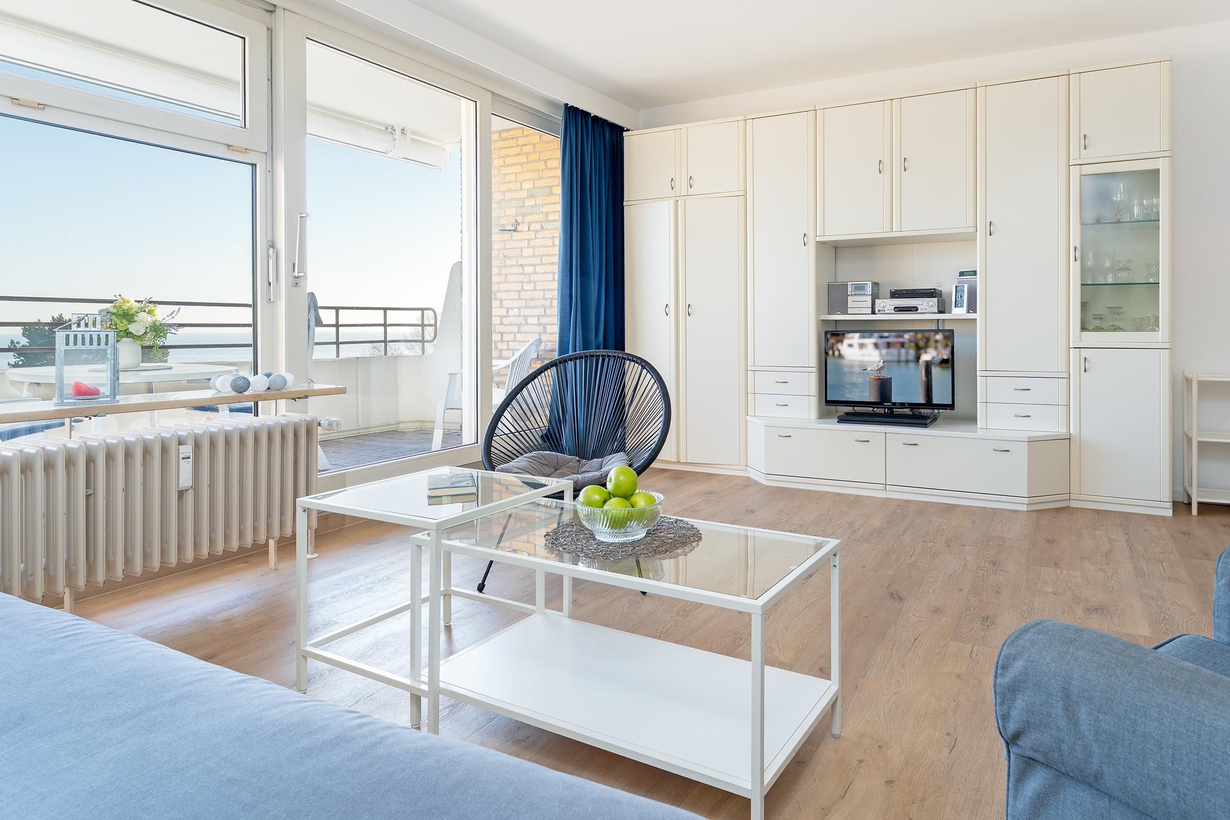 Hier gibt es ein Schlafzimmer mit 2 Einzelbetten (je 90x200 cm) und ein Schlafsofa (160x200cm) im Wohnzimmer. Der große Balkon mit direktem Meerblick lädt zum Frühstück in der Morgensonne ein! Beginnen Sie hier Ihren unvergesslichen Urlaub. Eine kleine Küche, ein Duschbad sowie ein PKW-Stellplatz runden diese schöne Ferienwohnung ab.