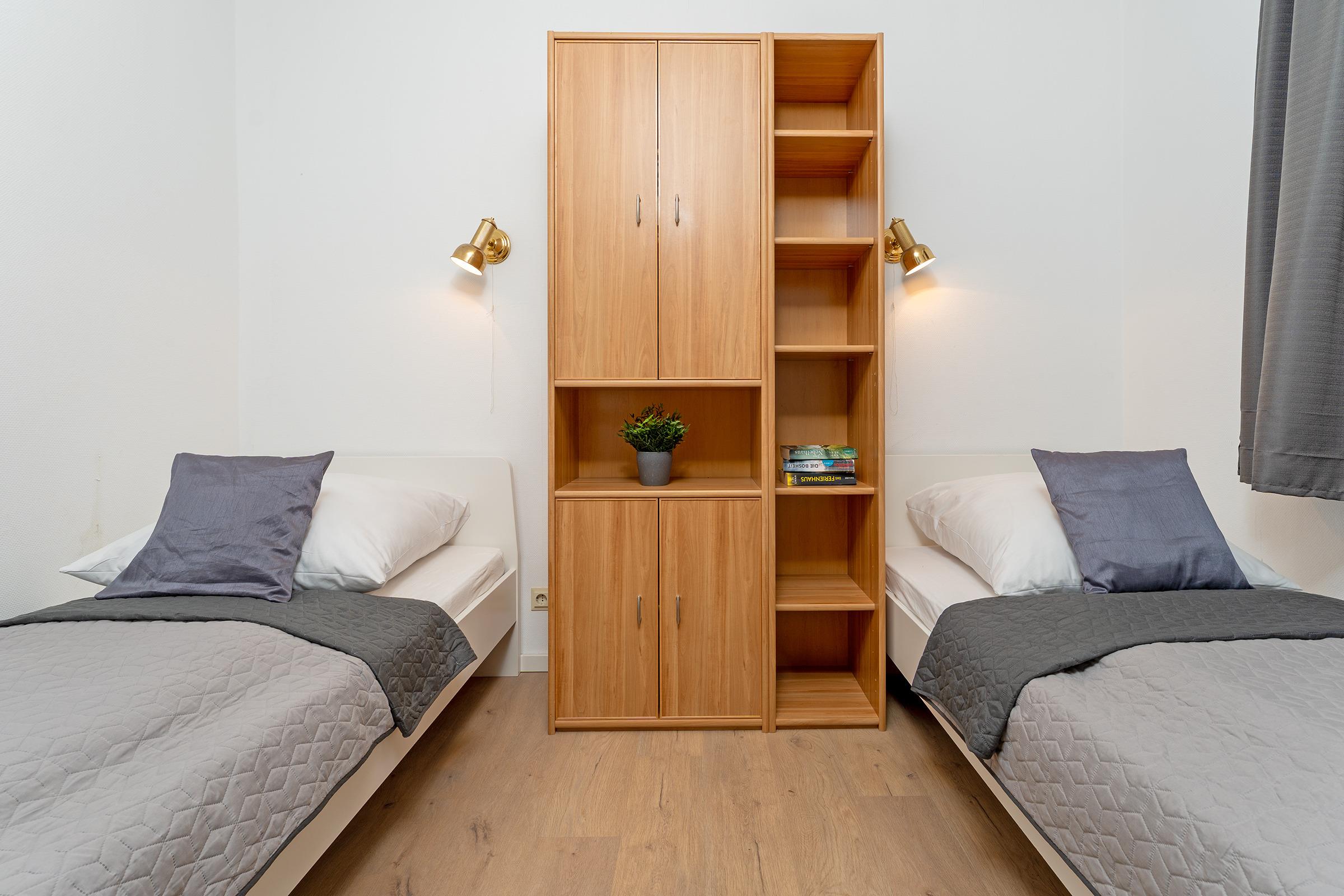 Schlafzimmer: 2 Einzelbetten (je 90x200 cm), Kleiderschrank, Verdunkelungsmöglichkeit