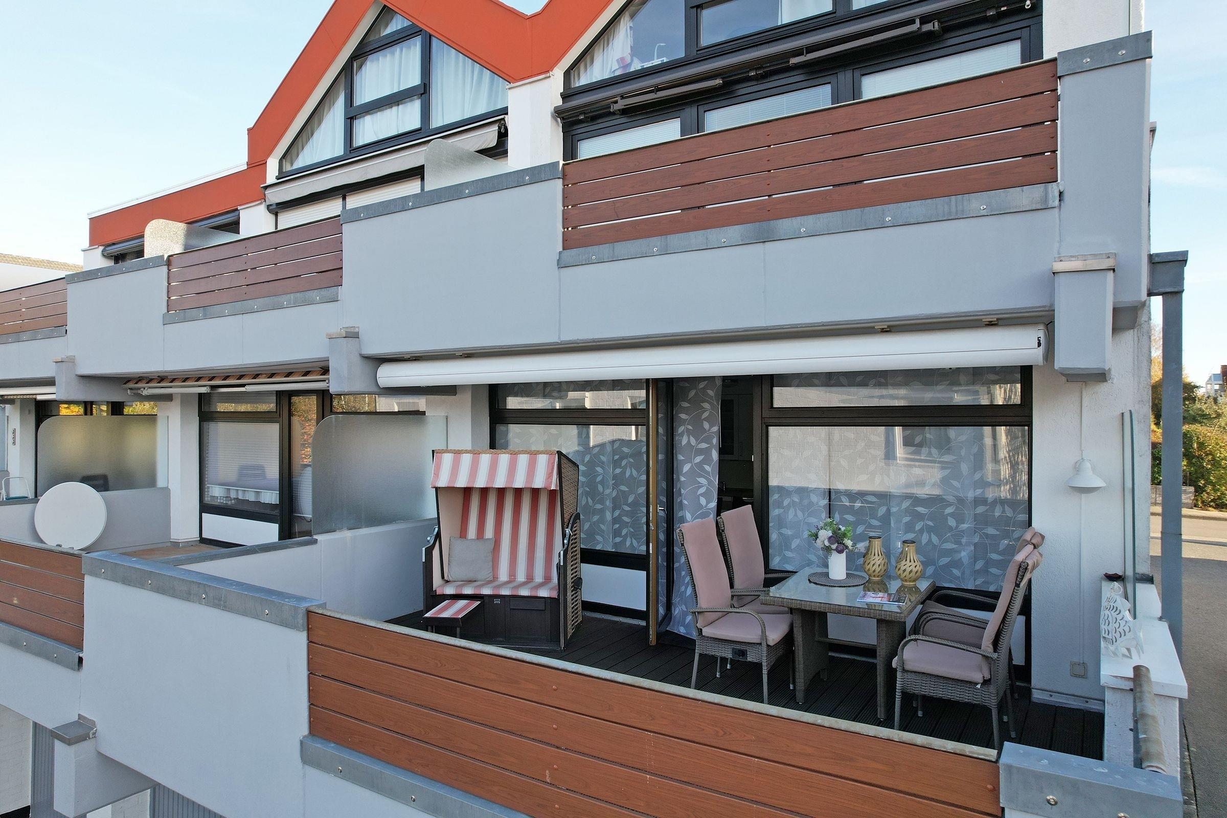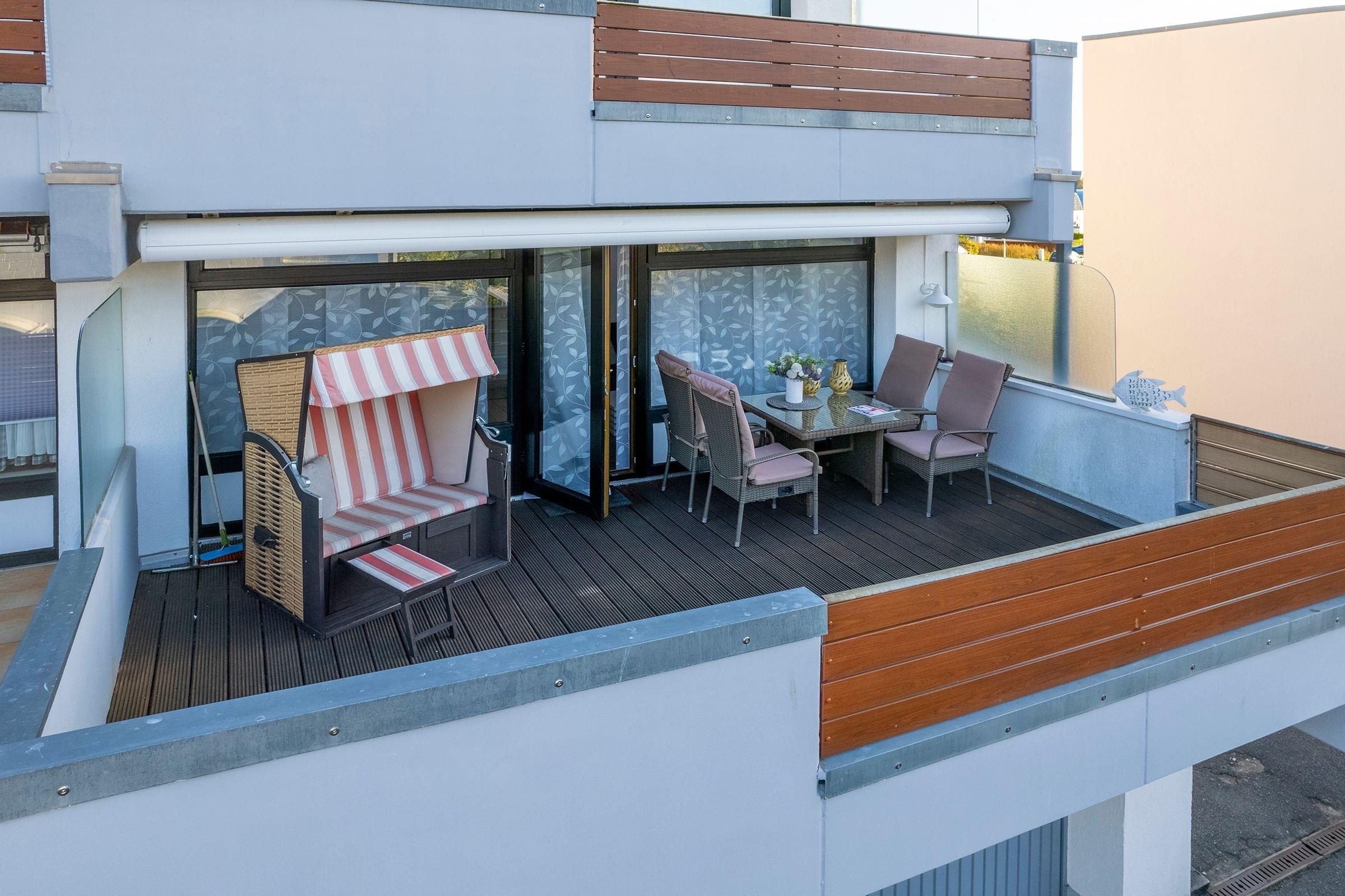 Diese moderne, ca. 49 m² große 3-Zimmer-Ferienwohnung in Hanglage bietet Ihnen eine ca. 20 m² große Holzterrasse mit Strandkorb und Markise, die für Erholung sorgt.