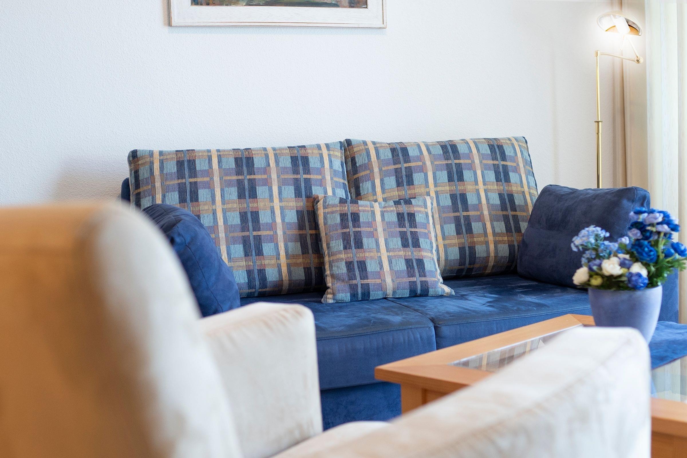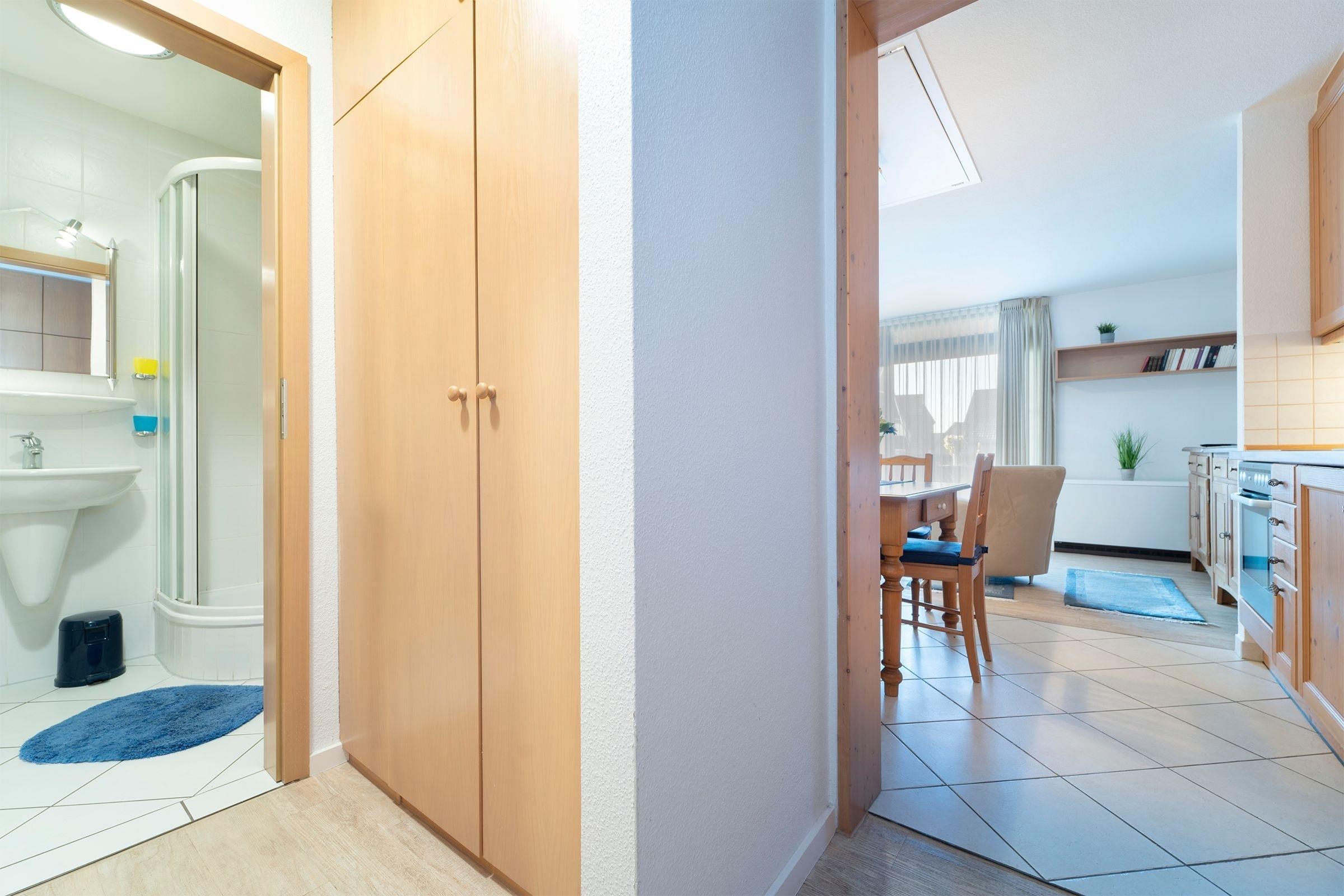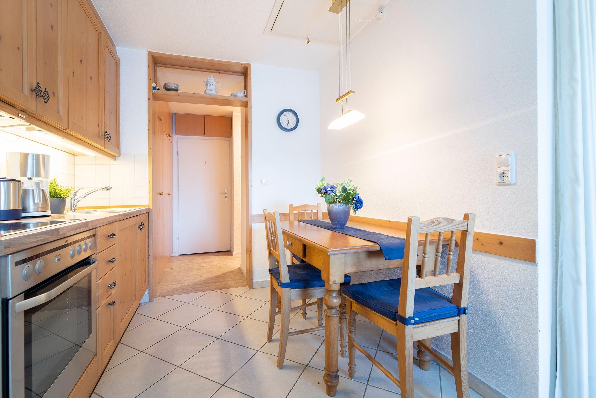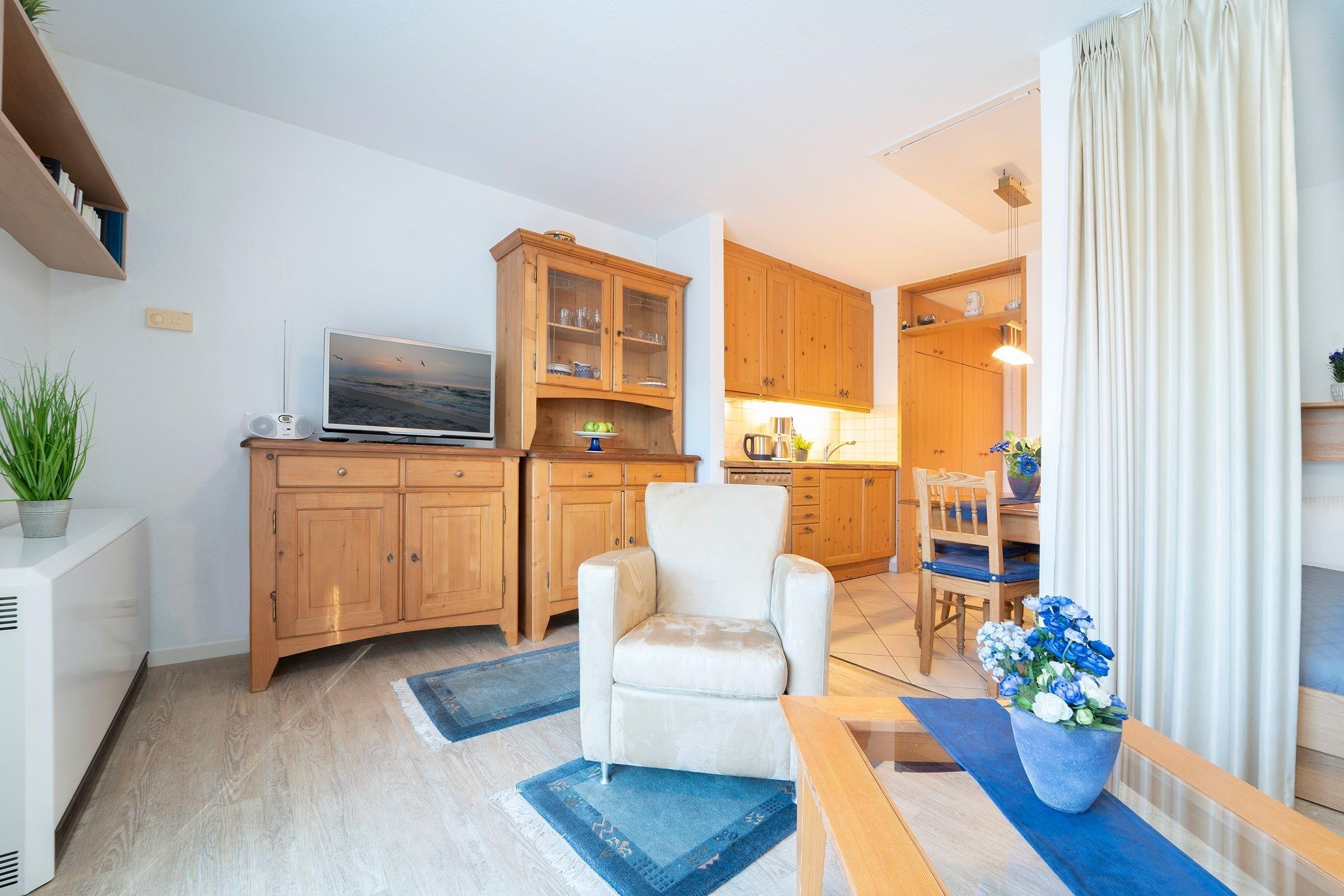 Auf kleinem Raum ist an alles gedacht worden. Der Wohn-/Ess- und Schlafbereich ist optisch smart untergliedert. Auf gemütlichem Sofa und Sessel verbringen Sie gesellige Abende vor dem Fernseher oder bei Musik aus der Stereoanlage. Der schöne, rustikale Balkon ist gen Südwesten ausgerichtet, so dass Sie bei einem Glas Wein die Sonne bis in den Abend hinein genießen können. Hinter einem Vorhang versteckt laden 2 Einzelbetten (2x 90x190 cm) zum Träumen ein. In der niedlichen Küche können Sie sich dank Cerankochfeld und Backofen, Kühlschrank mit Gefrierfach, Kaffeemaschine, Wasserkocher und Toaster mühelos selbst kulinarisch verpflegen. 2 Personen können hier an einem kleinen Esstisch gemütlich sitzen. Ein hell gefliestes Duschbad rundet die Ausstattung dieser Ferienwohnung ab.