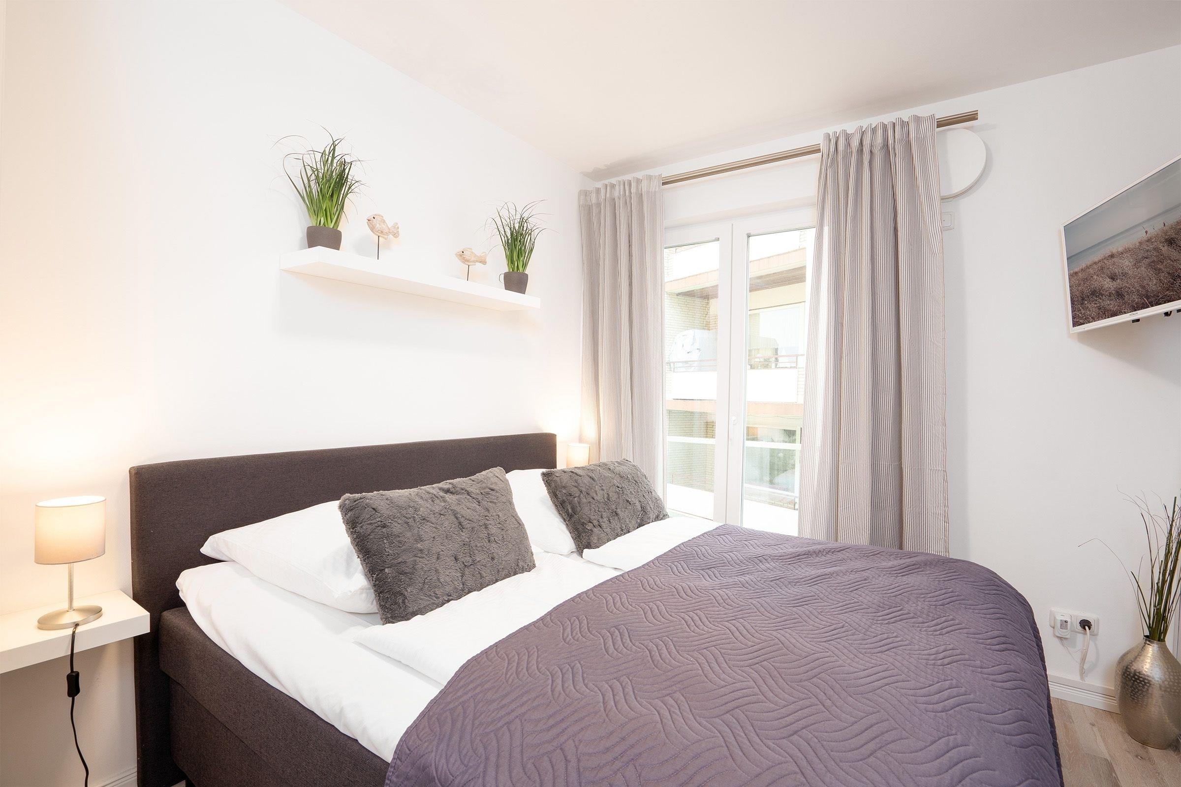 Schlafzimmer 1: 1 Doppel-Boxspringbett (180x200 cm), Verdunkelung (Plissee, Vorhänge, Gardine)
