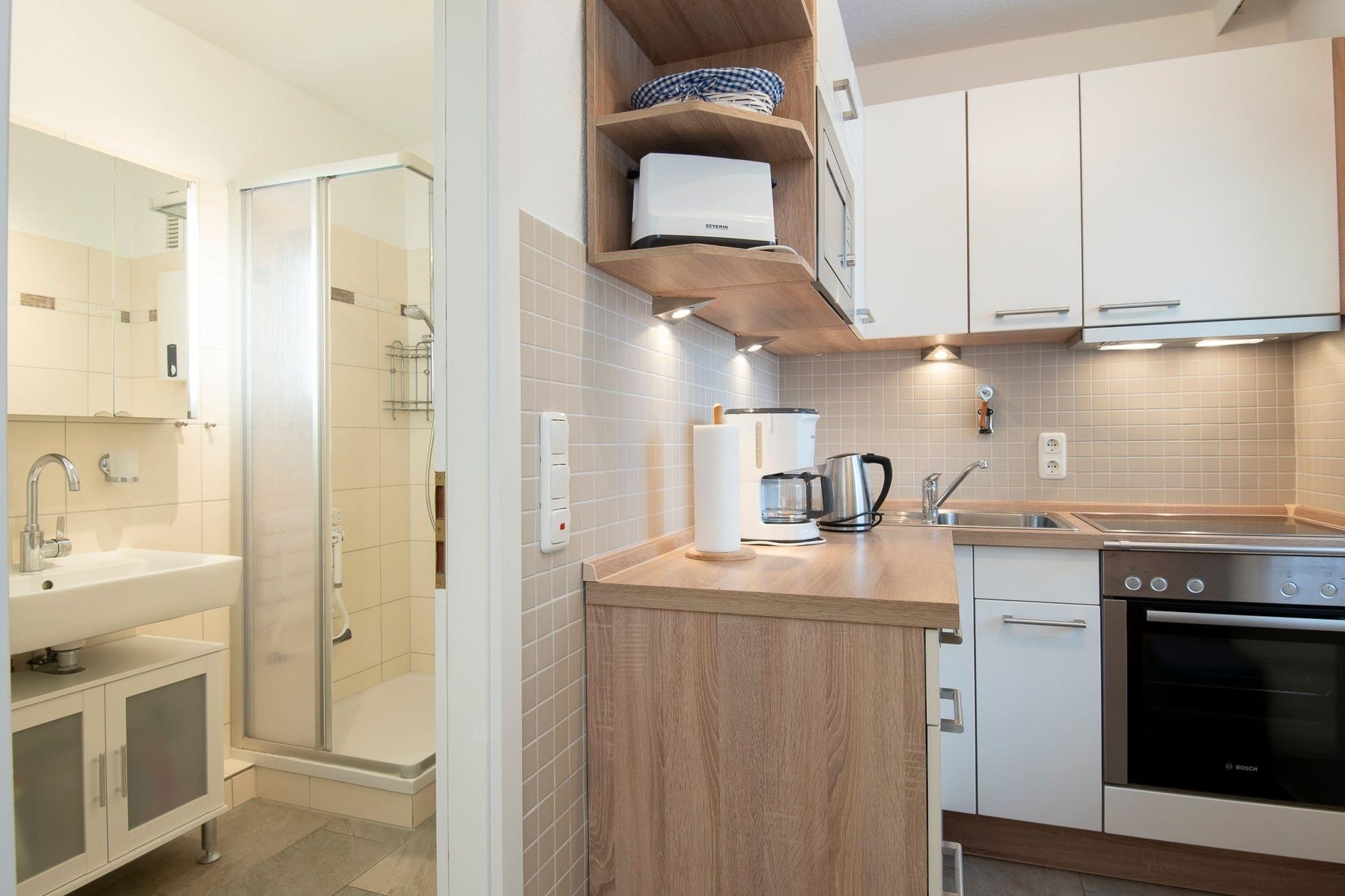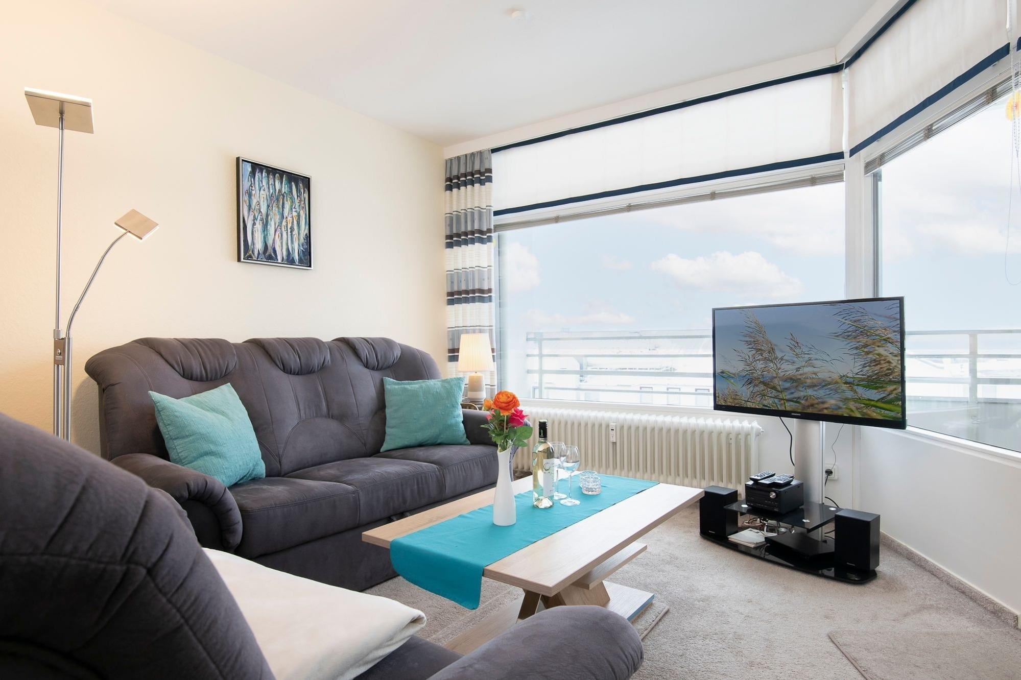 Vom Flur aus gelangen Sie in die Küche, in der Sie alles finden, was Sie brauchen, um sich kulinarisch auszutoben wie z. B. Backofen, Geschirrspülmaschine, Mikrowelle und vieles mehr. Im hell gefliesten Duschbad befindet sich neben der üblichen Ausstattung eines Bades (Dusche, WC, Föhn etc.) auch eine Waschmaschine. Vom Flur aus gelangen Sie auch in das kleine, separate Schlafzimmer. Hier finden Sie ein Schlafsessel für 1 Person (ca. 90x200 cm) sowie genügend Platz und Schränke vor, um Ihr Gepäck und Ihre Kleidung unter zu bringen. Im Wohn-/ Esszimmer mit Laminatboden erwartet Sie eine gemütliche Wohnecke mit Flachbild-TV und moderner Stereoanlage (Bluetooth). Ein renovierter und hochwertig möblierter Balkon schließt sich an, von hier können Sie das Meer sehen. Die Couch ist nutzbar als Schlafmöglichkeit für 1 Person (Breite ca. 120 cm). Vom Wohnzimmer aus gelangen Sie auch in den offenen Schlafbereich. Hier können Sie es sich im Doppelbett (2x 90x200 cm) gemütlich machen.