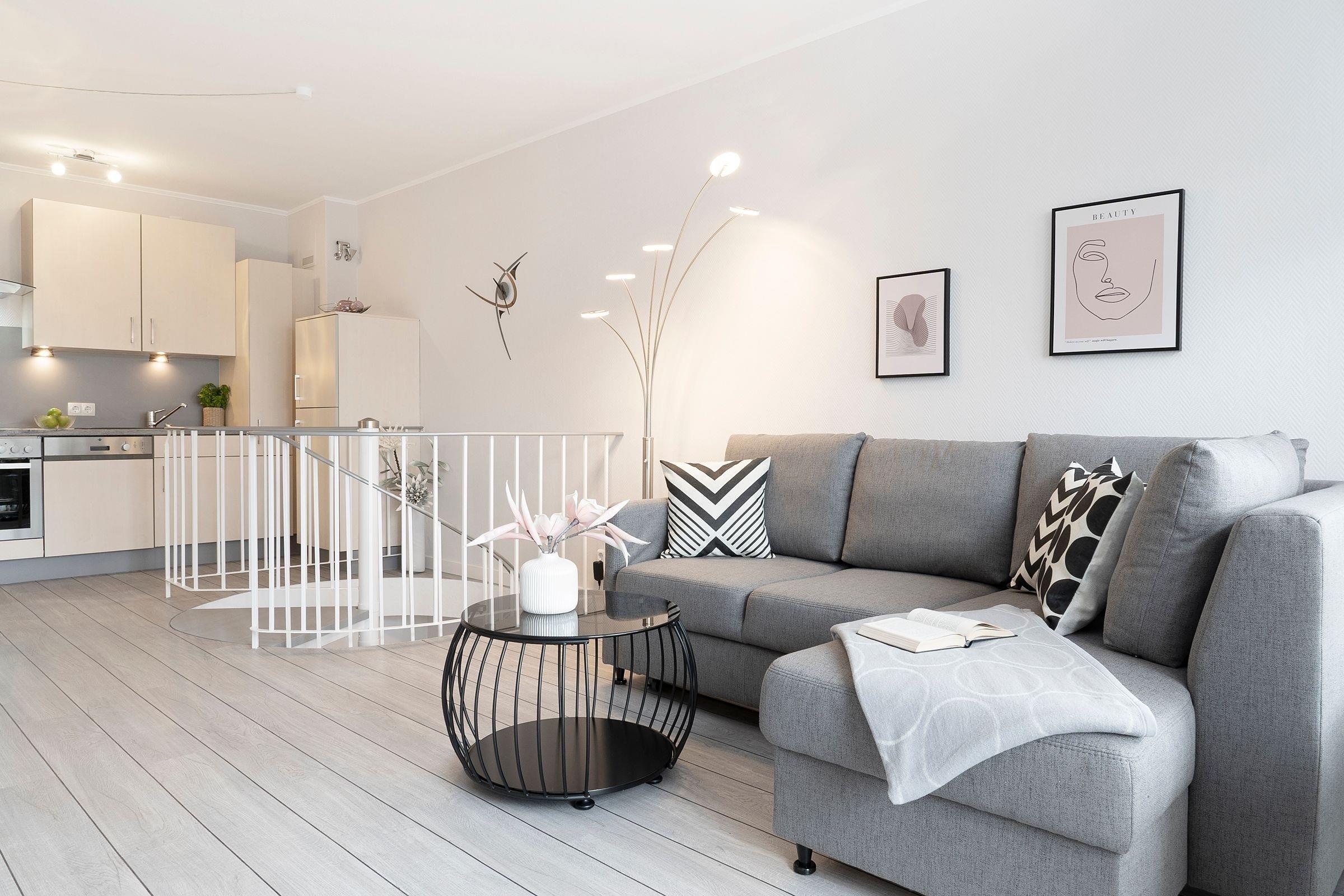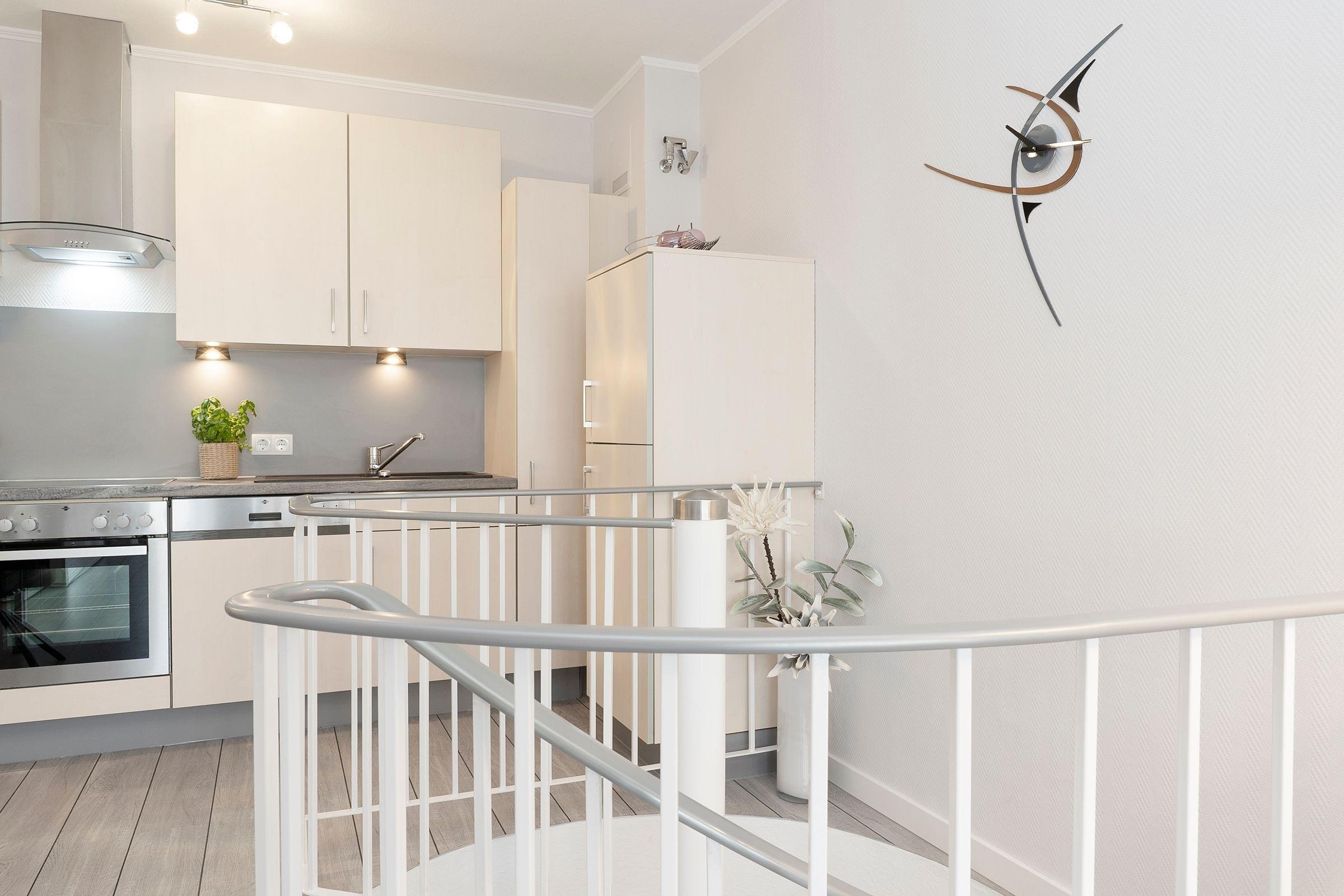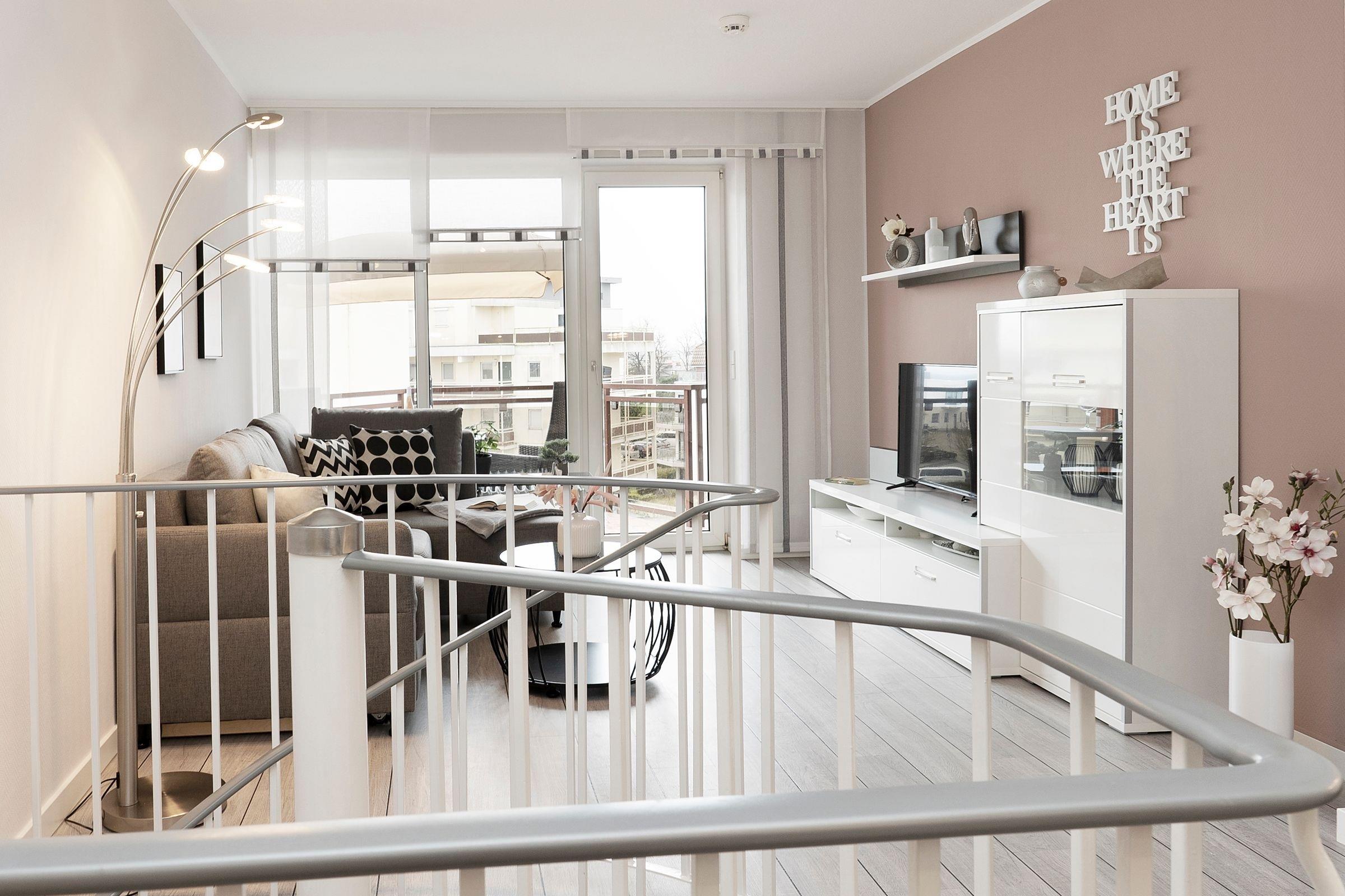 Von einem kleinen Flur gelangen Sie in das Schlafzimmer, in dem ein komfortables Doppelbett (2x 90x200 cm) darauf wartet, Ihnen traumhafte Nächte zu bescheren. Auf dem eigenen Balkon können Sie den Tag direkt nach dem Aufstehen mit gesunder Ostseeluft begrüßen. Ihre Urlaubsgarderobe verstauen Sie bequem im großen Kleiderschrank. Auf dieser Ebene befindet sich außerdem das moderne Duschbad. Über eine Wendeltreppe erreichen Sie den individuell gestalteten Wohnbereich, der viel Raum für eine erholsame Auszeit bietet. Auf dem gemütlichen Sofa können Sie die Seele baumeln lassen. Ein TV-Gerät, eine Hifi-Anlage und ein kostenloser WLAN-Anschluss sorgen für Unterhaltung. Außerdem erwartet Sie eine offene Küche mit separatem Essplatz. Der Ceranherd mit Backofen, Kühlschrank inkl. Gefrierfach, Spülmaschine und weitere Annehmlichkeiten werden Sie begeistern. Bereiten Sie sich doch einen fangfrischen Ostseefisch in Ihrer Unterkunft zu. Diesen können Sie dann auf dem möblierten Balkon mit seitlichem, saisonalen Blick auf die Ostsee und einem Glas Wein genießen. Die gesamte Wohnung ist durch Außenjalousien verdunkelbar.