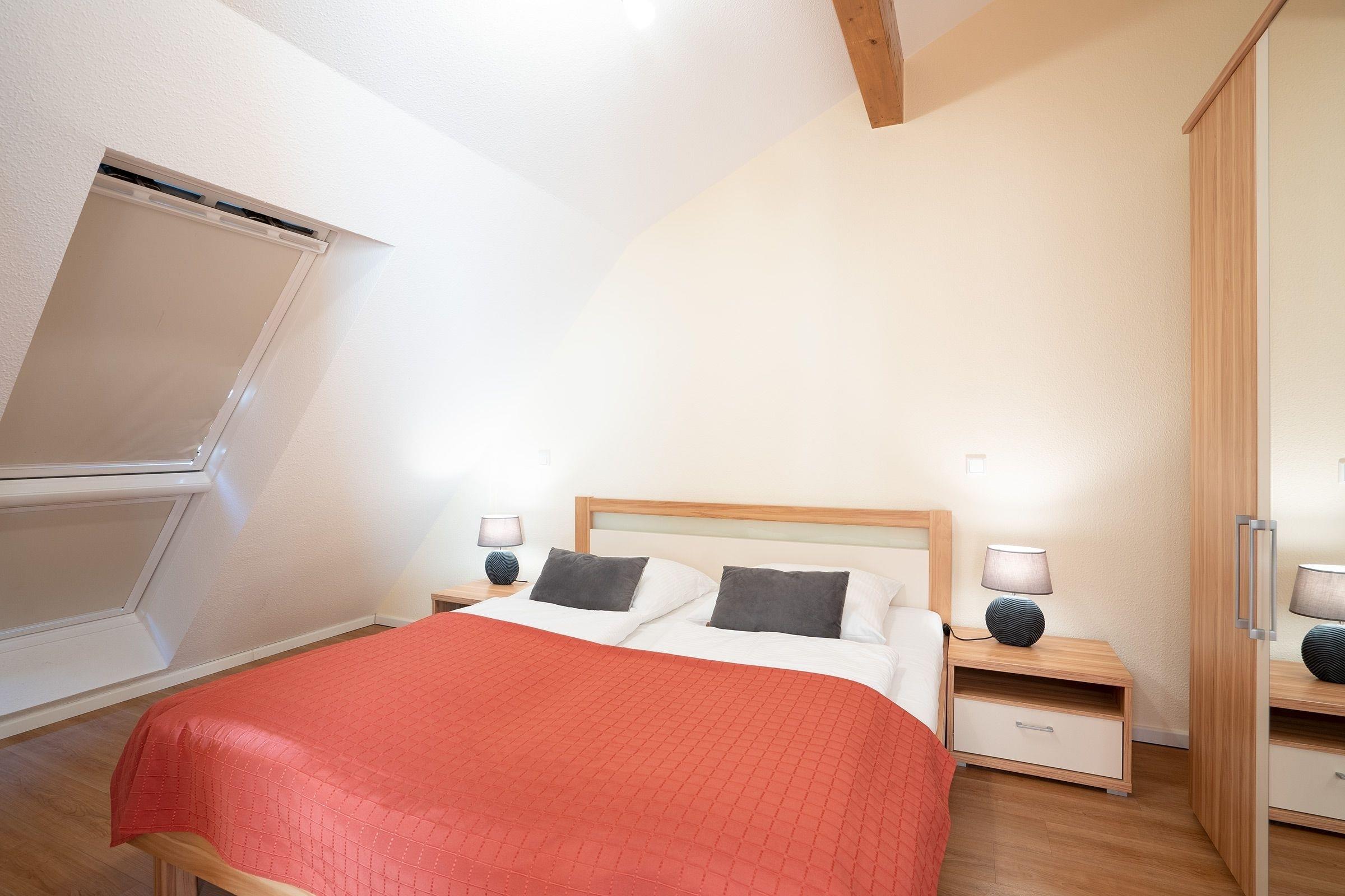 Schlafzimmer 1: 1 Doppelbett (2x 90x200 cm), blickdichte Plissees
