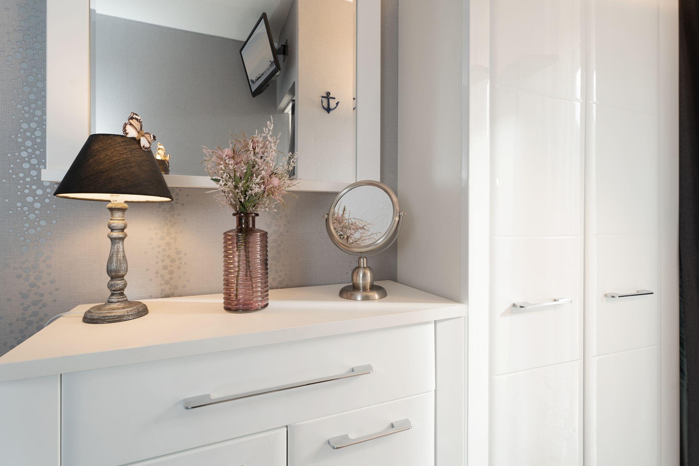 Der Eingangsflur führt in alle weiteren Räume. Von hier aus geht es in den Wohnbereich, der gemütlich mit großzügigem Ecksofa (Liegefläche ca. 125x280 cm), Flachbild-TV und hochwertigen Vitrinenschränken ausgestattet ist. Das separate Schlafzimmer verfügt über ein komfortables Doppelbett (140x200 cm), Kommode, Spiegel, Kleiderschrank und zweitem Flachbild-TV. Auch vom Schlafzimmer aus können Sie direkt auf den sonnigen Balkon treten und morgens gleich nach dem Aufstehen die salzige Seeluft genießen. Das klassische Badezimmer verfügt über Dusche, WC und Waschbecken mit Spiegel. Die separate Küche ist mit Annehmlichkeiten wie Ceranfeld, Backofen, Mikrowelle und Spülmaschine gut ausgestattet. Das Interieur der Ferienwohnung ist liebevoll gestaltet und harmonisch aufeinander abgestimmt. Sowohl vom Wohnbereich als auch vom Schlafzimmer und dem großen, möblierten Südbalkon hat man einen schönen Blick über den Grömitzer Deich auf die funkelnde Ostsee. So fühlt sich Urlaub an!