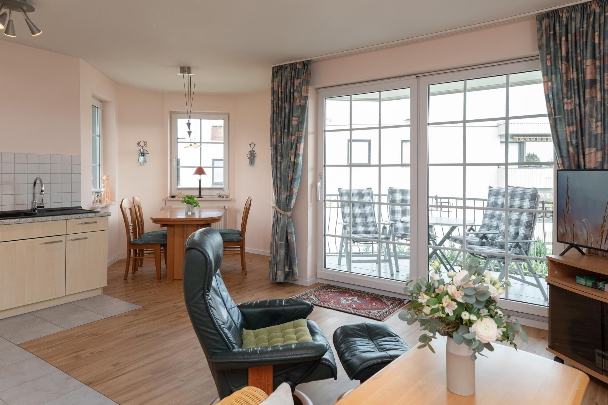 Auf ca. 55 m² Wohnfläche finden Sie reichlich Platz für Erholung und Entspannung. Der gemütliche Wohnraum mit offen gestalteter Küche bildet das Herzstück Ihres Feriendomizils. Ausgestattet mit Spülmaschine, Backofen, Kühlschrank mit Gefrierfach, Mixer, Toaster und vielem mehr, bietet die Küche perfekte Voraussetzungen für einen geselligen Kochabend. Auf Ihrem großzügigen Balkon genießen Sie zahlreiche Sonnenstunden.