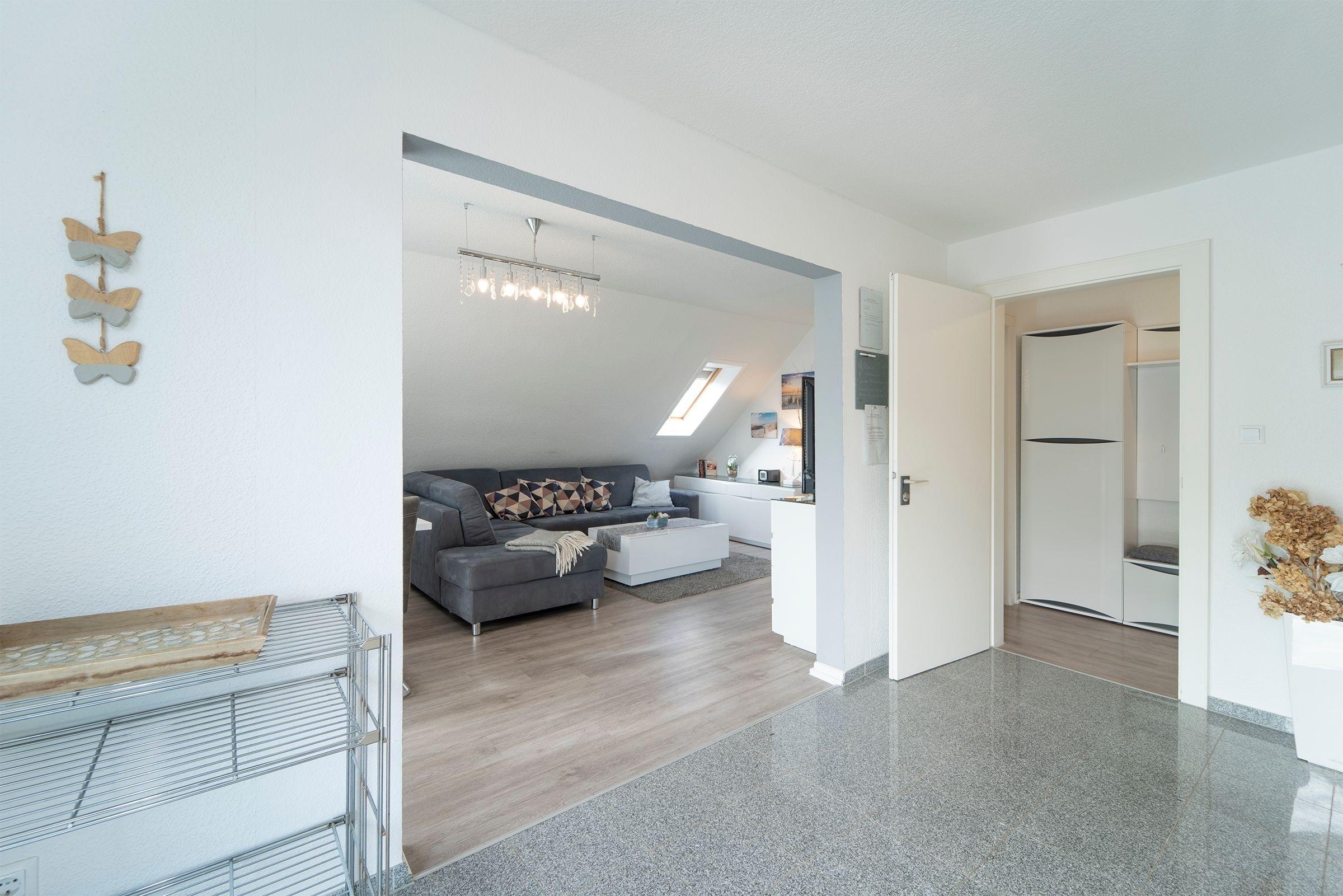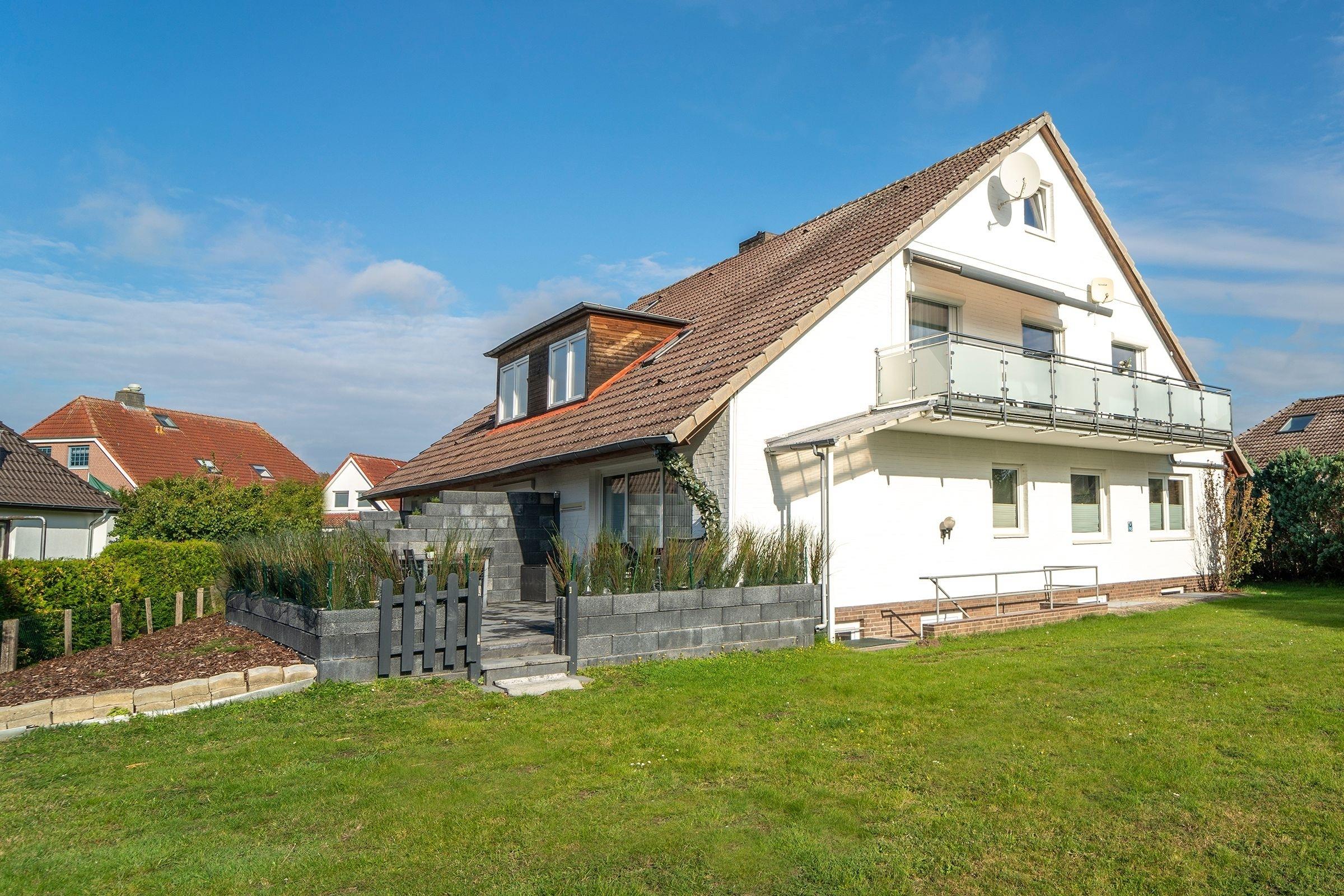 Über eine Eingangstreppe gelangen Sie in das heimelige Ferienhaus mit nur wenigen Wohneinheiten. Nun geht es über die Treppe im Haus in das erste Obergeschoss in Ihre Unterkunft (ca. 57 qm).