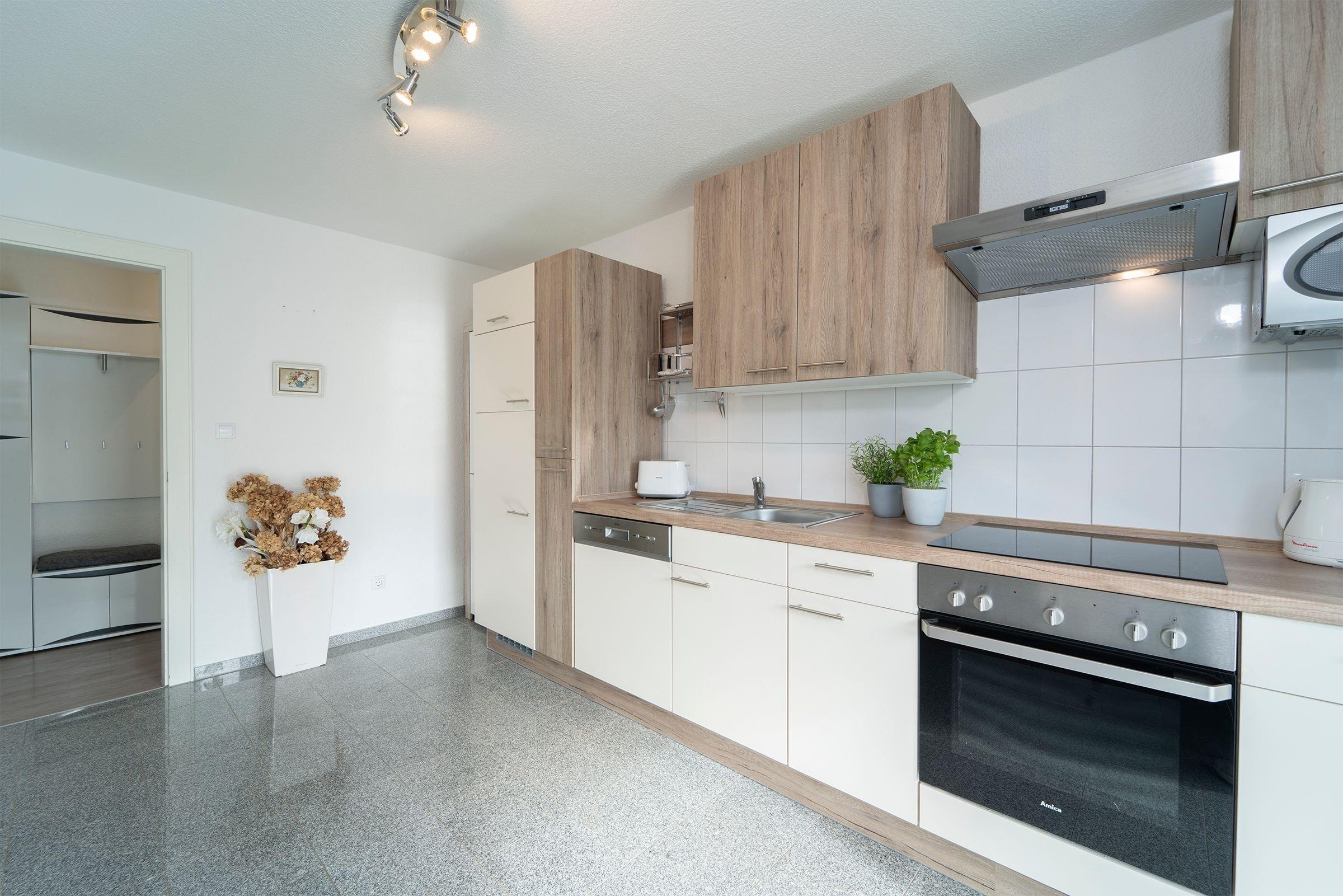 Der nächste Raum ist die große offene Küche, in der Sie sich kulinarisch austoben können. Es stehen Ihnen ein Ceranfeld, ein Backofen, ein Geschirrspüler, eine Mikrowelle und noch viele weitere Ausstattungsmerkmale zur Verfügung. So wird es Ihnen sicherlich gelingen, leckere Mahlzeiten herzurichten. Auch von der Küche aus gelangen Sie wieder auf den großen Balkon der Wohnung. Vom Flur aus, sowie von der zum Wohnbereich hin offenen Küche erreichen Sie nun das Wohn-/ Esszimmer. Sitzen Sie gemeinsam mit Ihren Liebsten am Esstisch beisammen oder aber auch auf der bequemen Schlafcouch (170x200 cm). Egal wo, machen Sie es sich hier gemütlich. Oder aber Sie nutzen auch vom Wohn-/Esszimmer den Zugang zum Balkon und verweilen dort an der frischen Luft mit Blick auf den für die Gemeinschaft nutzbaren Garten. Für das Entertainment sorgen ein Flachbild-TV, DVD-Player und CD-Player. W-LAN steht kostenfrei zur Verfügung. Willkommen in Ihrem Urlaubsdomizil Sonnenseite.