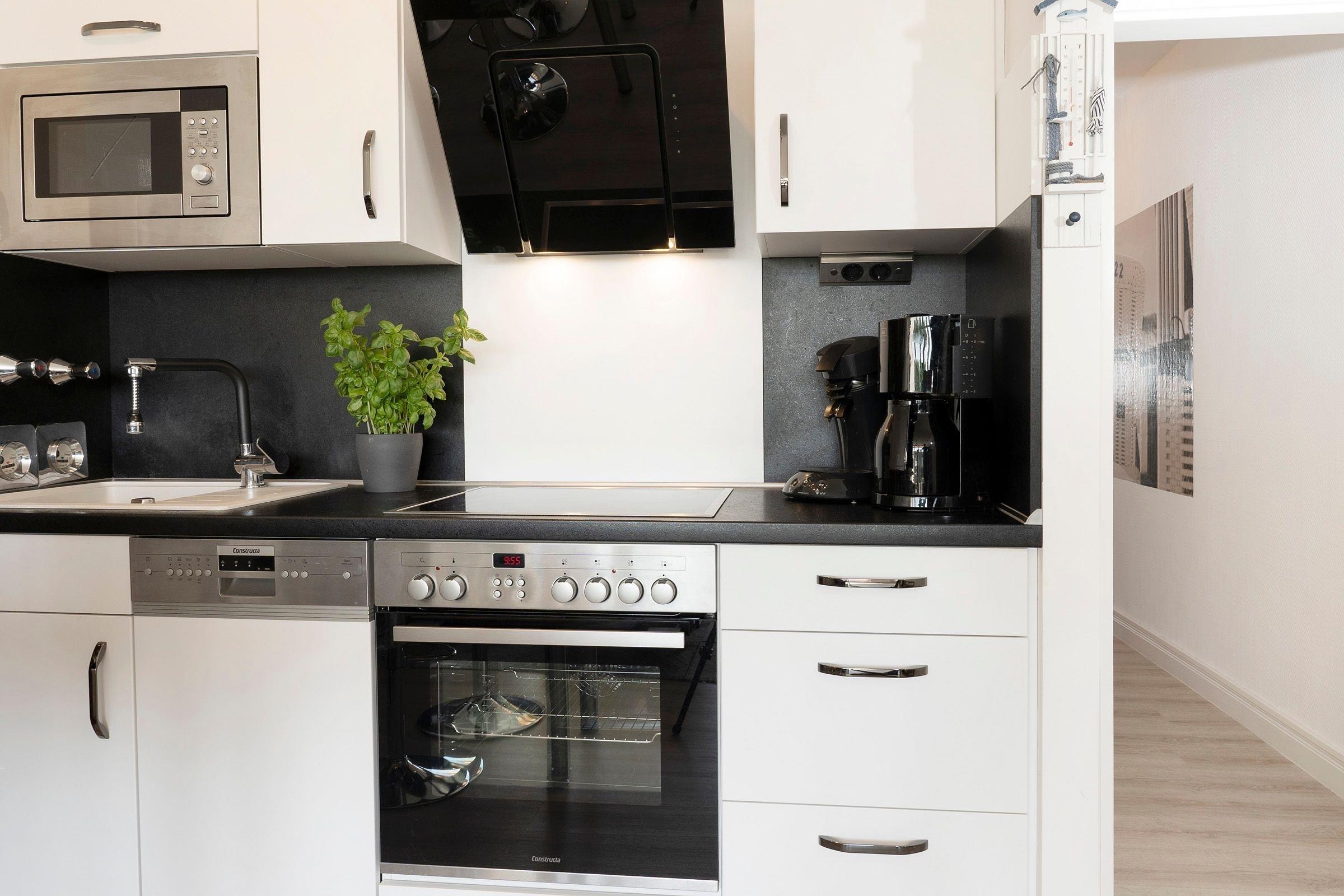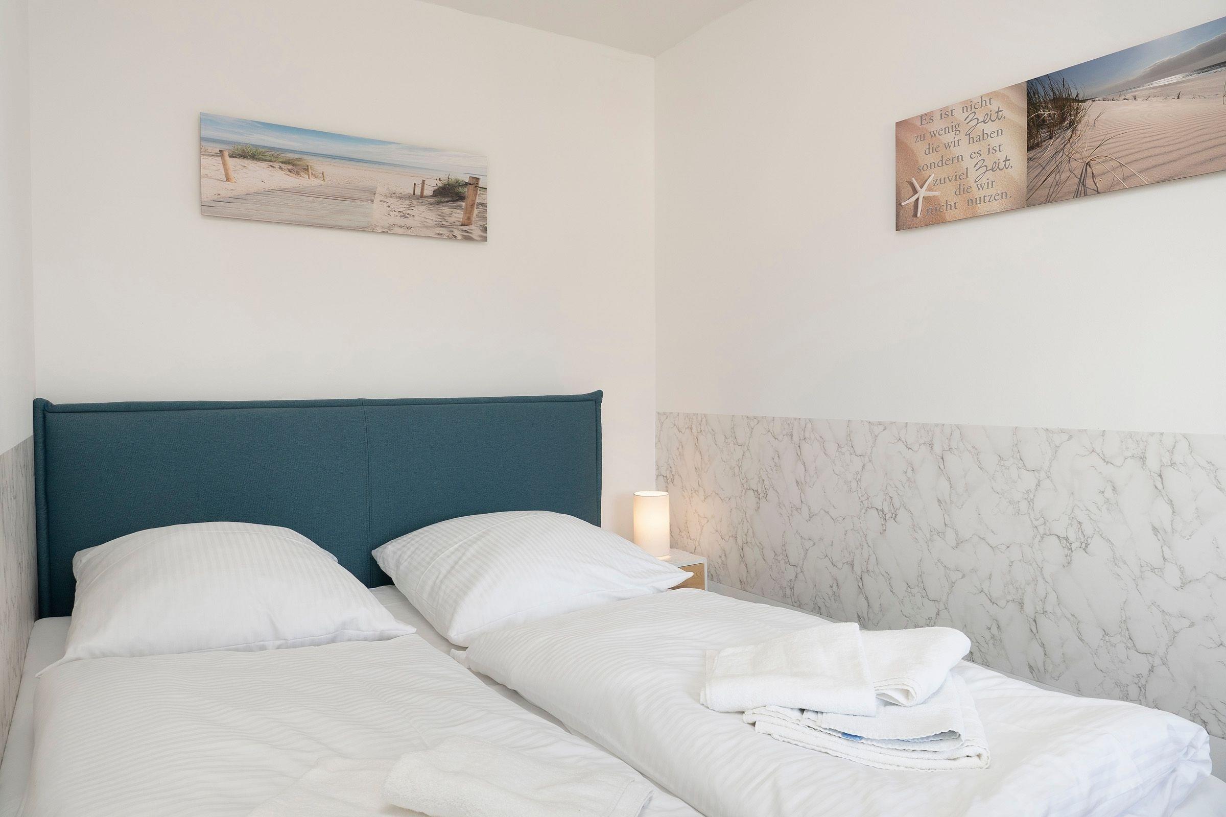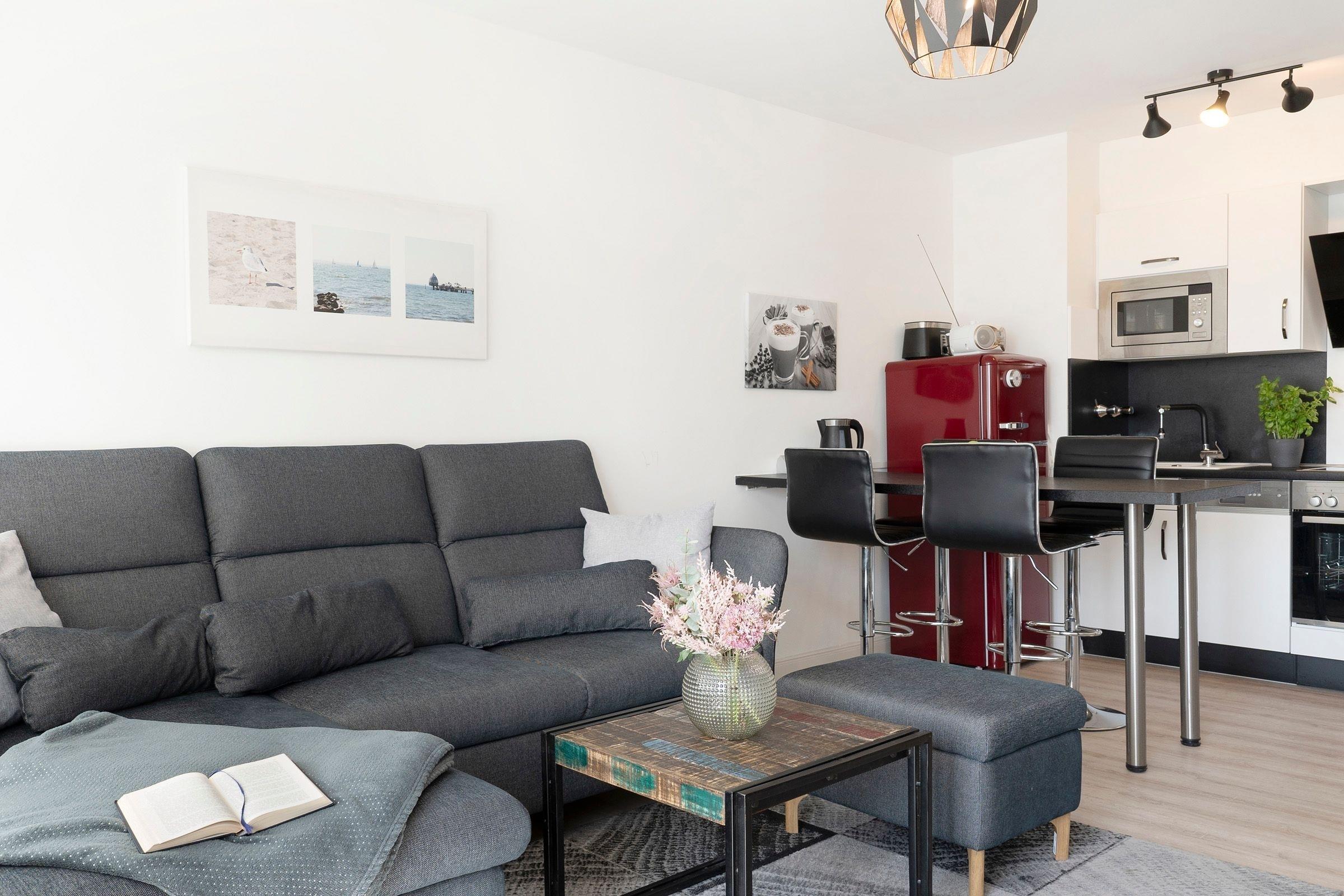 Der geschmackvolle Wohn- und Kochbereich empfängt Sie mit einer hochwertigen und individuellen Ausstattung. Hier können Sie sich eine Auszeit vom Alltag nehmen und auf dem bequemen Sofa abschalten. Dieses lässt sich bei Bedarf in eine gemütliche Schlafstätte (140 cm) für eine Person verwandeln. Hinter der großen, lichtbringenden Fensterfront befindet sich Ihr möblierter Balkon mit saisonal eingeschränktem Meerblick. Die moderne Küche mit Essplatz ist offen gestaltet und perfekt in den Wohnbereich integriert. Sie bietet alles, was Hobby-Koch-Herzen höher schlagen lässt -ein Ceranherd mit Backofen, Spülmaschine, Kühlschrank inkl. Gefrierfach, Mikrowelle, Kaffeemaschine und Senseo Padmaschine, Toaster und Wasserkocher. Bereiten Sie problemlos Ihre Mahlzeiten zu und genießen Sie gesellige Kochabende. Über einen kostenlosen WLAN-Anschluss streamen Sie Ihre Lieblingsmusik und bleiben mit Ihren Lieben daheim in Verbindung. In einem separaten Schlafzimmer lädt ein komfortables Boxspring-Bett (160x200cm, Einstieg von einer Seite und über Fußende) mit TV-Gerät und verdunkelnden Außenrollos zu erholsamen Nächten ein. Im Flur befindet sich ein geräumiger Kleiderschrank, in dem Ihre Urlaubsgarderobe ausreichend Platz findet.
